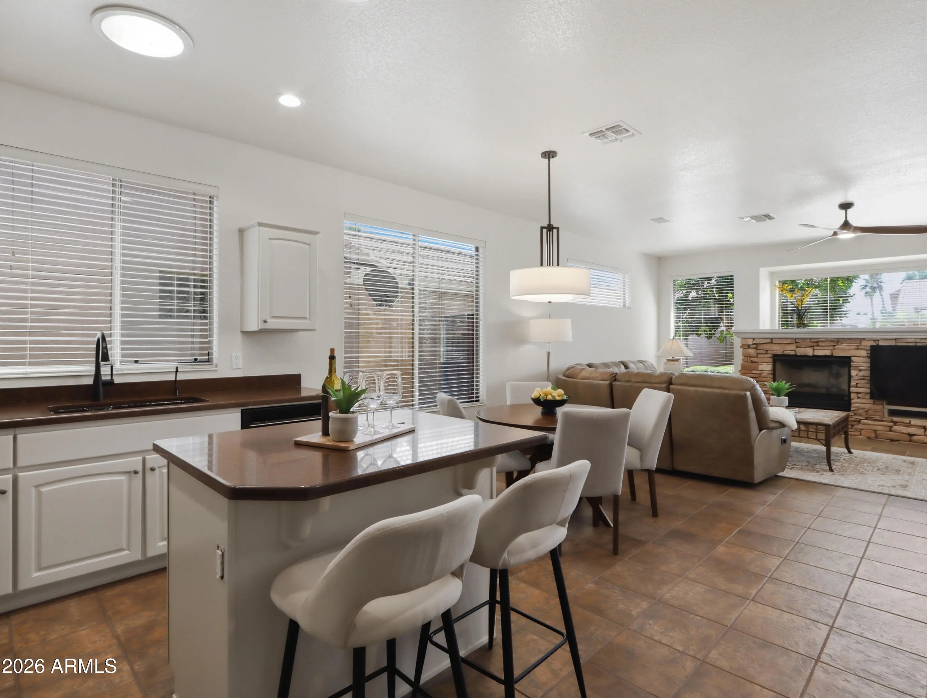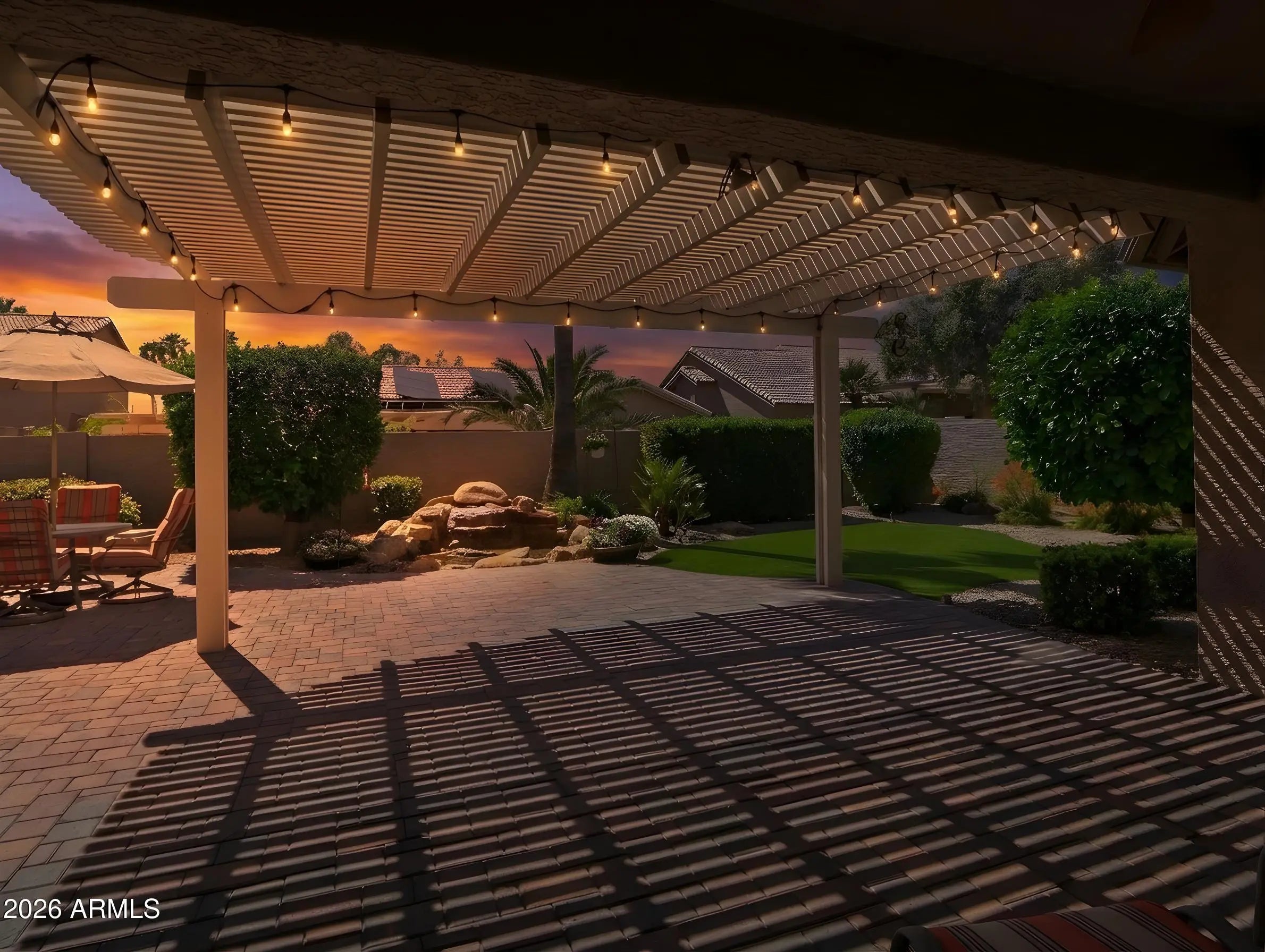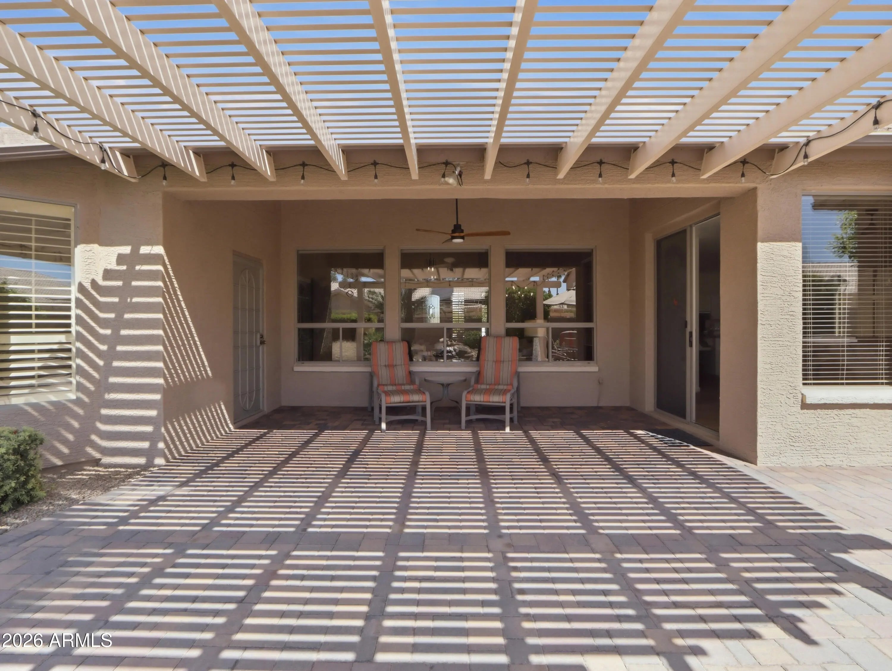 This exceptional three-bedroom Sonoma model in Eagles Nest at PebbleCreek blends elegance, comfort, and resort-style living. A striking front elevation, paver driveway, and welcoming entry lead to light-filled interiors with soaring ceilings and seamless indoor-outdoor flow. The updated kitchen features granite countertops, refreshed cabinetry, and ample storage, opening to spacious living areas with a custom rock-accented fireplace and walls of glass. The private primary suite offers a sitting area, spa-inspired bath, and walk-in closet, while two additional bedrooms add flexibility. Outside, a south-facing backyard oasis features a paver patio, water feature, BBQ, outdoor fireplace, and mature citrus trees--perfect for relaxing or entertaining. This particular Sonoma model presents a rare opportunity to own an exceptional home in the highly sought-after Eagles Nest at PebbleCreek, an award-winning resort community. Thoughtfully upgraded and meticulously maintained, this residence offers the perfect blend of refined comfort and effortless resort-style living. From the moment you arrive, the striking front elevation sets the tone for what awaits. Elegant driveway pavers, a spacious three-car garage, and a welcoming entryway create a memorable first impression. Step inside to soaring ceilings and an abundance of natural light that immediately draws your eye through the home to the beautifully designed, resort-style backyard beyond. The grand living space seamlessly blends indoor and outdoor living, opening to expansive views of the south-facing backyard--your own private tropical oasis. Anchored by a stunning water feature, the setting evokes a sense of tranquility and offers a peaceful retreat right at home. The expansive covered patio serves as a true centerpiece, ideal for relaxing, dining, or entertaining while enjoying Arizona's year-round sunshine. As the day winds down, illuminate the gas lanterns and gather around the outdoor fireplace to take in breathtaking sunset views--creating the perfect setting for cozy desert evenings. Inside, fresh interior paint, modern lighting, and ceiling fans throughout create a stylish, truly move-in-ready environment. The thoughtfully updated kitchen features refreshed cabinetry, granite countertops, and abundant storage, all within an open layout that flows effortlessly into the main living area--perfect for both everyday living and entertaining. The adjacent family room is filled with natural light from tall glass doors that open to the patio, offering a warm and inviting space for gatherings. A gas fireplace with custom rock accents serves as a beautiful focal point, enhancing the home's cozy and welcoming ambiance. The luxurious primary suite is a true retreat, complete with a comfortable sitting area and oversized windows with plantation shutters. The spa-inspired ensuite bath features a large tile-surround shower, dual-sink vanity, a dedicated makeup space, and a custom walk-in closet with extensive built-ins--delivering both elegance and functionality. The second bedroom is generously sized with its own walk-in closet, while the third bedroom offers flexible space ideal for guests, hobbies, or a home office. Both are conveniently served by a well-appointed hallway bath with a tub. Step outside once more to the resort-style backyard--truly the showstopper of the home. With ideal southern exposure, the extended custom paver patio, tranquil water feature, and mature, fruit-bearing citrus trees--including lemon, orange, and grapefruit--create a setting that is as beautiful as it is enjoyable. A built-in bar and BBQ grill elevate the outdoor experience, making it perfect for entertaining or simply unwinding in your own private retreat. Additional highlights include a three-car garage with dedicated golf cart parking, built-in storage cabinetry, and a workbench--ideal for hobbies or projects. Rain gutters add an extra layer of convenience and peace of mind. Beyond the home itself, enjoy a friendly and welcoming neighborhood that fosters connection, activity, and the very best of resort-style living.