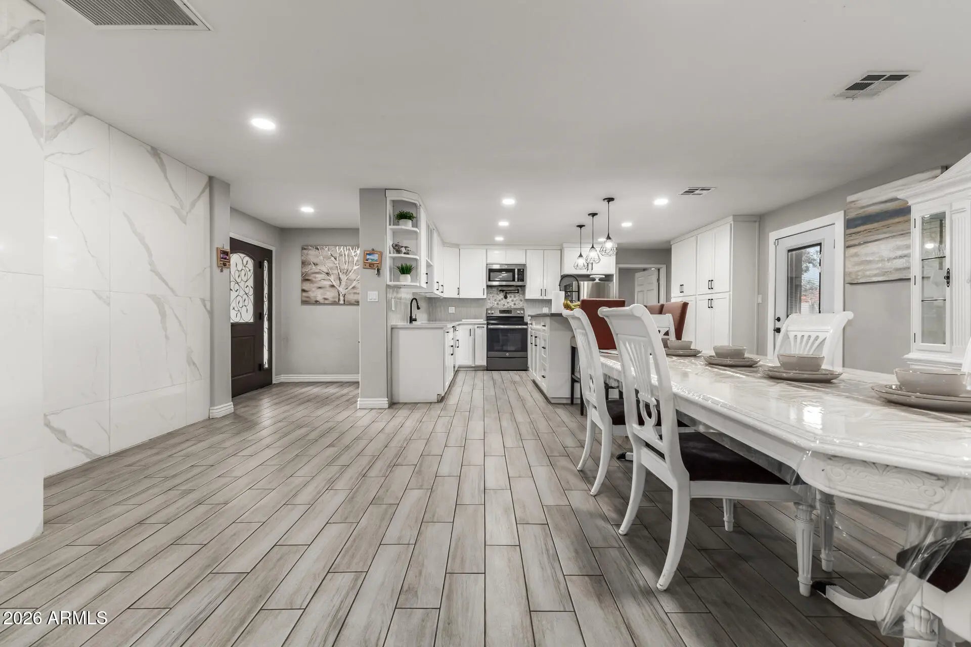 Fantastic 5-bed, 3-bath home with POOL in Phoenix! A low-care front yard, front porch, RV gate & parking, and 2 carport spaces are just the beginning. The inviting interior features a neutral palette, recessed lighting, and wood-look tile flooring t/out. You'll love the seamlessly flowing open layout! The impressive kitchen boasts SS appliances, quartz counters, tile backsplash, white shaker cabinetry, and an island w/pendant lighting over the breakfast bar. Versatile den can be an office or formal dining room! Large main bedroom has a vaulted ceiling and an ensuite w/dual sinks. Another bedroom with its private bathroom, ideal for the guests. Laundry room with ample cabinets. Enjoy the backyard with a covered patio, storage shed, multiple seating areas, and a sparkling pool! Owner/Agent
