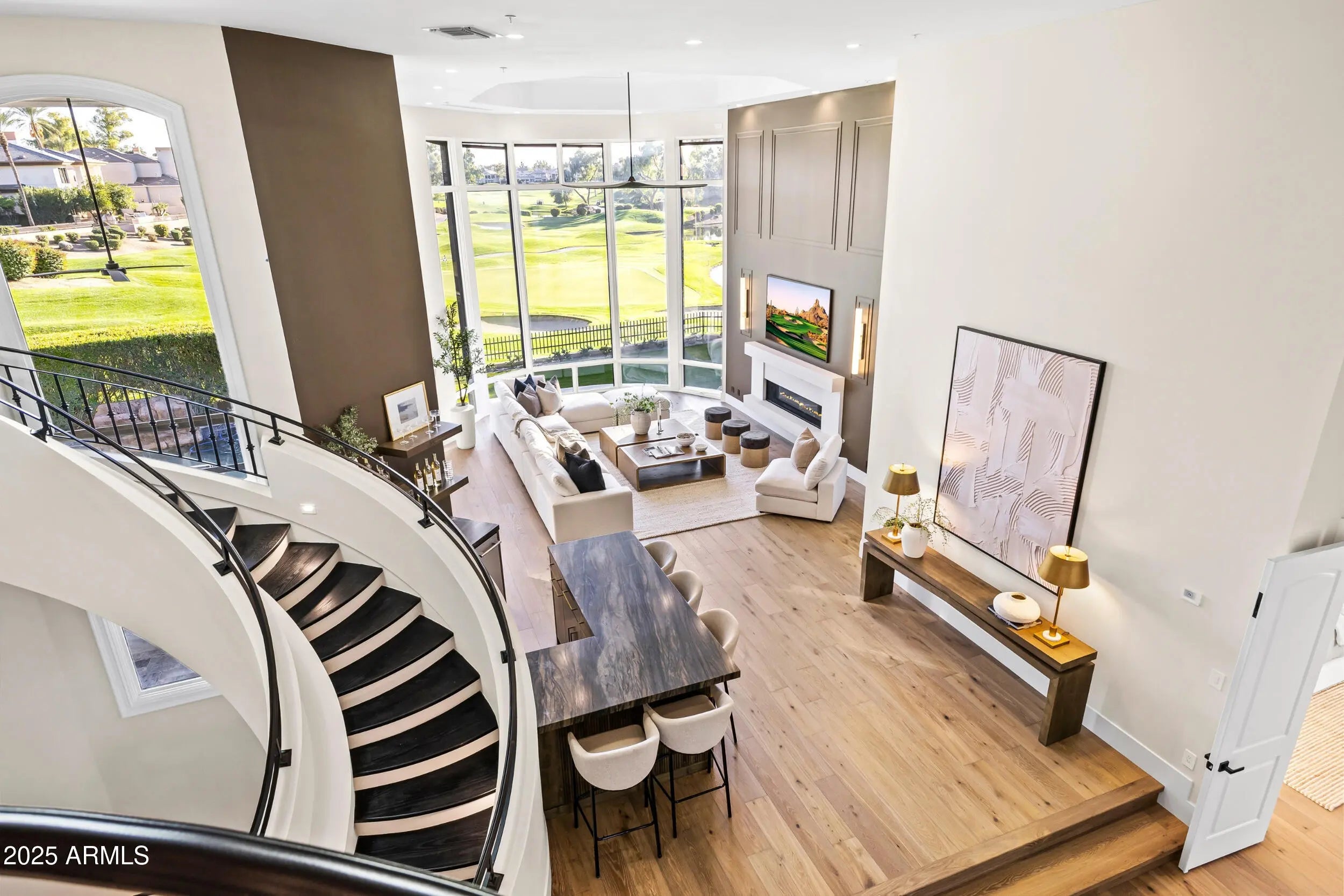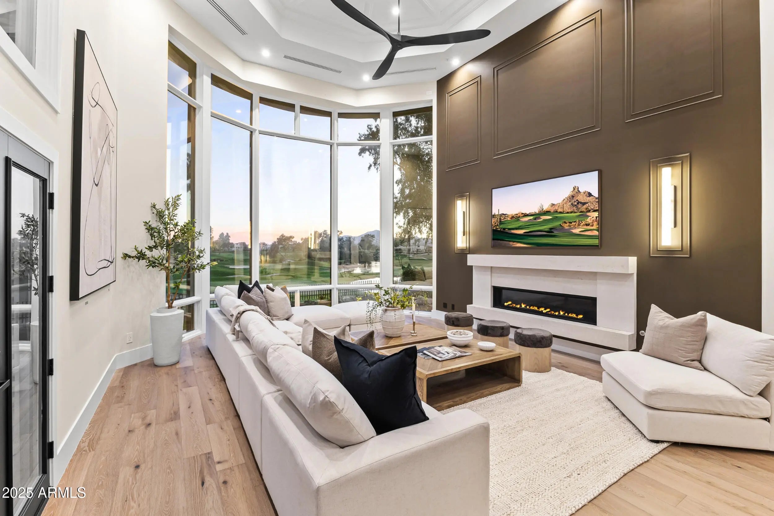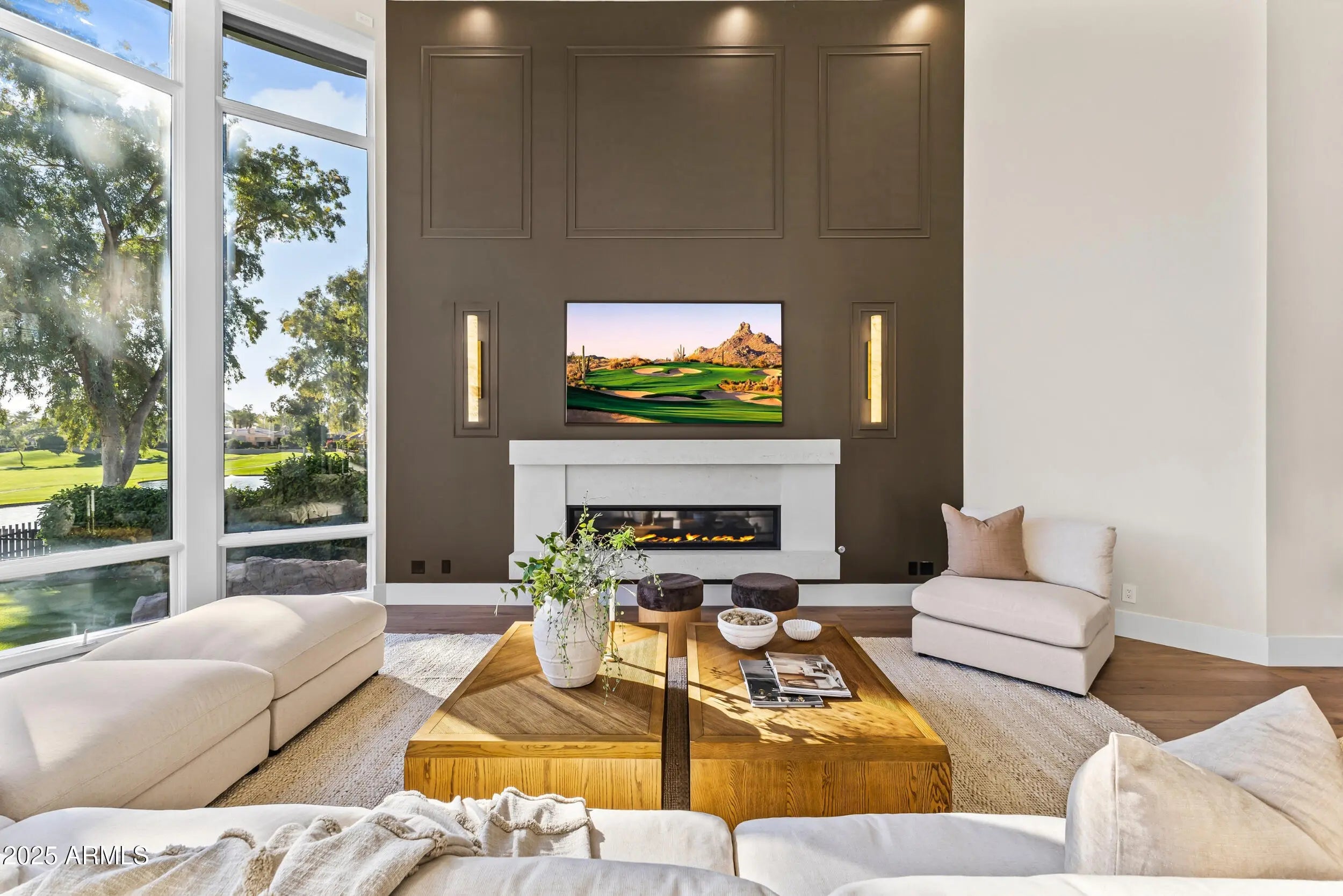 Inside GAINEY RANCH sits a fully transformed 7,653sq ft estate with UNOBSTRUCTED, front-row panoramas of Camelback Mountain and the 7th & 8th holes of the Lakes Golf Course. Clean lines guide you through warm light, calm flow, and refined finishes. The kitchen brings rift-cut oak cabinets, Taj Mahal stone, Thermador appliances, and contemporary design. The main-level suite provides a stone tub, rain shower, dual vanities, and a fireside nook. Four en-suite rooms support guests with ease. The lower level adds a gym with commercial grade flooring, mirrored walls and a tiered theater with Italian leather seating. 24/7 guarded privacy, Estate Club amenities (tennis, fitness, pool, events), and optional Gainey Ranch Golf Club membership—all minutes from Scottsdale's finest dining & shopping.