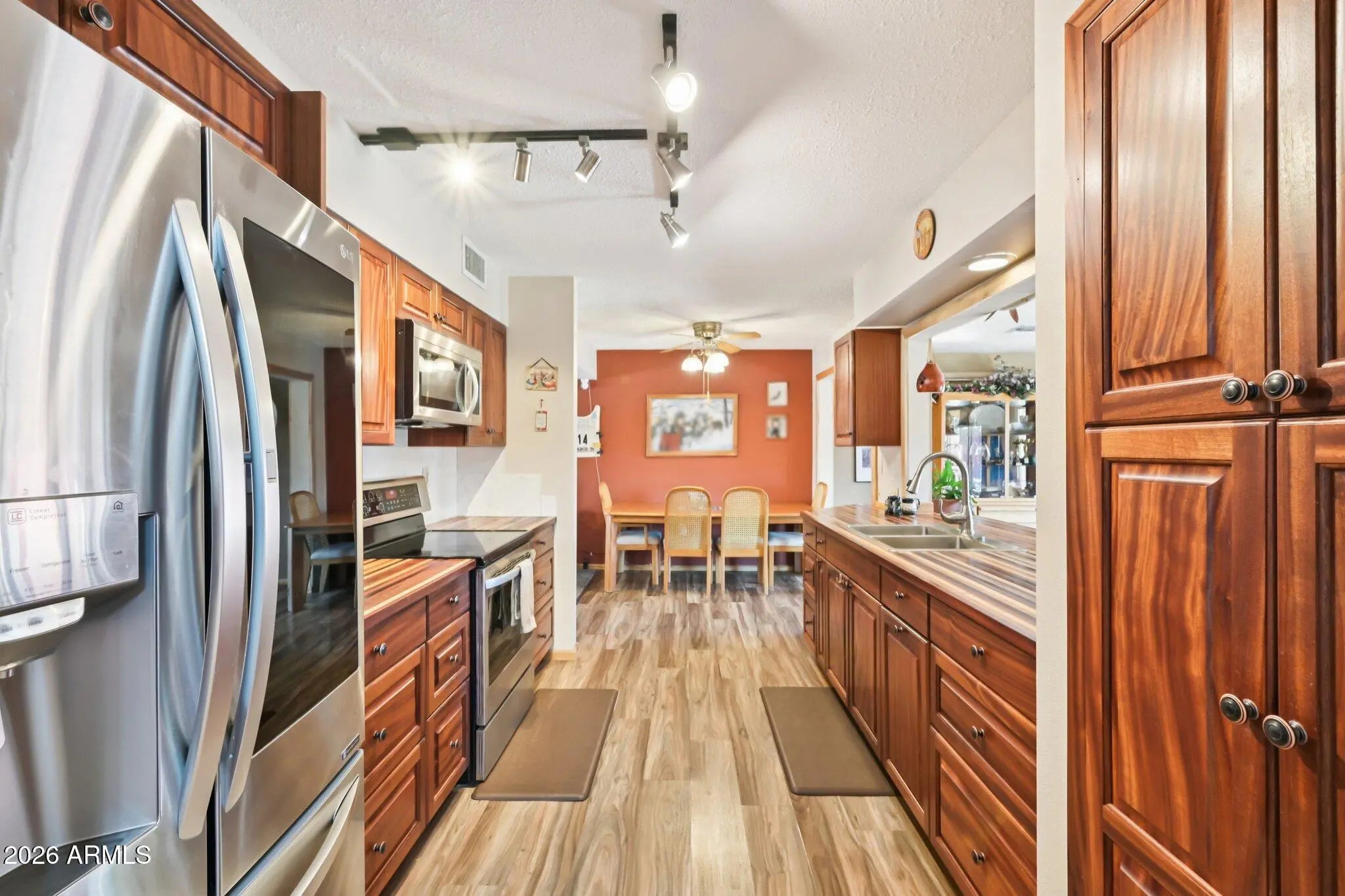 You'll love entertaining in this backyard, featuring a heated pool, sun deck, covered patio, and turf areas ideal for putting or pets. Inside, the primary suite includes a bonus walk-in closet for added storage. The home showcases numerous upgrades, including woodgrain luxury plank vinyl and tile flooring with carpet in the bedrooms, custom cabinetry throughout, and distinctive Alaskan birch doors and trim. The kitchen stands out with a custom countertop crafted from Alaskan birch, sapelli, and cherry. A spacious family room addition provides extra living and entertaining space, complete with a breakfast bar. The oversized garage offers ample room for vehicles, storage, or recreational equipment. Major updates include the roof (2019), HVAC system (2024), and water heater (2022).