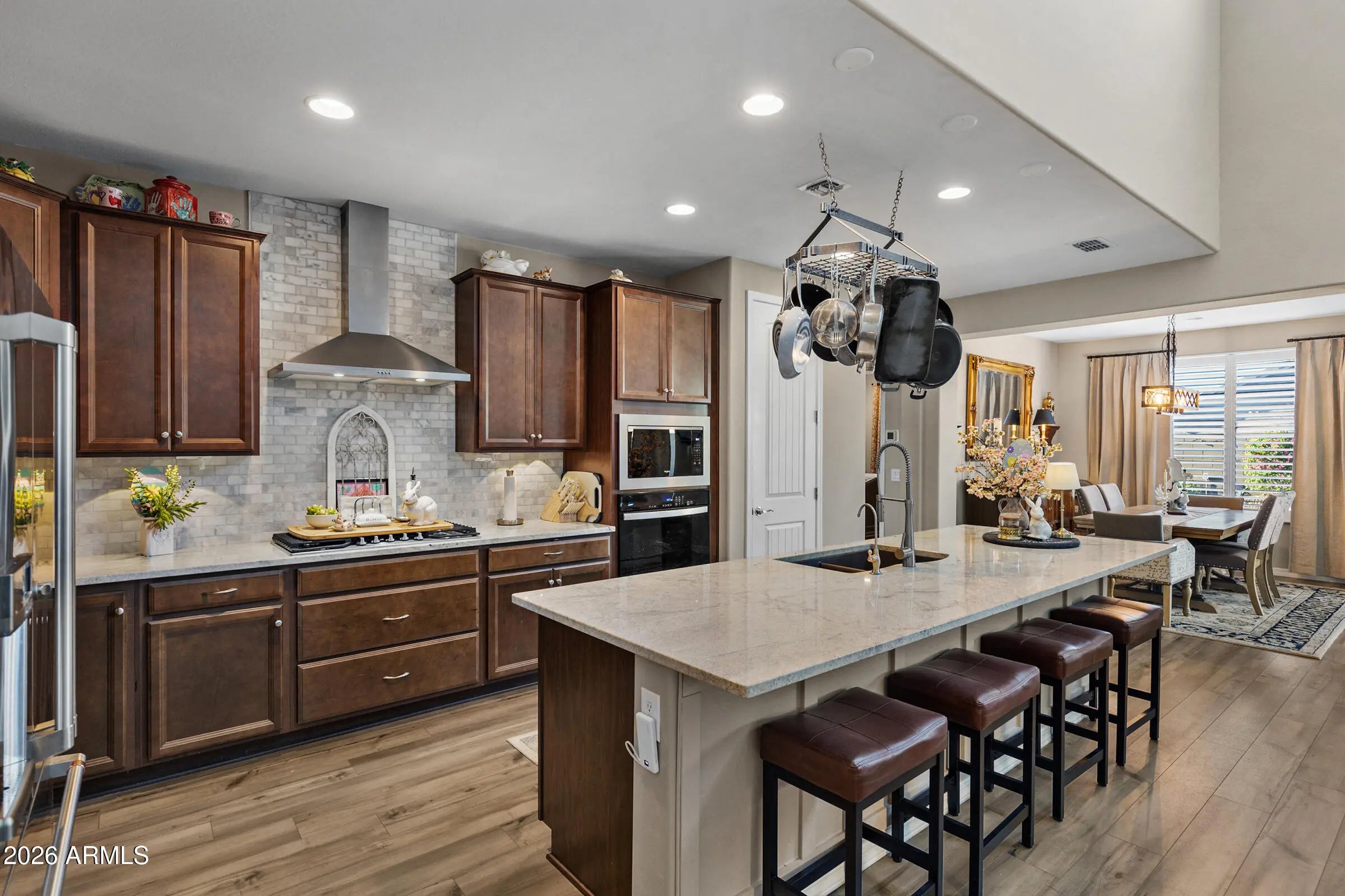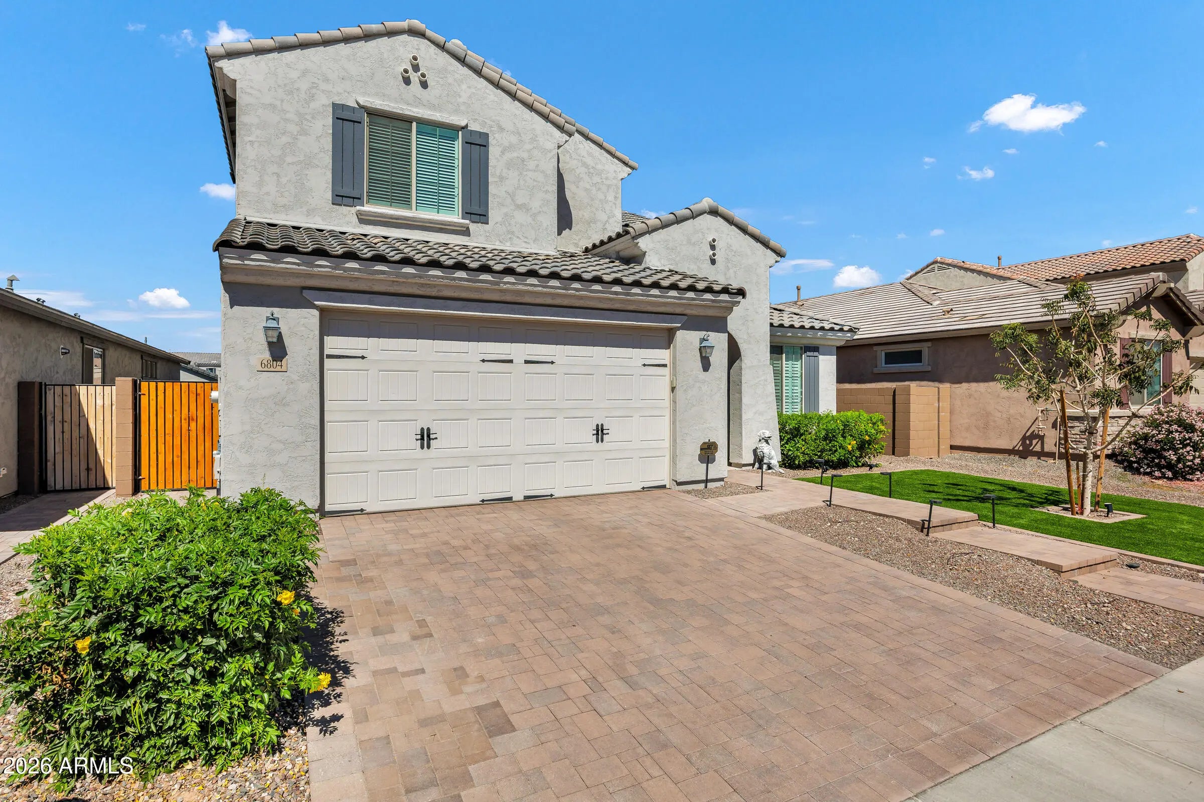 Welcome to this stunning 6 bed + loft / 5 bath Pulte home built in 2023 in the gated community of McClellan Ranch. Offering the feel of new construction without the wait, this move-in-ready home features high-end finishes, thoughtful upgrades, and a modern, neutral palette designed to impress from the moment you walk in. The front yard features low-maintenance artificial turf, enhancing curb appeal while keeping upkeep simple. Step inside to soaring two-story ceilings, expansive open-concept living spaces, and abundant natural light. The great room flows seamlessly into the chef's kitchen, creating the perfect setup for entertaining. The kitchen features granite countertops, a large center island with breakfast bar seating, designer tile backsplash, a gas cooktop with hood, stainless steel appliances, and a walk-in pantry. Throughout the home, you'll find luxury vinyl plank flooring, tile, and plush carpet in the right places, along with designer lighting and ceiling fans that elevate both style and comfort. The spacious downstairs primary suite offers a true retreat with dual vanities, a walk-in shower with bench seating and dual showerheads, including a rainfall feature, a private toilet room, and a generous walk-in closet. Two additional bedrooms are conveniently located on the main level. Upstairs, a versatile loft provides a flexible living space ideal for a media room, home office, or game room. Three additional bedrooms complete the second level, including one with its own ensuite bath. The backyard is designed for Arizona living and entertaining, featuring a covered patio, custom gazebo, fire pit, pavered seating areas, a grass lawn, and accent lighting that creates an inviting atmosphere for entertaining guests at night. Additional highlights include a downstairs laundry room with extensive cabinetry, a tankless water heater, a water softener, and a 2-car garage with overhead storage racks. Located in the gated community of McClellan Ranch, residents enjoy a quieter lifestyle in the South Mountain corridor, with convenient access to hiking and biking trails, scenic desert landscapes, and quick connectivity to Downtown Phoenix, Sky Harbor Airport, and major freeways. This is the perfect blend of newer construction, privacy, and accessibility, making this one of Laveen's most desirable communities.