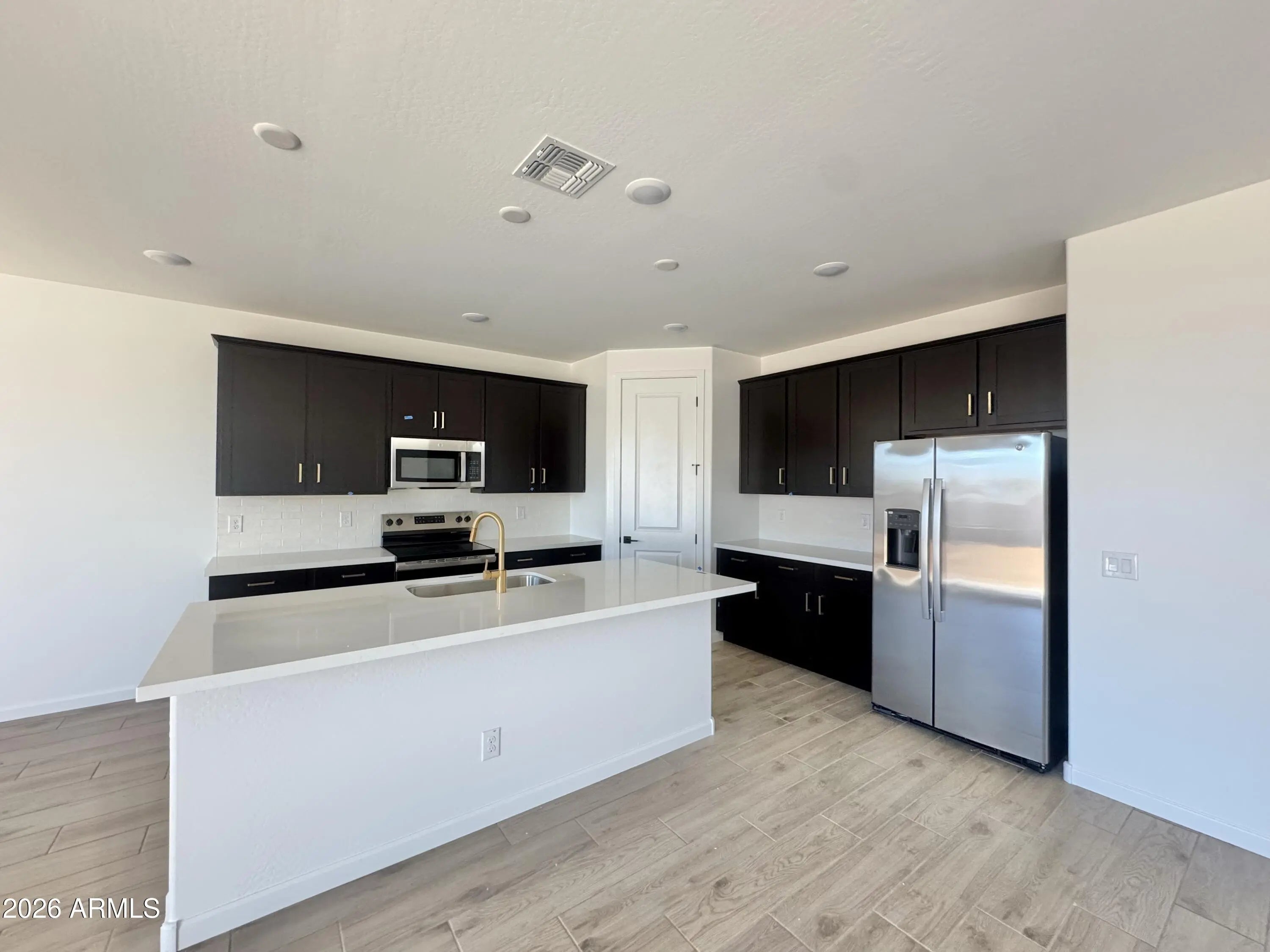 Discover the highly sought-after Larkspur floorplan, offering 1,949 sq. ft. of thoughtfully designed living space tailored for today's modern lifestyles. This exceptional single-story home features 3 spacious bedrooms, a versatile den, and 2.5 bathrooms, seamlessly blending functionality with comfort. The expansive great room is highlighted by soaring 8' interior doors and a stunning 4-panel center sliding glass door, creating a seamless transition between indoor and outdoor living. Step outside to a generously sized backyard--perfect for entertaining, play, or simply relaxing under the Arizona sun. At the heart of the home is a chef-inspired kitchen equipped with 42'' Expresso Shaker cabinets accented by sophisticated Champagne Bronze hardware, elegant Biancone quartz countertops, and a striking 2 x 10 brick-pattern tile backsplash. A complete suite of GE stainless steel appliances--including an electric range, microwave, dishwasher, refrigerator, and a white washer and dryer--adds everyday convenience and style. Durable 8 x 36 plank tile flooring spans the main living areas, while plush carpeting in the bedrooms and Study enhances warmth and coziness. Additional turnkey features include blinds, a soft water loop, and garage door openers. Curb appeal is unmatched with paver accents at the driveway and entryway, completing the home's welcoming exterior. Don't miss your opportunity to own the Larkspur at Stonebridge Manor--where smart design and effortless living come together beautifully!