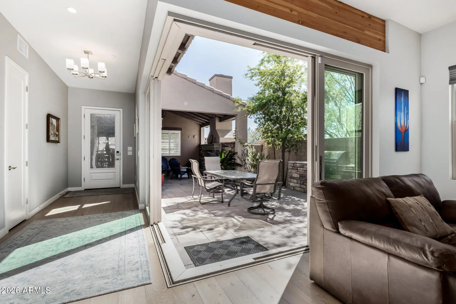 Tucked inside the gated Eastwood community, this single-level, step-free home sits on a premium lot near the community pool. Thoughtfully updated and low-maintenance, it's simple to lock up and leave. The open floor plan features wood floors, a modern kitchen with granite countertops, center island, and stainless steel appliances, plus a flexible den. The interior courtyard -- entered through walls of glass -- has a gas fireplace, built-in BBQ, and patio space perfect for entertaining. The backyard is finished with pavers and desert landscaping. Two bedrooms, two baths, a den, and a two-car garage in one of Carefree's most sought-after neighborhoods.