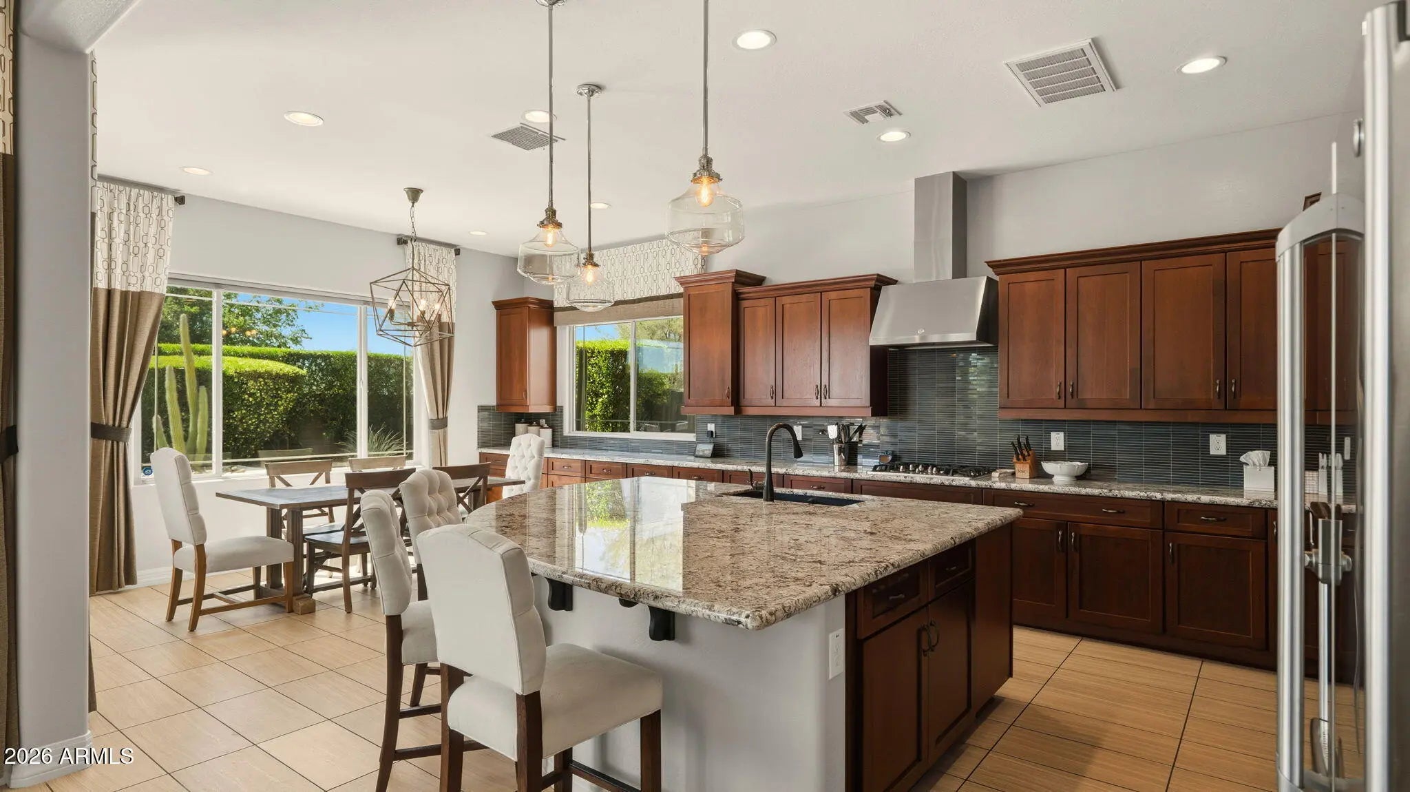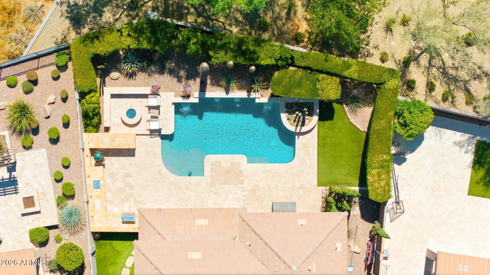 Desert Ridge gated community | Former model home with nearly 4,000 sf, 5BR/4BA and upgraded finishes throughout. Main-floor bedroom/full bath plus dedicated office. Chef's kitchen built for real use with huge island, extensive cabinetry, and walk-in pantry. Upstairs offers an entertainment room, split bedroom layout, and convenient laundry. The primary suite features dual vanities, walk-in shower, and oversized closet. Backyard is fully built out with private pool, fire pit, and built-in BBQ. Community amenities include heated pool, clubhouse, and fitness center. Positioned in one of North Phoenix's most connected locations, minutes to Desert Ridge Marketplace + High Street, with Loop 101 access, top-rated schools, hiking, premier golf, and the energy of Scottsdale and Cave Creek nearby. Where the details start to matter...the first impression builds as you move through the home. A custom iron and glass front door sets the tone, while just around the corner, a private courtyard reveals itself, anchored by expansive sliding doors that create a natural connection between indoor and outdoor living. The main living areas are finished with tile throughout, offering both durability and a clean, cohesive look that holds up to everyday life. The layout is designed for how people actually live. Spaces are defined without feeling closed off, allowing daily routines and guests to coexist without overlap.The office is thoughtfully positioned with double glass doors, providing privacy without feeling disconnected. The main-level bedroom serves multiple generations or visiting relatives who prefer to avoid stairs. The kitchen wasn't designed for show, extensive cabinetry actually holds things, the gas cooktop handles serious meal prep, and the walk-in pantry accommodates real grocery runs. Upstairs, the entertainment room adds flexibility, whether for media, study, or a secondary living space, while the bedroom separation supports both privacy and function. The laundry is exactly where it should be, upstairs, complete with built-ins and counter space. Executive height vanities with granite countertops in all baths, plus custom tiled shower surrounds. Out back, with no homes directly behind, the setting feels more open and private than most. Travertine pavers and natural stone surround the pool and water feature, complemented by low-maintenance turf and an elevated gas fire pit that naturally becomes the gathering point in the evenings. The part many buyers overlook? The time and effort already saved. No waiting on contractors, no phased projects, no uncertainty. This home is complete, the decisions are made, and the home is ready to be used as intended from day one!