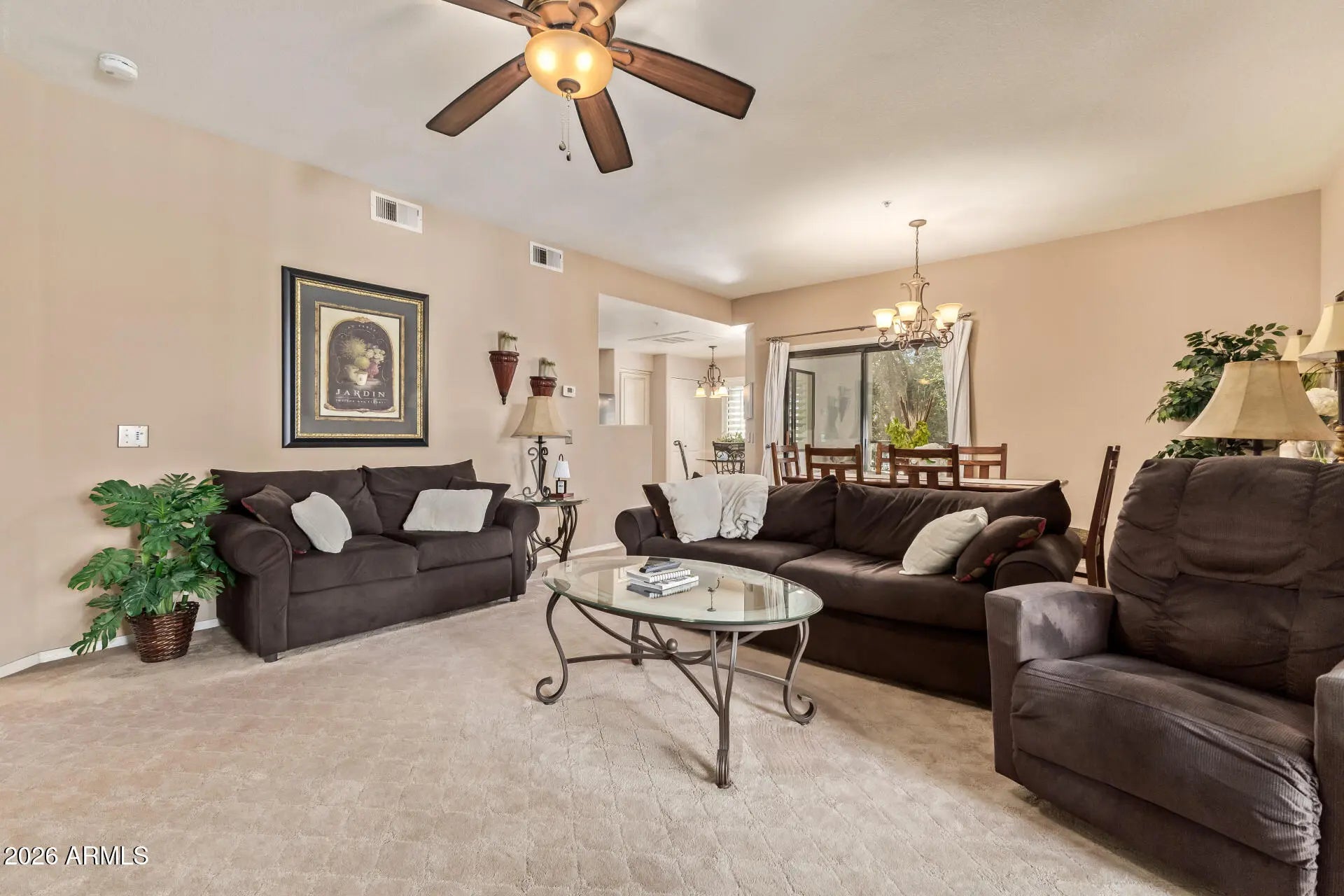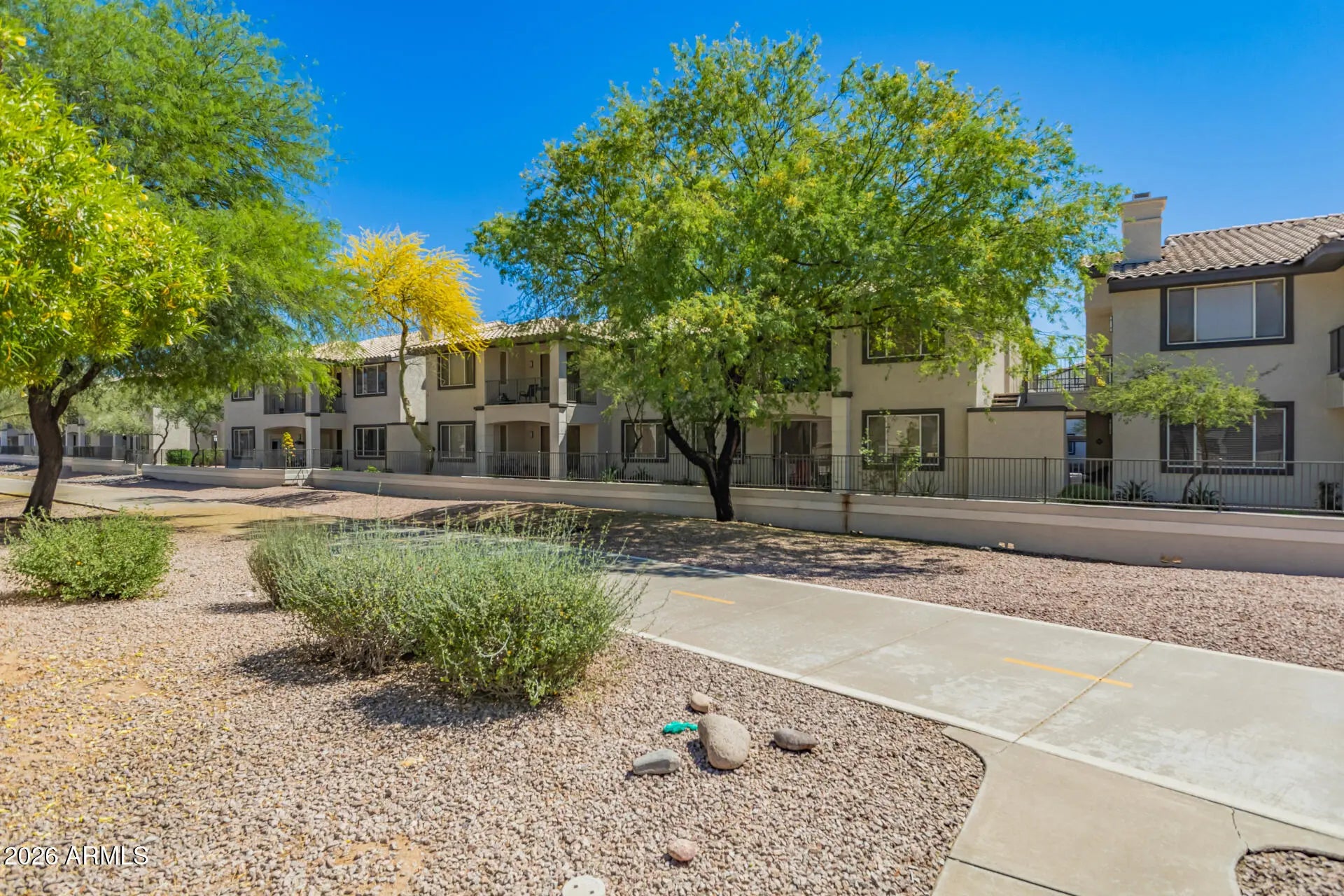 You must see this condo, a fantastic spot in a highly desirable location very close to shopping, restaurants, WestWorld, TPC Scottsdale and the 101 Loop. This well loved home offers a bright, open layout with plantation shutters, tile flooring, and like new carpet. Multiple balconies overlook the community pool, while mature trees provide shade and privacy. The updated kitchen features a tile backsplash, granite countertop, and built in appliances. A den or office with double doors can serve as a guest room or possible third bedroom. The primary suite includes a private bath, walk in closet, and balcony access. The garage is just outside the front door for easy access.