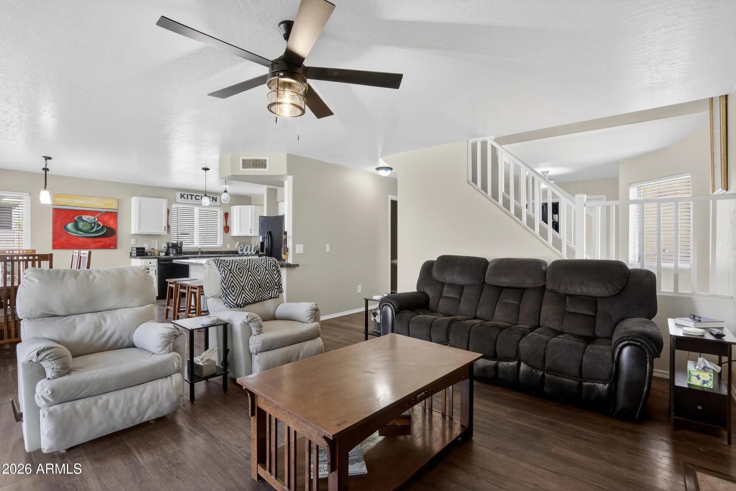 This is the kind of home that just feels right the second you walk in. Located in the heart of Litchfield Park. The main level is open and inviting, with the kitchen flowing into the living space and a cozy gas fireplace that anchors the room. A downstairs office with doors and windows gives you flexibility for a true work space or a 5th bedroom. Upstairs opens up with vaulted ceilings throughout, creating an airy feel across the large loft and all bedrooms, with brand new flooring and stairs adding a fresh, updated touch. The primary suite offers dual closets and a comfortable retreat at the end of the day. Out back, you will find a large grassy yard with mature landscaping, perfect for relaxing or hosting without feeling boxed in. All set in a location that keeps you close to everything. Located in a highly convenient Litchfield Park pocket near Camelback and Litchfield Rd, everyday essentials are just minutes away including Frys, dining, coffee, and quick access to gas and shopping. Enjoy weekends on the nearby Wigwam golf courses or spend an evening in Downtown Litchfield Park with its local restaurants, charm, and community feel. This location offers the perfect balance of convenience and lifestyle without sacrificing a quiet neighborhood setting.
