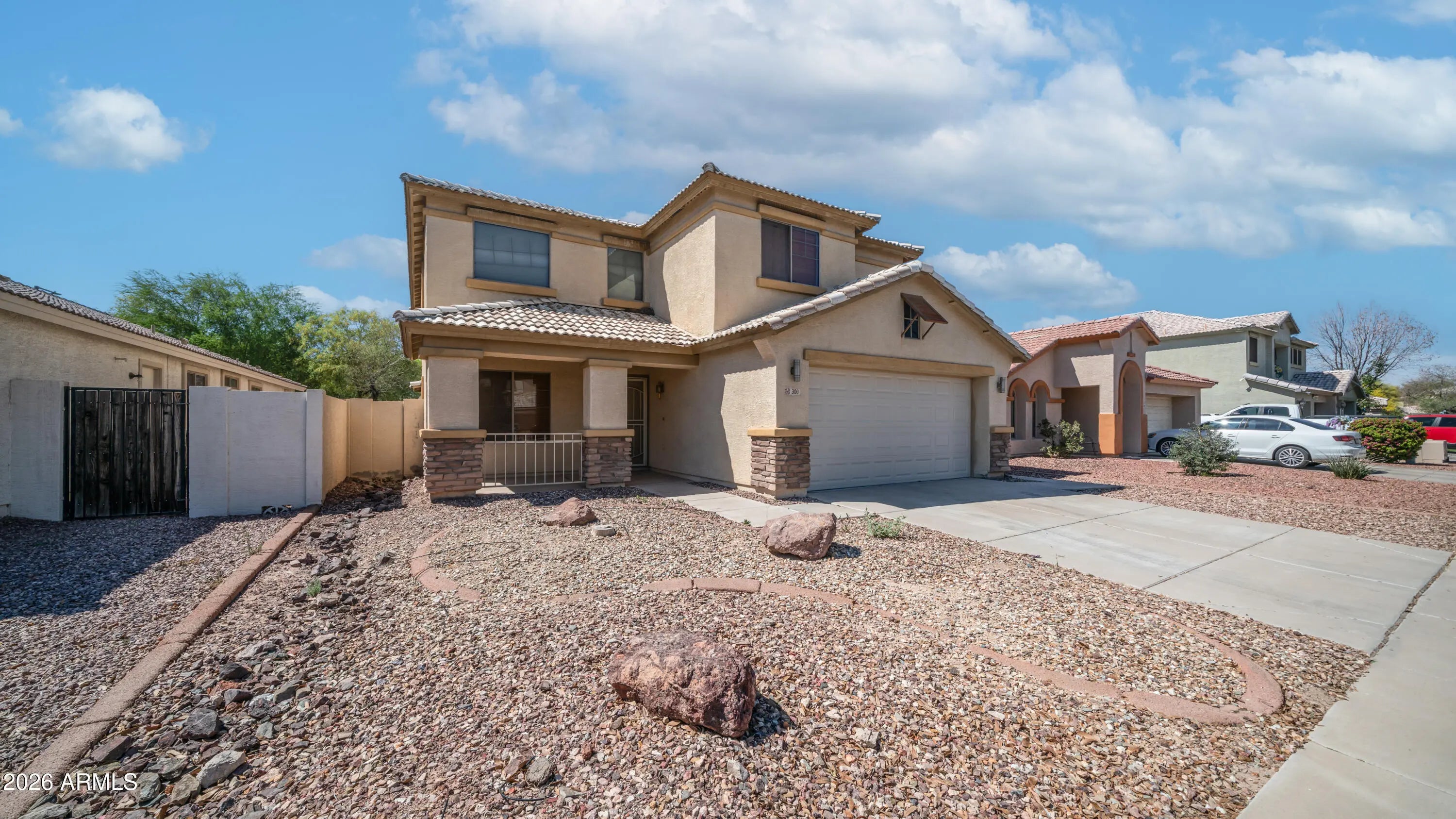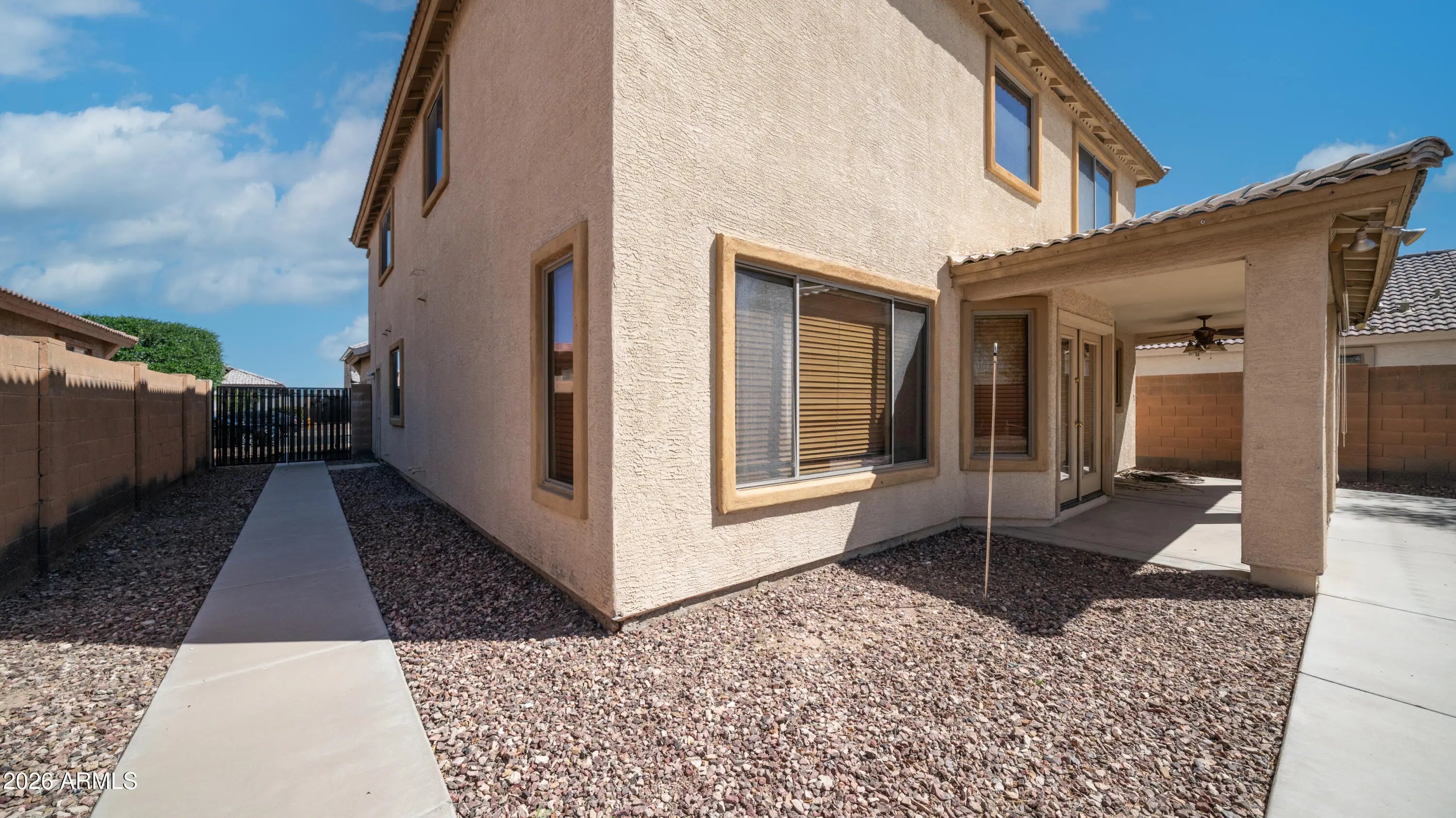Welcome home to this beautiful 4-bedroom, 3-bathroom, 2,323 sq ft gem in Goodyear's sought-after Centerra community! Fresh paint. The thoughtfully designed two-story floor plan features a rare and highly desirable main-level bedroom and full bath--perfect for guests, a home office, or multi-generational living. Entertaining is a breeze in the spacious, open-concept great room and kitchen, complete with upgraded maple cabinets, crown molding, stunning granite countertops, a center island, and stainless steel appliances. Upstairs, relax in the expansive primary suite featuring a double vanity and a separate soaking tub and shower. Step outside to a fantastic, spacious backyard complete with a convenient RV gate and plenty of room for all your toys. Don't miss out on this incredible home.