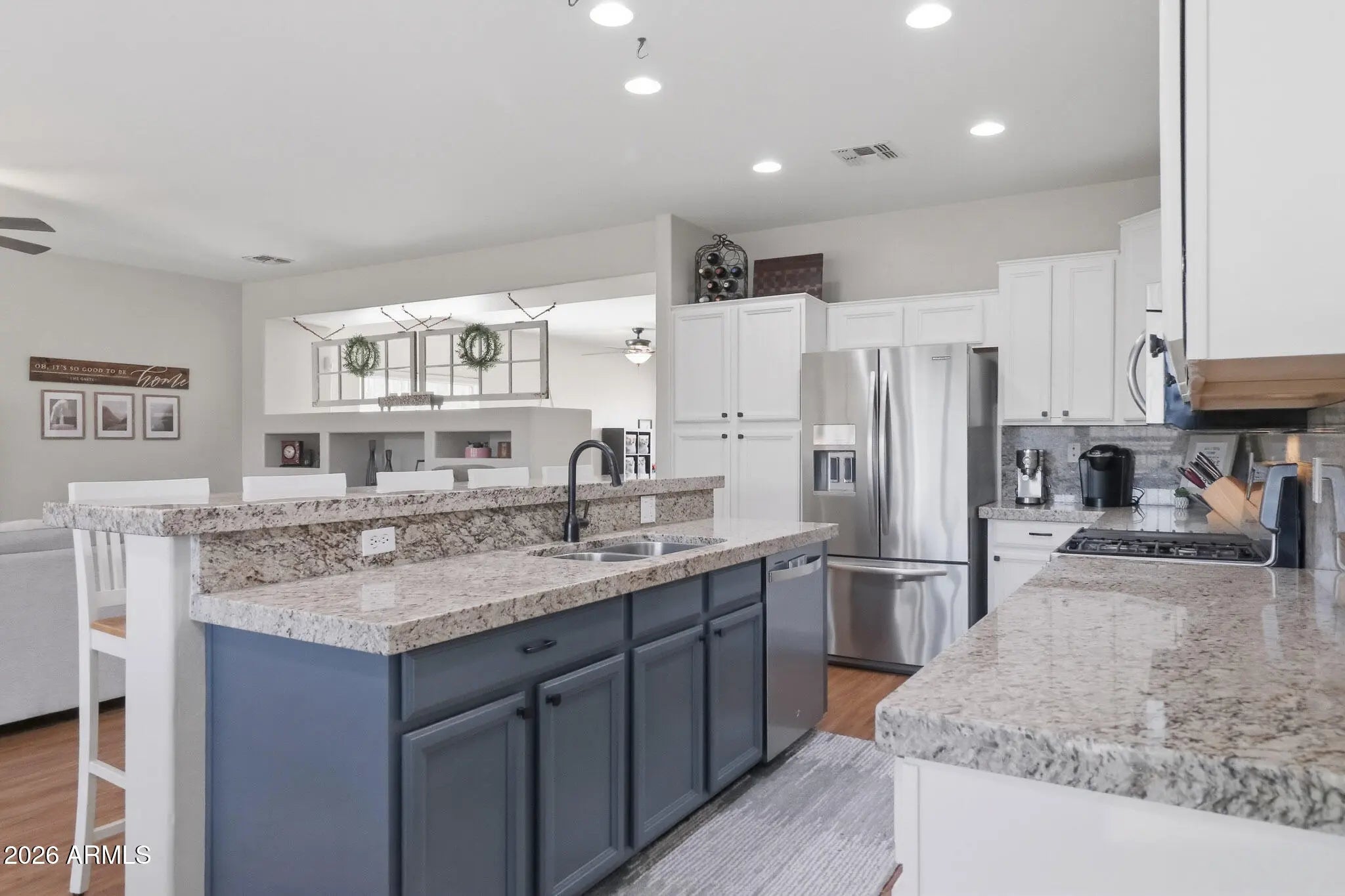 Beautiful 4 bedroom, 2 bath home with 2,288 sq ft in desirable Sage Creek! From the moment you arrive, you'll love the flagstone entry and double security doors. Inside features luxury engineered vinyl flooring and engineered hardwood floors in all the right places, and an upgraded kitchen with granite counters, gas cooktop, and plenty of space for entertaining. Spacious family and living rooms plus a split floorplan for privacy. The primary suite offers a separate tub and shower and backyard access. Step outside to your private pool with variable speed pump and covered patio--perfect for Arizona living. Recent updates include newer AC and water heater. This one checks all the boxes!