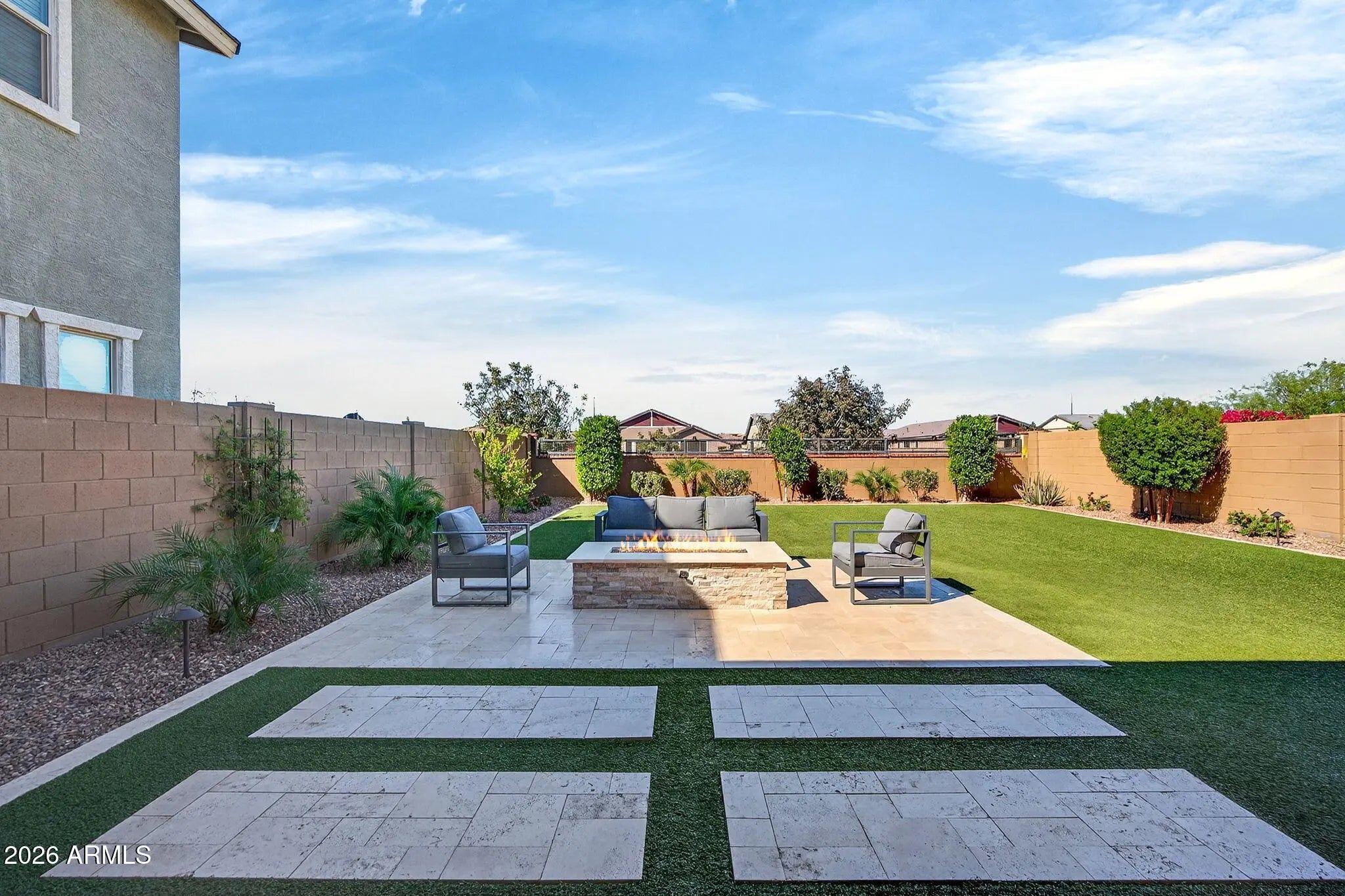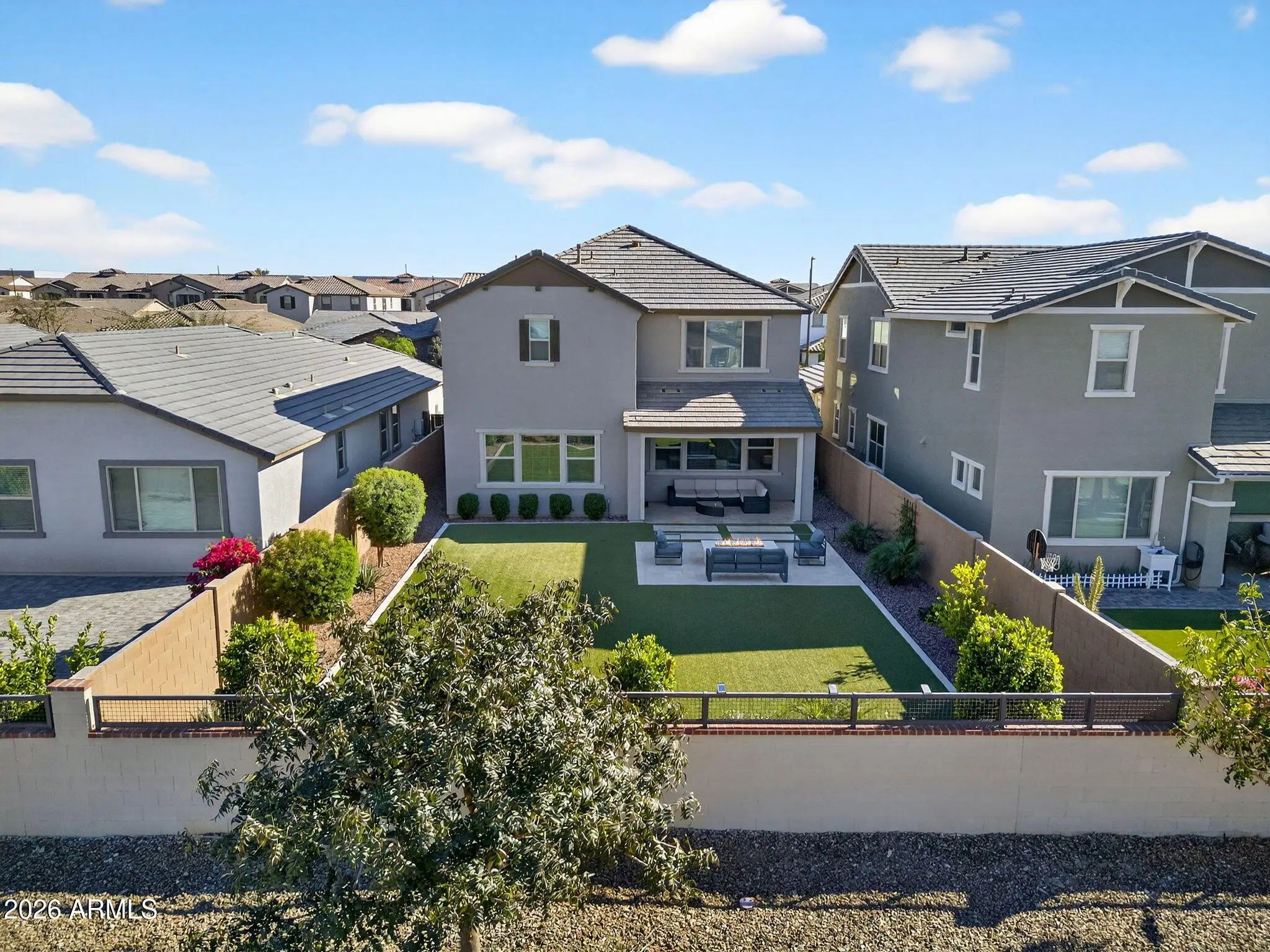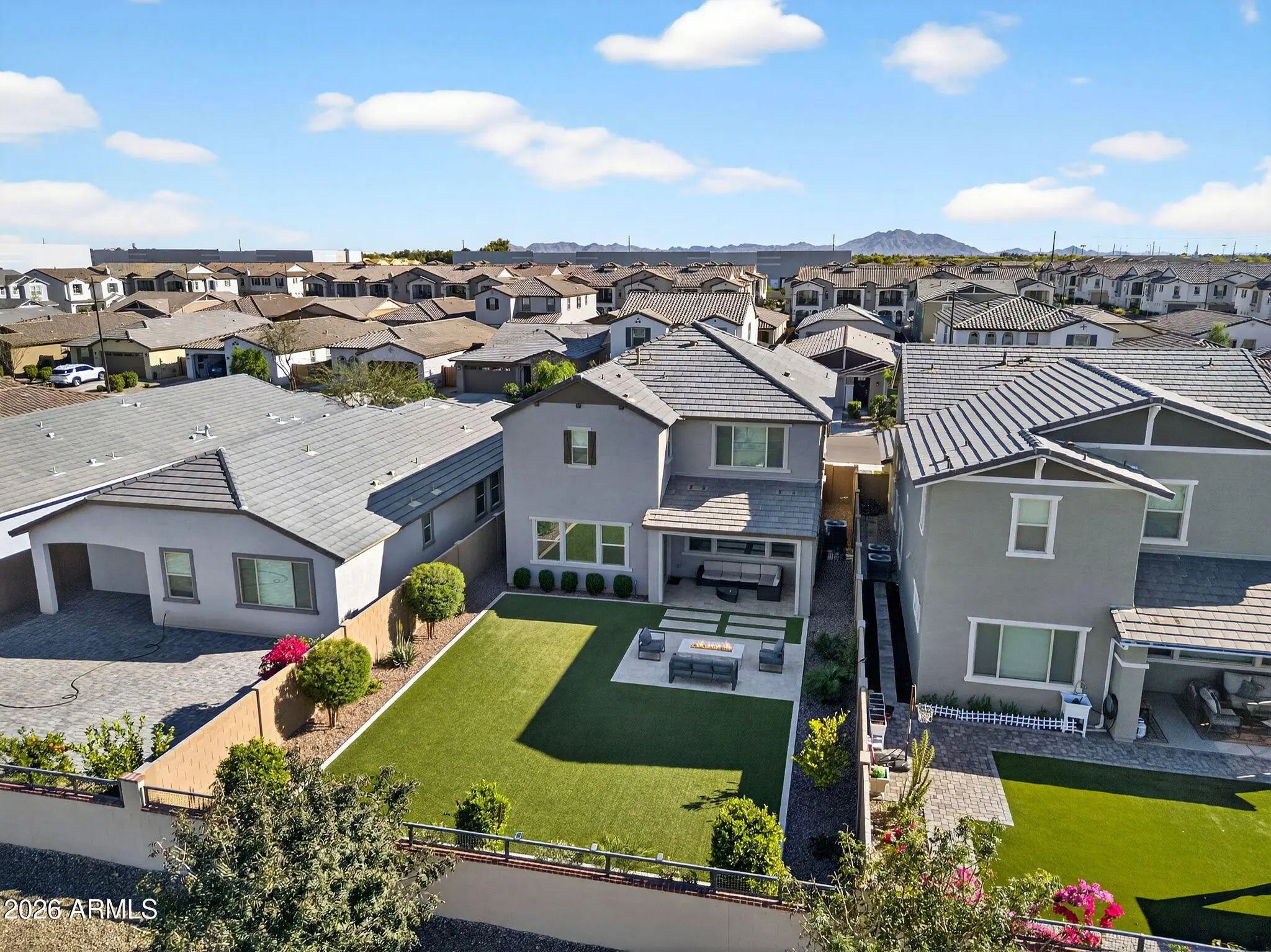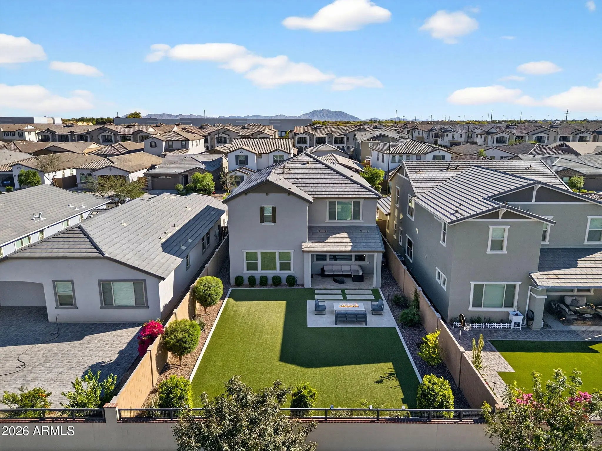 Welcome to this 2023 modern luxury home with 4 beds, 3 baths, and a spacious loft perfect for a playroom, media room, office, or extra living space. The primary suite has a huge upgraded walk-in closet, and the kitchen features white quartz countertops, and ample storage. The outdoor living space is a fully upgraded backyard oasis. Situated on a premium lot with no direct rear neighbors, the yard features lush turf, a built-in fireplace, a water drip system, and elegant travertine finishes. Creating a low-maintenance, high-end outdoor living experience. Enjoy an unbeatable location with quick access to community pool and playground, and just minutes to the 202, premier shopping at San Tan Village, and the charming community of Agritopia. The perfect blend of elegance and convenience!