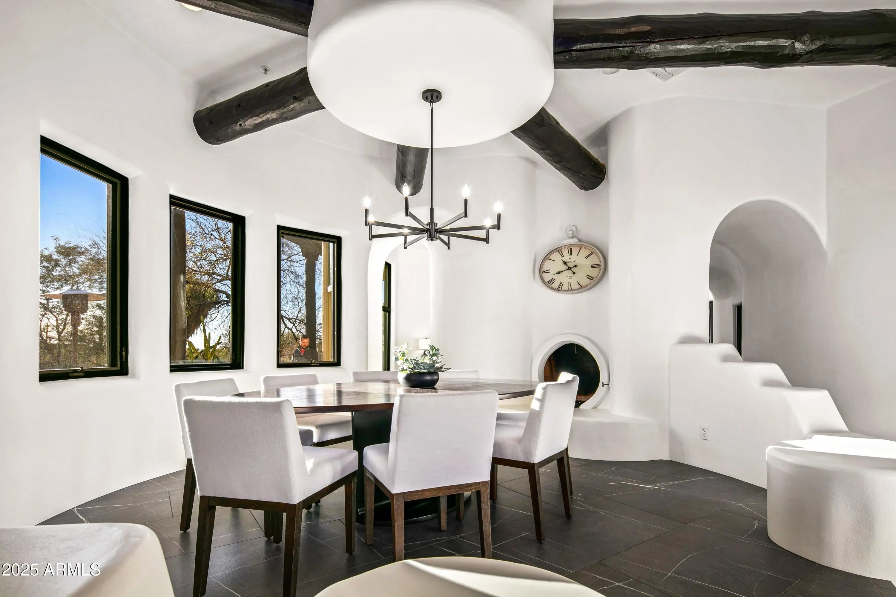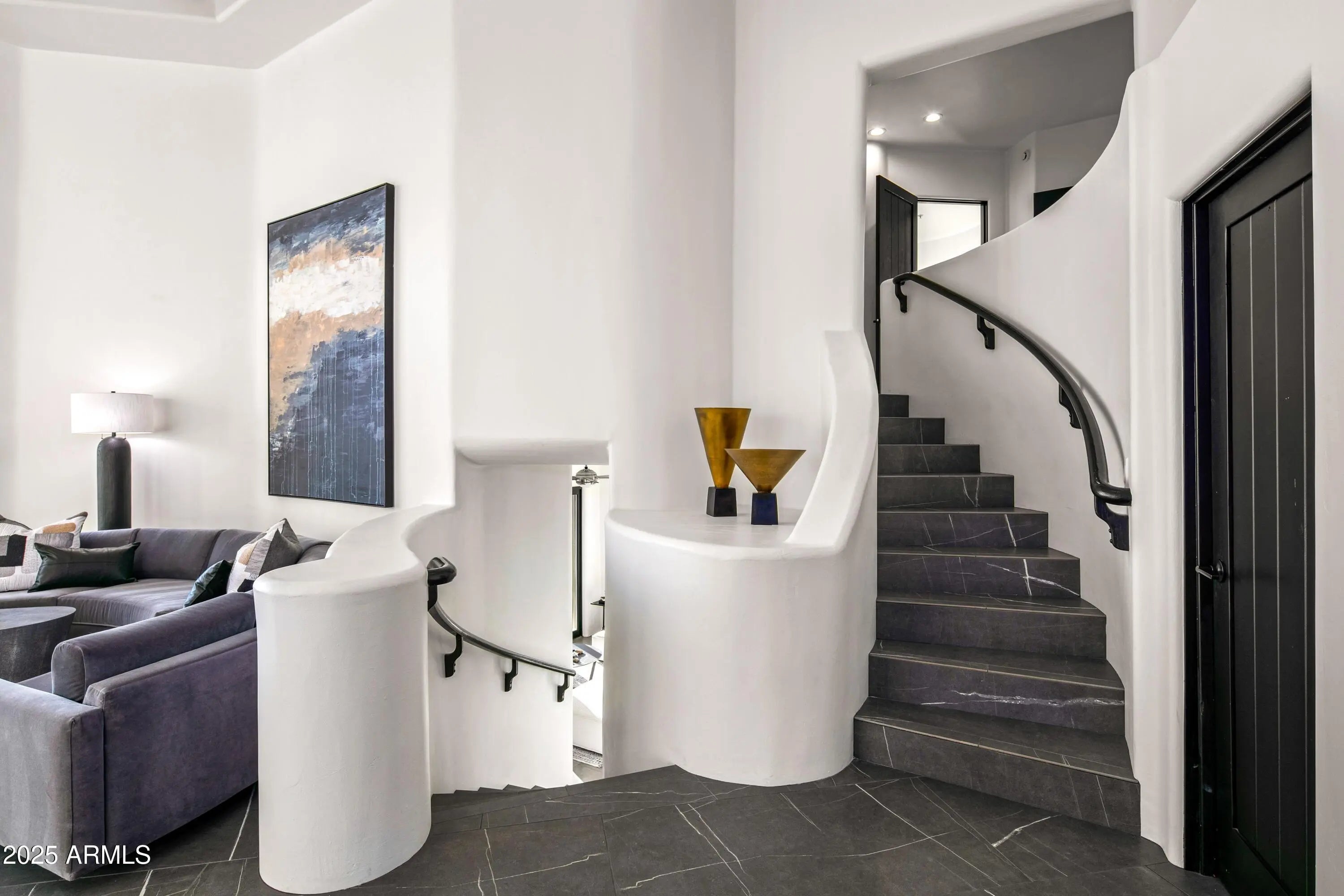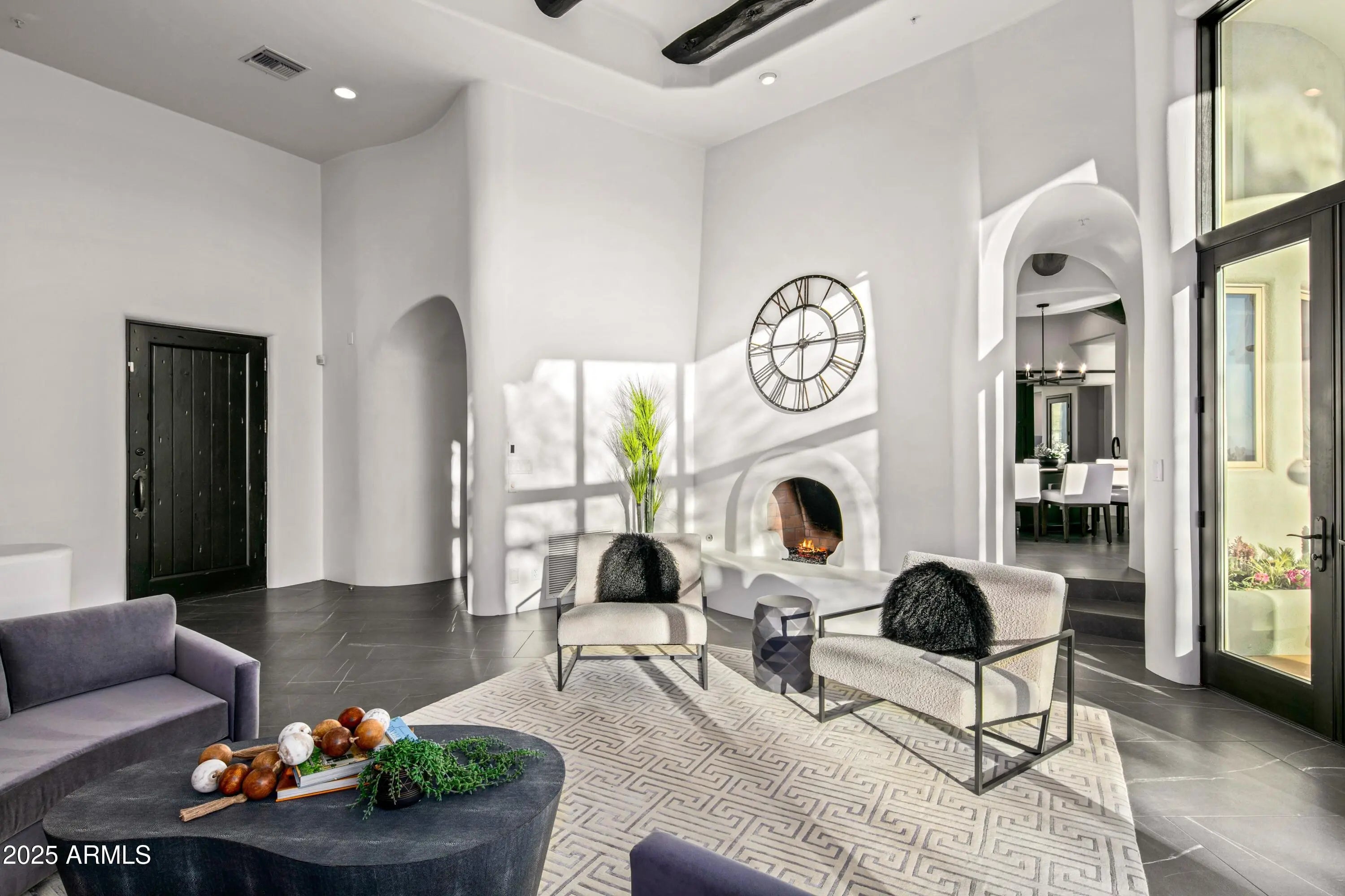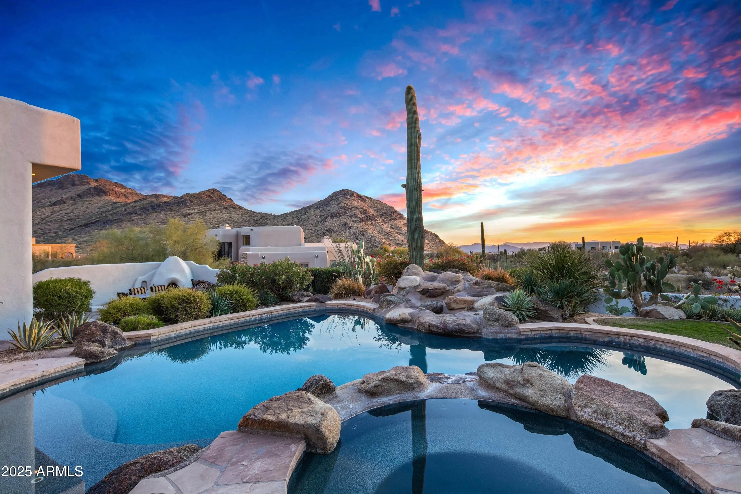 A Masterpiece of Contemporary Pueblo Southwestern Design. This modern stylized Pueblo has been expertly fully remodeled keeping the authenticity and sophistication of the style as well as furnishing the home with the high end finishes and features of today's casual indoor outdoor lifestyle. This impressive home, with separate guest home with sport court, is nestled at the base of the McDowell Mountains in the exclusive gated community of Canyon Heights in North Scottsdale. The elevated 1.57 acred homesite magnifies the inspiring Southwestern views including down Valley views of Camelback Mountain, colorful sunsets and twinkling city lights. A striking fusion of curves and angles defines the home's architectural beauty—arched doorways and corridors, curved walls, stylized kiva A Masterpiece of Contemporary Pueblo Southwestern Design. This modern stylized Pueblo has been expertly fully remodeled keeping the authenticity and sophistication of the style as well as furnishing the home with the high end finishes and features of todays casual indoor outdoor lifestyle. This impressive home, with separate guest home with sport court, is nestled at the base of the McDowell Mountains in the exclusive gated community of Canyon Heights in North Scottsdale. The elevated 1.57 acred homesite magnifies the inspiring Southwestern views including down Valley views of Camelback Mountain, colorful sunsets and twinkling city lights. A striking fusion of curves and angles defines the homes architectural beautyarched doorways and corridors, curved walls, stylized kiva fireplaces, and expansive glass elements harmonize to bring the outdoors in. Freshly painted inside and out, the smooth walls exude warmth, while bold black accentsseen in Vigas, doors, and fixturesadd contemporary contrast. The double gated circular driveway leads to this sublime property set back amongst lush Sonoran Desert vegetation. Upon entry the flowing floor plan includes the ideal living room with numerous windows capturing the incredible views and the dining room connects through an arched corridor with additional windows and stunning kiva fireplace. A barn-doored office offers privacy and also serves as the gateway to the separate guest house. The new gourmet kitchen is a chefs dream, showcasing the finest cabinetry, a spacious island, sleek stone countertops, and top-tier appliances. A welcoming den with circular casual dining space, pool table space and a built-in bar invites hours of relaxation and seamlessly extends to an outdoor dining patio with yet another kiva fireplacean idyllic setting to savor city lights beneath a starry desert sky. Designed for both relaxation and grand entertaining, the resort-style backyard is a true desert oasis. An inviting lagoon pool and spa are accented by natural boulder water features, while two lush lawn areas add vibrancy and contrast to the desert landscape. Expansive outdoor living and dining spaces provide the perfect setting for enjoying the captivating views in ultimate privacy. Whether hosting an intimate gathering or a lively soire, the seamless indoor-outdoor flow ensures a lifestyle of effortless elegance. The expansive primary suite is a private sanctuary, complete with a media room entrance, a floor-to-ceiling fireplace, and direct access to a serene balcony patio offering another perspective of the inspiring vistas. The spa-inspired bathroom presents double vanities, a custom-designed wet room with a freestanding tub, and an open-concept shower. A show-stopping walk-in closet completes this luxurious retreat. For unparalleled guest comfort, separate quarters offer a private den with outdoor access leading to the lower lawned yard, as well as access to the pool patio. The two well-appointed ensuite bedrooms, each with new lavish ensuite baths and walk-in closets guarantee comfort. An additional ensuite bedroom, on the main level, ensures ample space for overflow guests. The detached guest home is a remarkable extension of this estate, offering self-sufficient living with a full kitchen, spacious den, a bath with a steam shower, and a private outdoor patio. The show-stopping 1200 sqft sport court provides endless entertainment, from basketball and ping pong to hockey, fitness and beyond. Tucked away in a tranquil, private setting yet mere minutes from upscale shopping, dining, and the vibrant energy of the Valley, this estate embodies the pinnacle of Sonoran Desert living. Offering privacy, breathtaking views, and seamless indoor-outdoor living for both intimate gatherings and large-scale entertaining, this modern Pueblo masterpiece is truly one of a kind. Your dream desert retreat awaits.