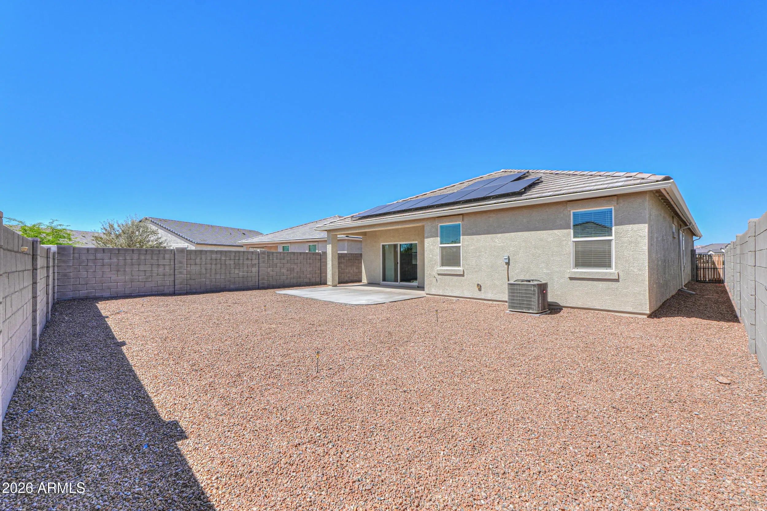 Welcome to this thoughtfully designed, move-in ready home! The open-concept layout features a spacious kitchen with granite countertops, center island, breakfast bar, and a walk-in pantry. A formal dining area offers flexibility for gatherings or a home office setup. Enjoy tile flooring throughout the main living areas with comfortable carpet in the bedrooms. The home is equipped with a water softener, reverse osmosis, and smart home features for added convenience. Step outside to an extended patio with a concrete slab for outdoor living. The low-maintenance backyard offers a blank canvas with gravel landscaping, ready for your perosonal touch! Energy efficiency with owned solar (loan to be assumed). Additionally, a VA assumable loan presents a fantastic opportunity for eligible buyers!