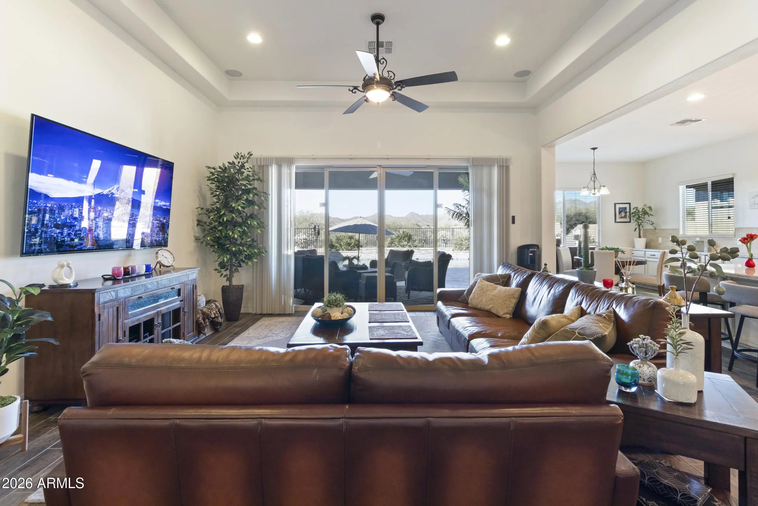 In the highly sought after community of Vistoso. 360° mountain views, a saltwater pool, and covered patio with firepit & bar set the scene for relaxation and effortless, elegant entertaining. Inside, soaring ceilings, a gourmet kitchen, and spa like primary suite make every day feel luxurious. With a 3-car tandem garage, epoxy floors, and steps from recreation, trails, golf, and so much more; this home brings comfort, style, and an elevated lifestyle. Other features include a water softener, utility sink, self closing cabinetry, under cabinet lighting, mechanical sun shades, indoor and outdoor surround sound, 12 ft tray ceilings in living area, double oven, black granite single basin sink, beautiful granite countertops.. the list is endless! TARMLS Members please use Aligned.