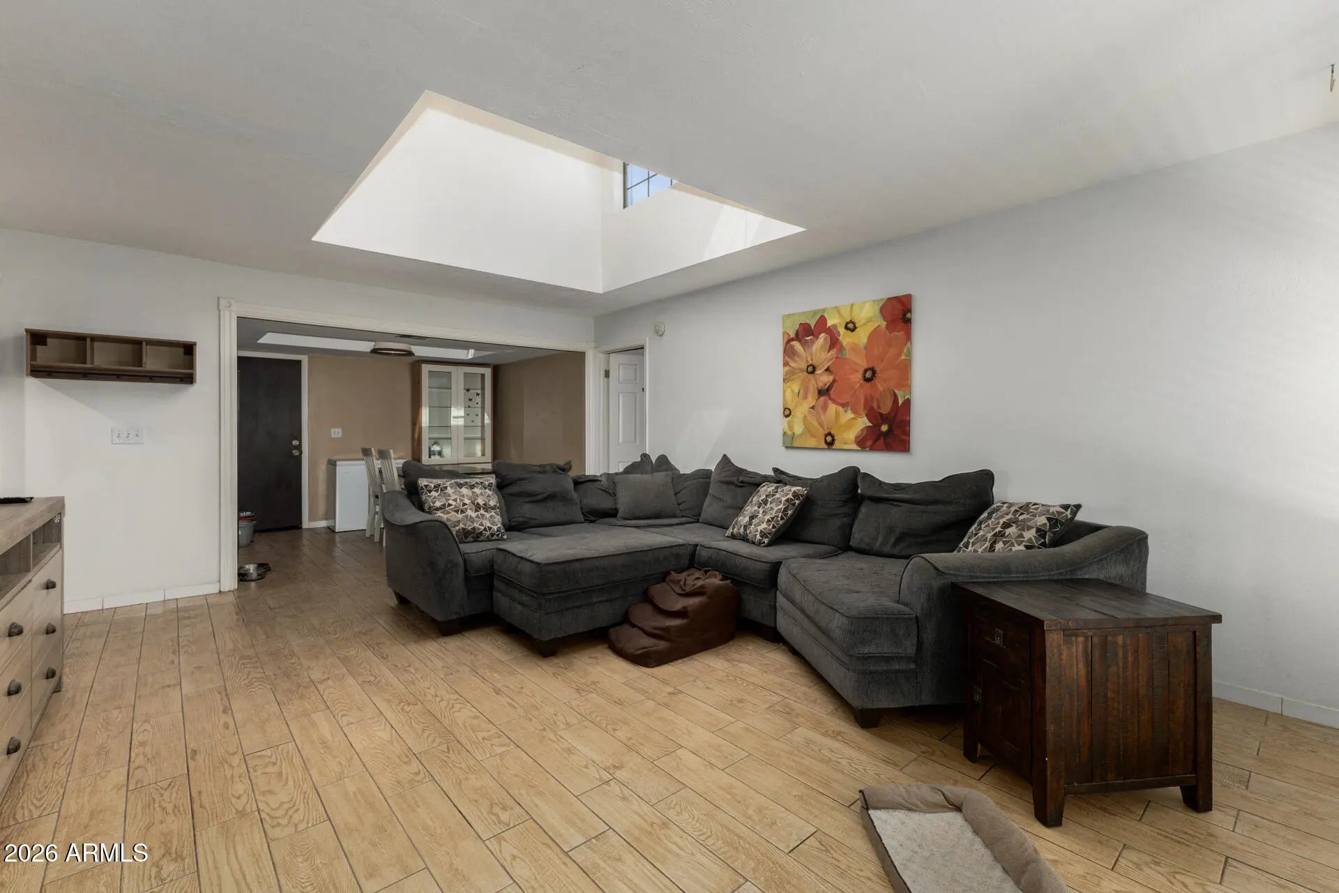Beautifully upgraded 3-bedroom, 2-bathroom single-level home with 1,200 sq ft of living space and a 2-car garage located in Dobson Ranch. This home boasts a modern kitchen featuring sleek cabinets, flowing seamlessly into the spacious living area filled with natural light from well-placed skylights. The owner's suite offers a luxurious retreat with upgraded tile and a tub/shower, leading to a cozy outdoor courtyard with a firepit--perfect for relaxation. The split floor plan provides privacy for two additional bedrooms located at the front, complemented by a stylish hall bath. Enjoy the inviting covered patios. Nestled in the vibrant Dobson Ranch community, offering a wealth of amenities such as golf courses, biking and walking paths, and community tennis courts. New Roof & New AC!!