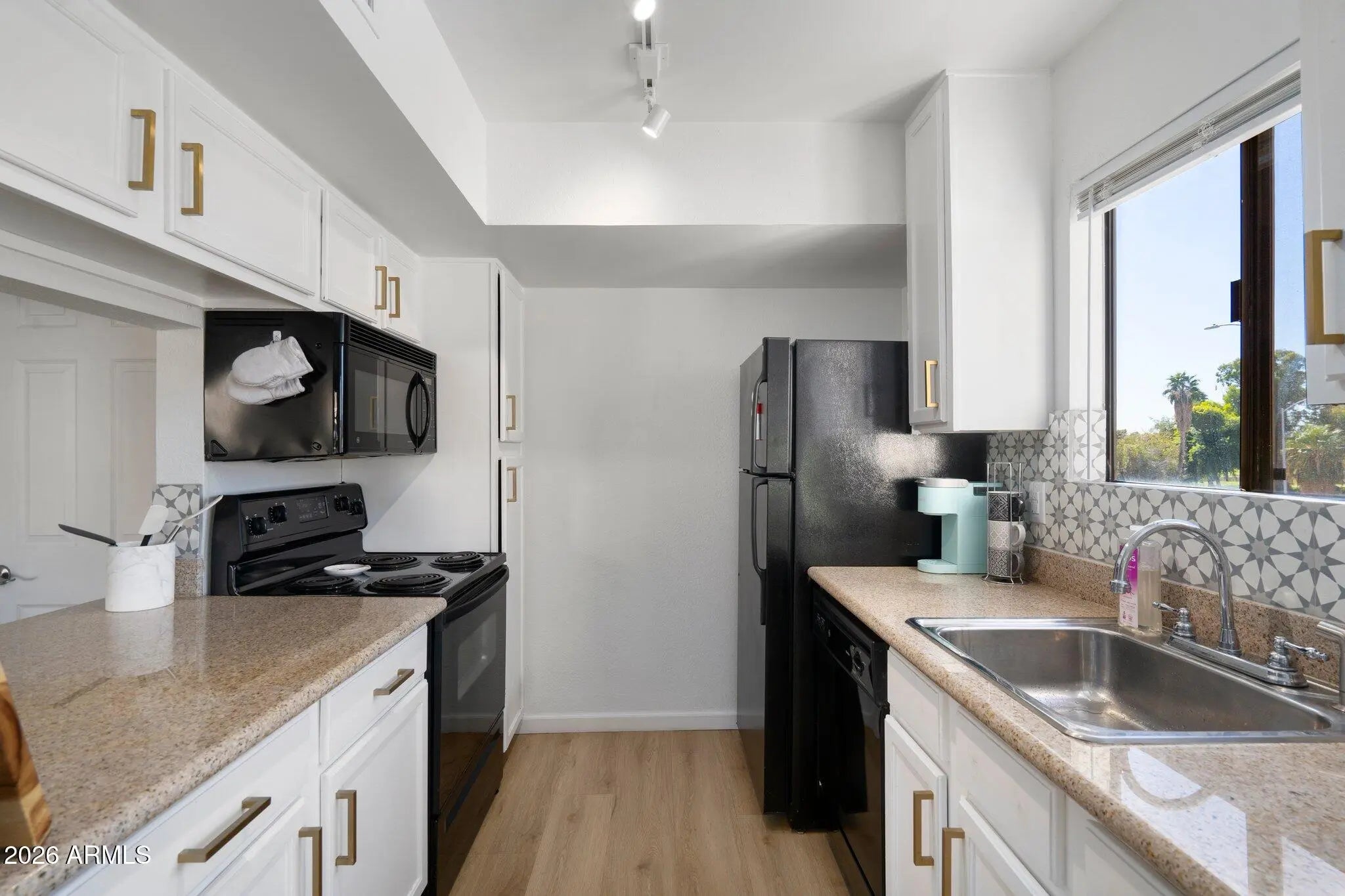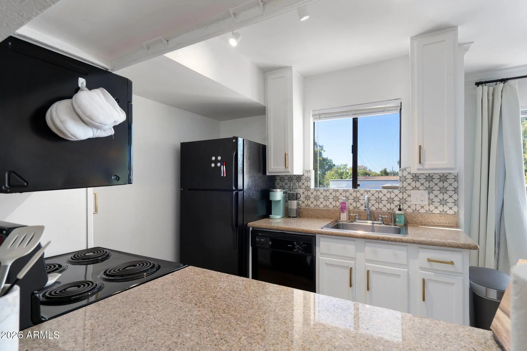 Step into this charming and rare corner unit, now available and completely move-in ready. This delightful home features beautiful granite countertops paired with repurposed cabinetry, all enhanced by brand-new hardware and a stylish, modern backsplash that adds the perfect finishing touch to the kitchen. Enjoy the elegance of gorgeous new luxury vinyl flooring that flows seamlessly throughout the entire home, complemented by an abundance of natural light that fills every room. New window treatments & screens provide both comfort & convenience, while thoughtful updates continue throughout including all new lighting, ceiling fans, built-in storage and outlets. Take in stunning views from multiple vantage points-dining room and kitchen windows, upstairs windows and balcony and (see more) and private staircase-showcasing mountain and golf course scenery, along with views of lush trees and the Scottsdale Stadium lights Start your mornings with coffee overlooking the golf course and the iconic Camelback and Papago Mountains. The bathroom has been refreshed with a resurfaced shower/bathtub, a new mirror, and updated fixtures, while fresh interior paint gives the home a refreshing, inviting feel. Ideally located just steps from the golf course, dining and shopping, this home offers both convenience and a vibrant lifestyle minutes from Old Town Scottsdale. For added convenience, select furniture, decor and kitchenware may be available on a separate bill of sale. The bathroom has been refreshed with a resurfaced bathtub, a new mirror, and updated fixtures. Fresh interior paint gives the home a clean, inviting feel. Close to Old Town, shopping and dining,