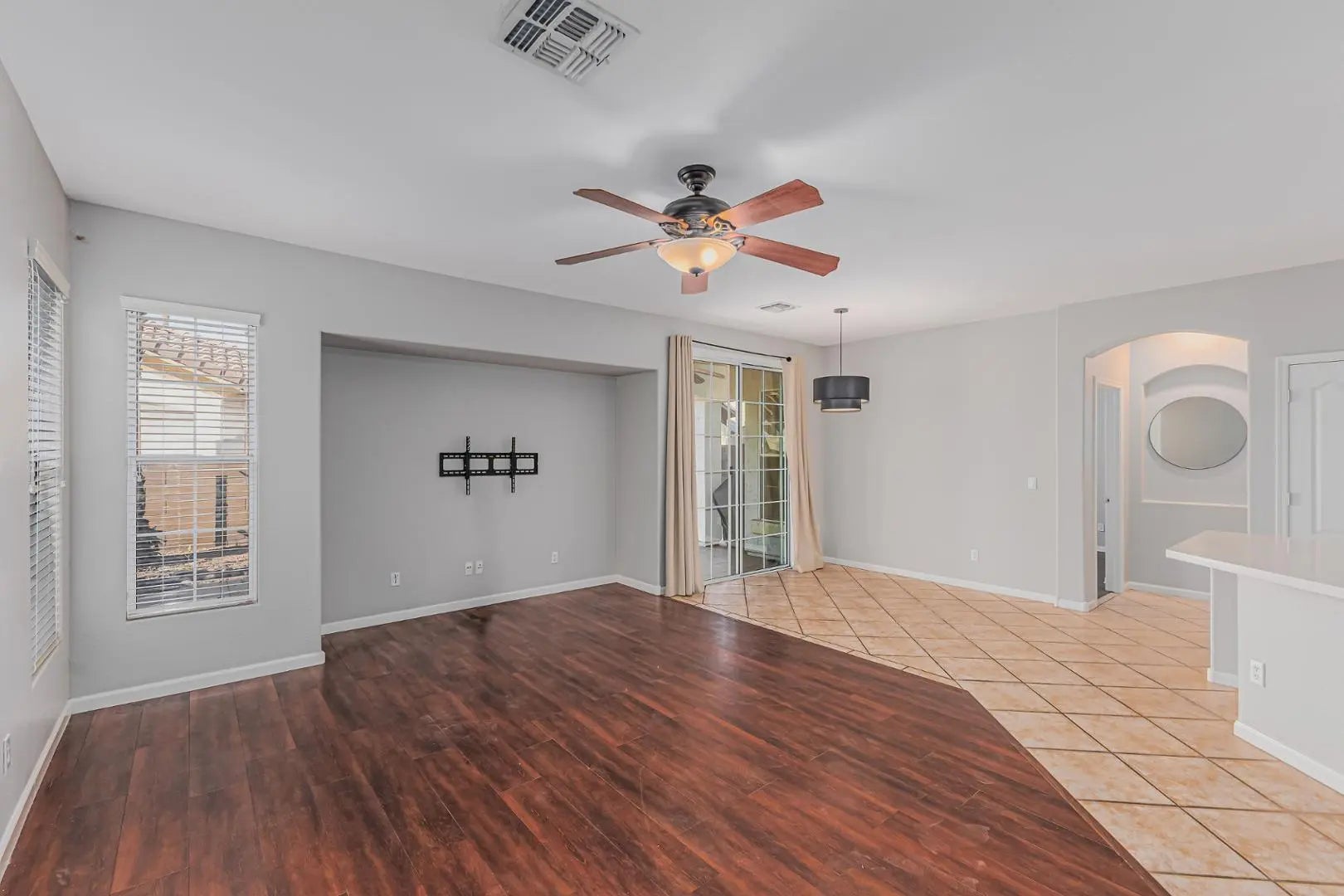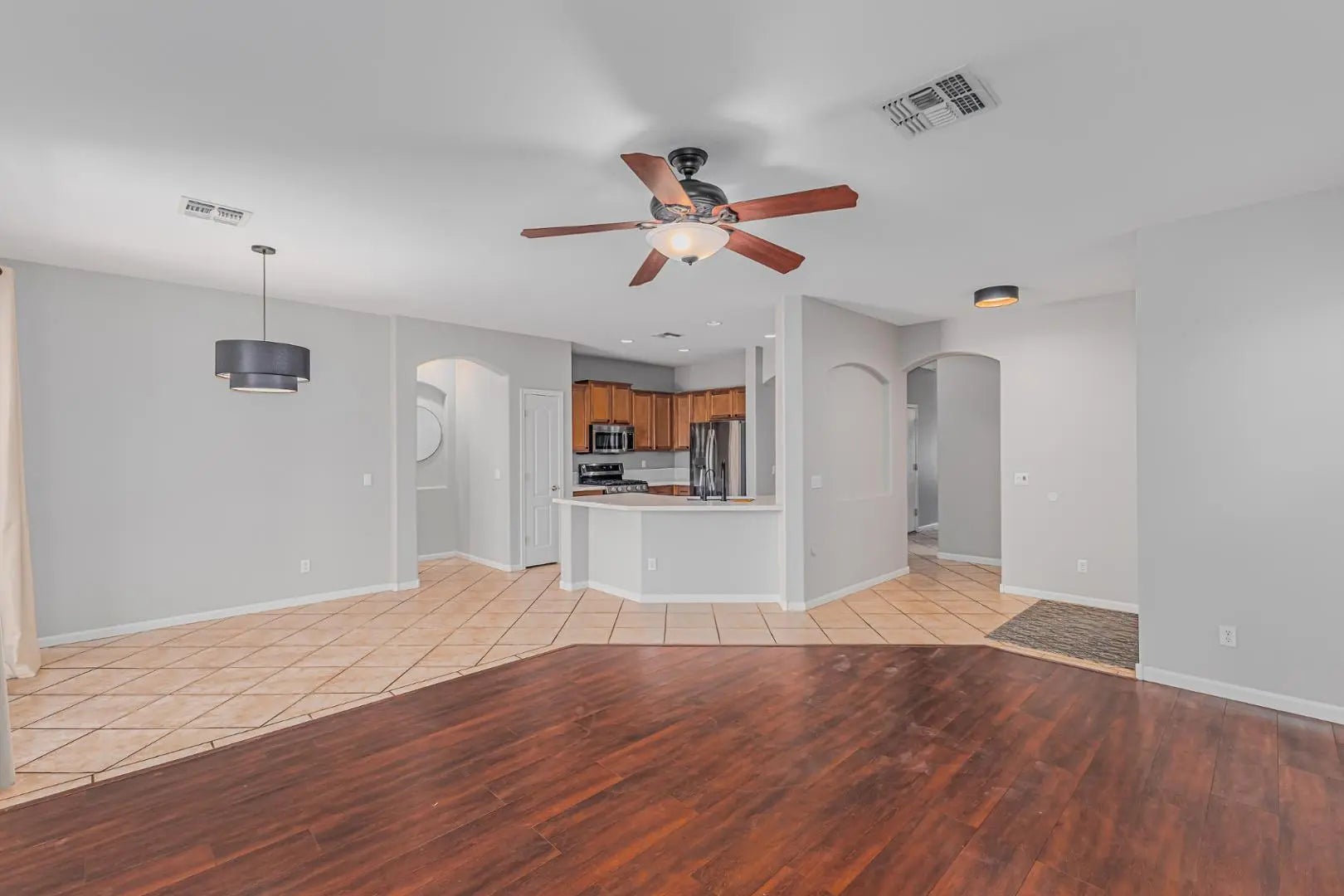 Take advantage of this fantastic rental opportunity! This lovely 3-bedroom, 2-bath home features an appealing open layout with high ceilings, a soothing palette, blinds, and a harmonious blend of wood-look and durable tile flooring. The gourmet kitchen comes with solid surface counters, ample wood cabinetry with crown moulding, recessed lighting, stainless steel appliances, a pantry, and a peninsula with a breakfast bar. The primary bedroom showcases an ensuite with double sinks and a walk-in closet for an organized wardrobe. Unwind at the end of a long day in the backyard, which offers a covered patio perfect for enjoying a good book or a refreshing drink. Don't miss out on this charming residence!