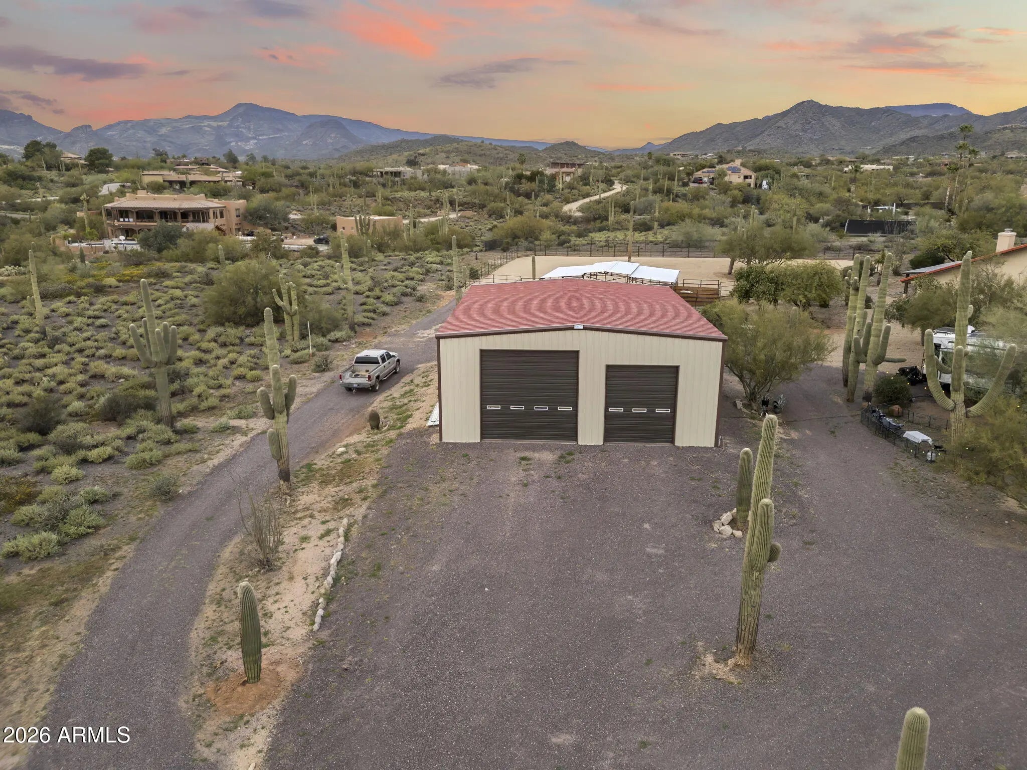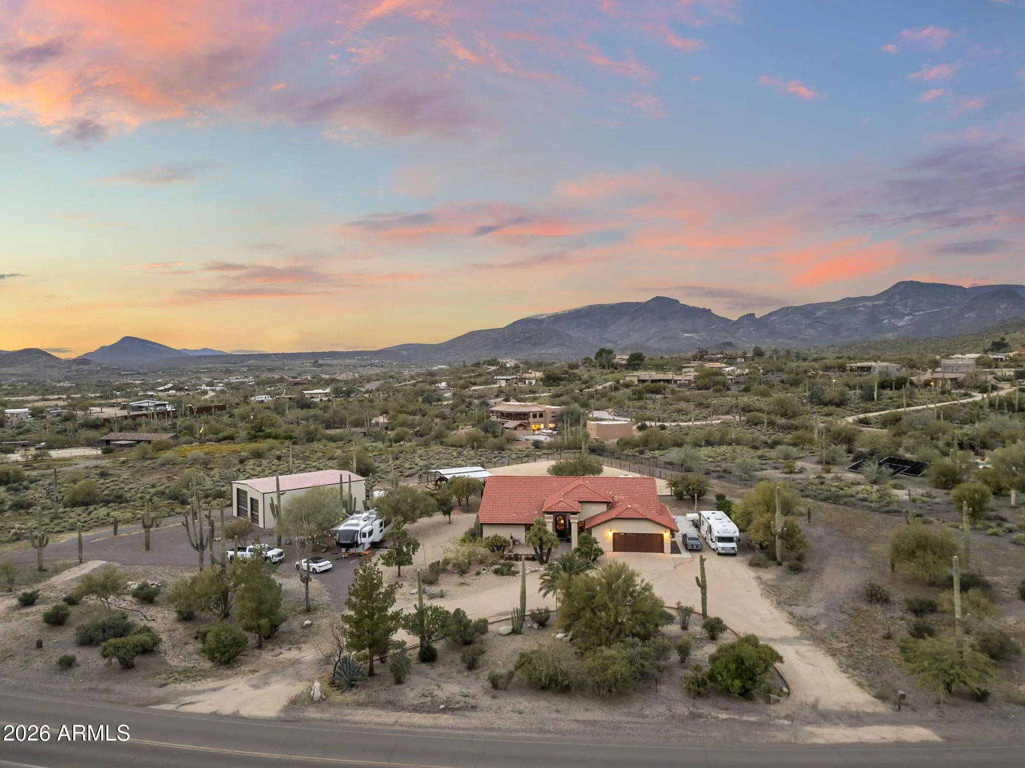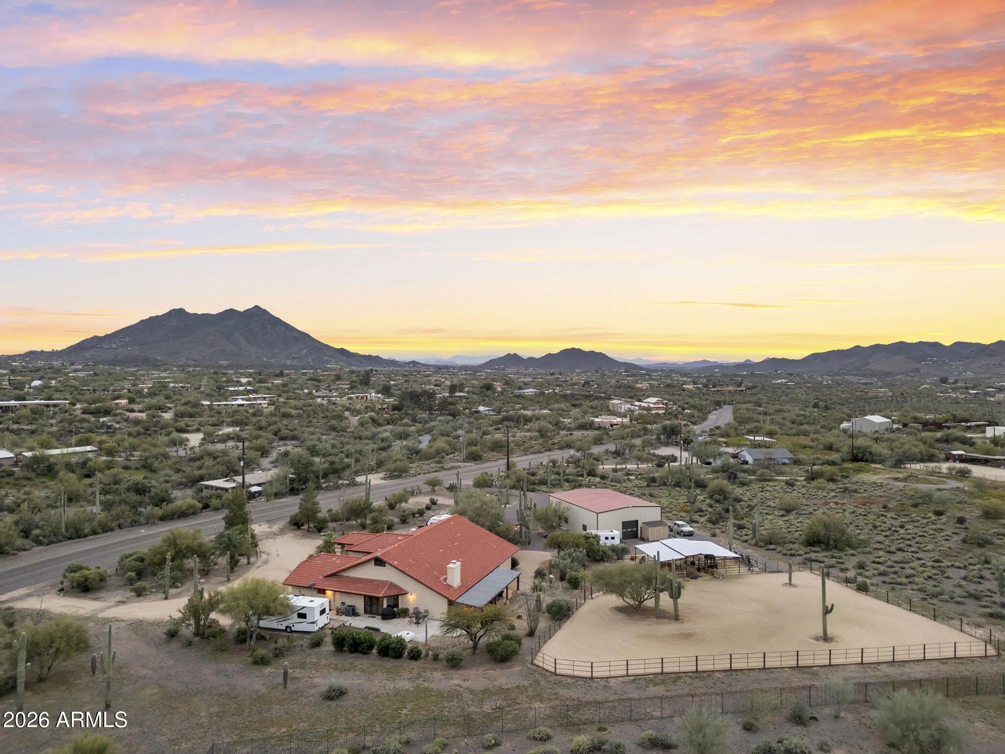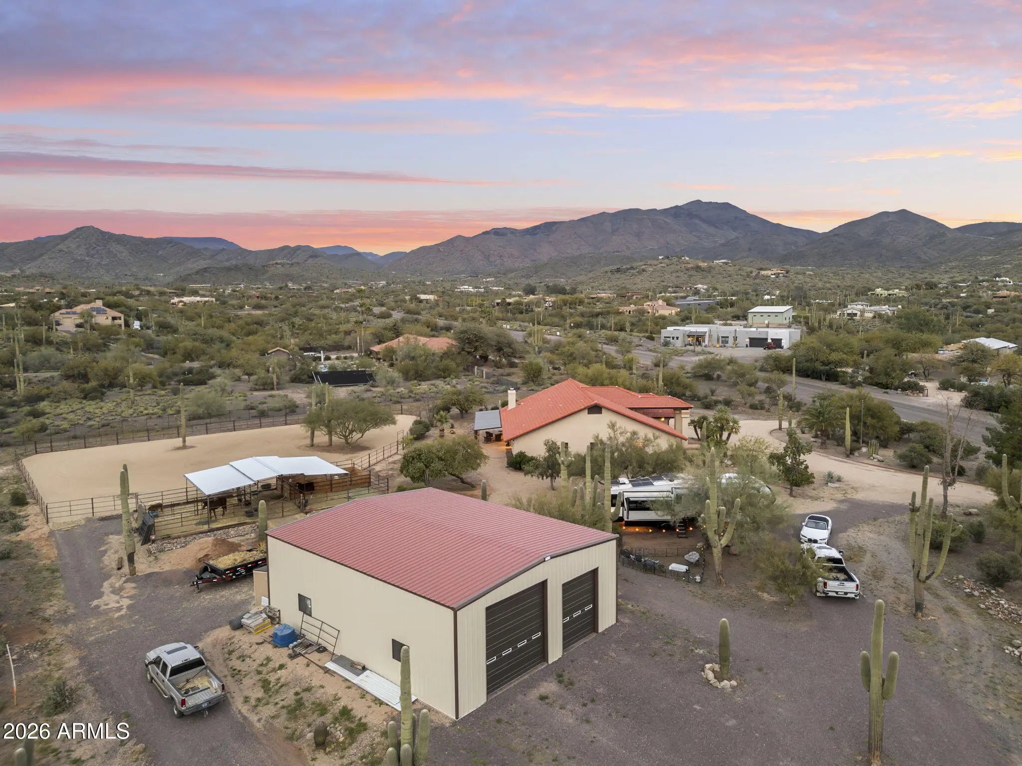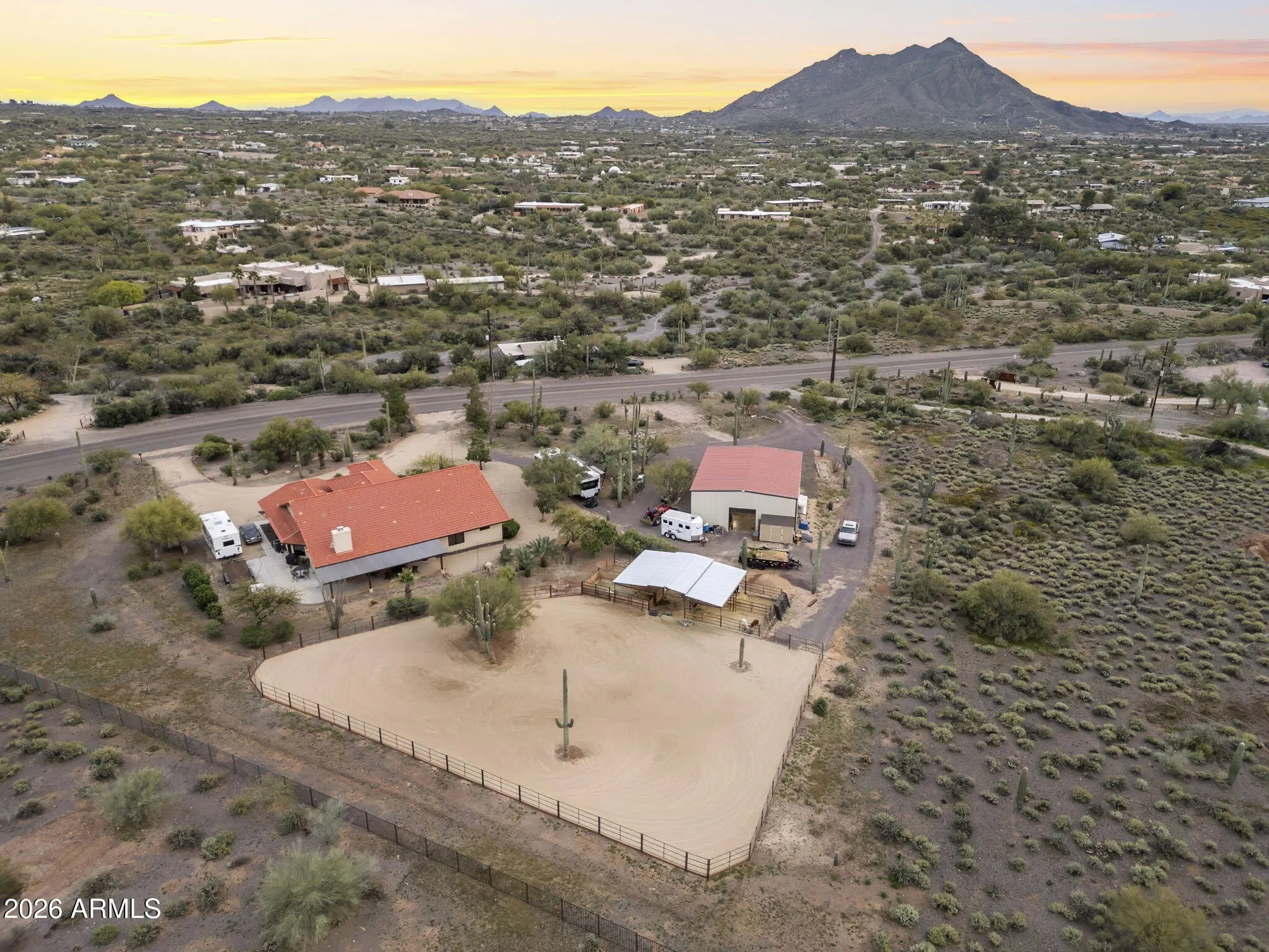 Desert Ranch Living in Cave Creek's sought-after western horse country. This 2.36-acre property offers open skies, panoramic views of Black Mountain and surrounding peaks, breathtaking sunsets, and direct access to scenic desert trails. A newly built 2,000 sq ft (40'x50') barn garage features a car lift, 3 oversized doors, and 50-amp hookup perfect for trucks, trailers, RVs, or workshop space. Enjoy a newly set up arena and stalls for true ride-out convenience. This no-step Spanish style home offers an open layout, spacious bedrooms, office, warm finishes, and a primary suite with clawfoot tub, walk-in shower, dual closets, and private patio. Attached 2-car garage, circular driveways, newer mechanicals, and ample outdoor living complete this authentic ranch retreat just mins to downtown.