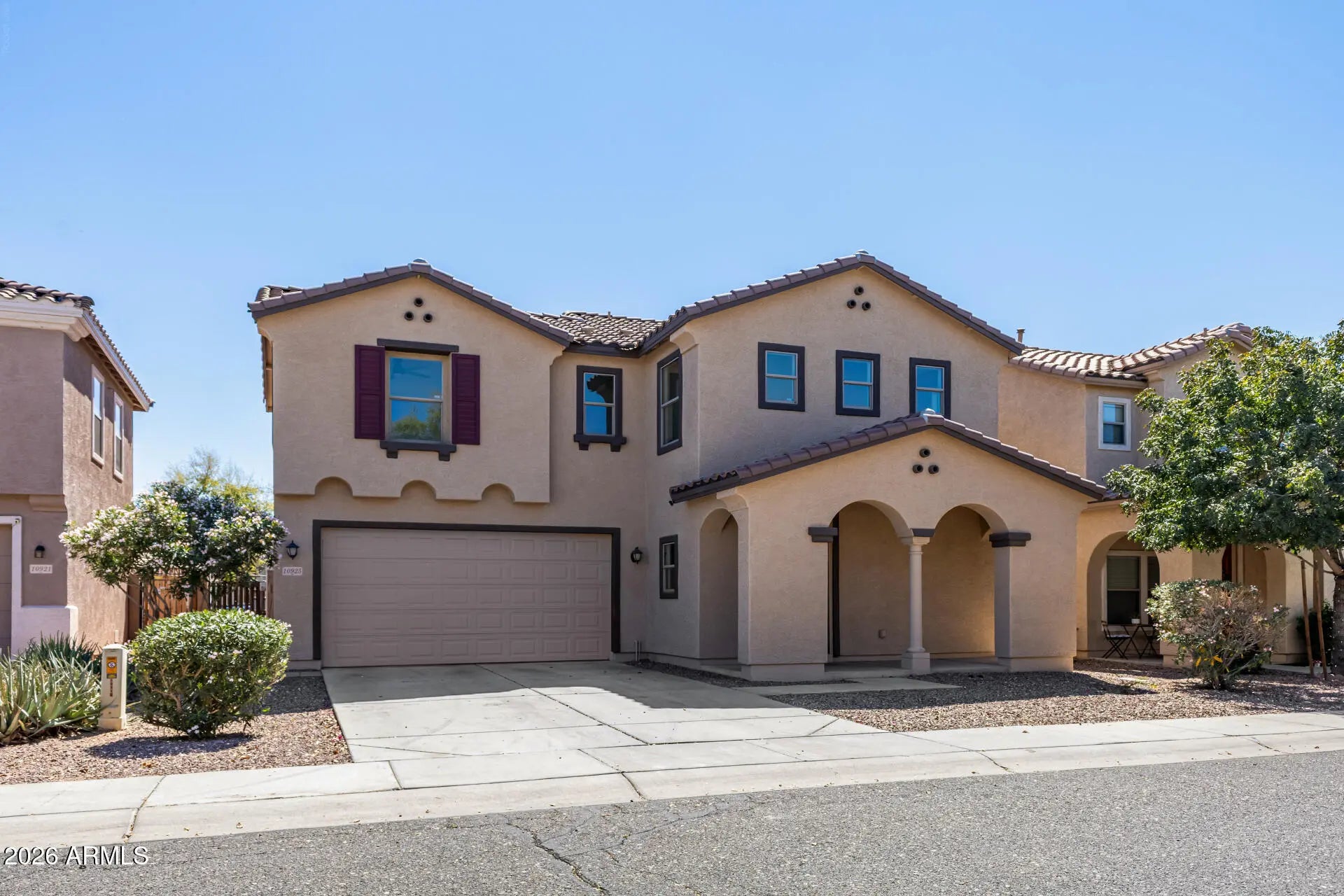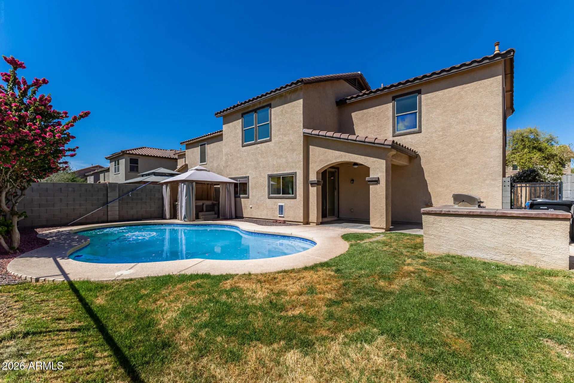 Beautifully updated two-story home featuring fresh interior paint and brand-new carpet throughout. This 4-bed, 2.5-bath layout offers a bright, open feel with 9-ft ceilings on the main level and a spacious family room. Upstairs includes a convenient laundry room with washer and dryer, plus a generous primary suite with a walk-in closet and dual sinks. The backyard is built for entertaining with a large pool, outdoor kitchen, covered patio, and grass lawn. Low-maintenance desert landscaping in front. Close to schools, parks, shopping, Spring Training, and major freeways, this home offers comfort and convenience in a prime location.
