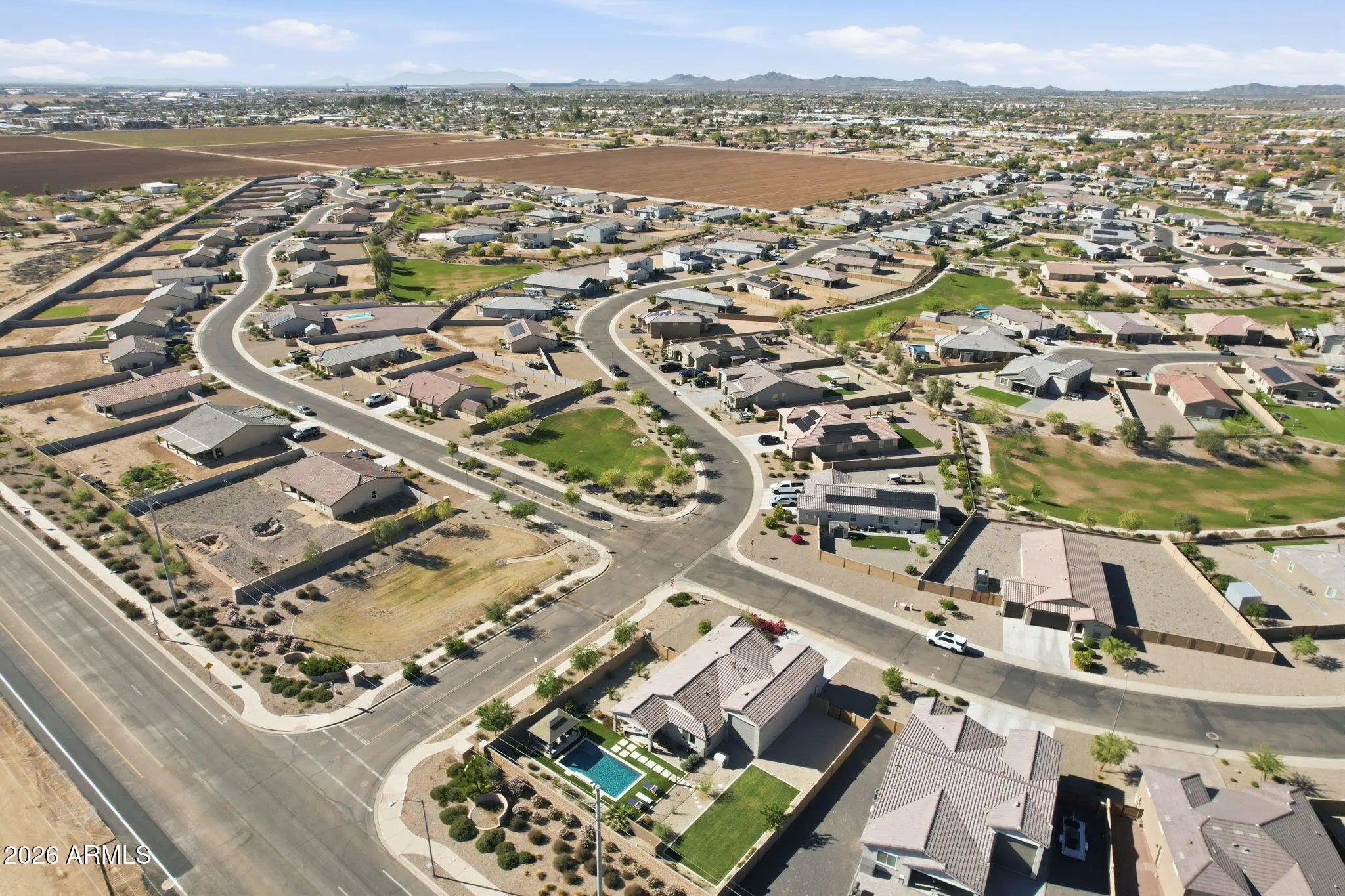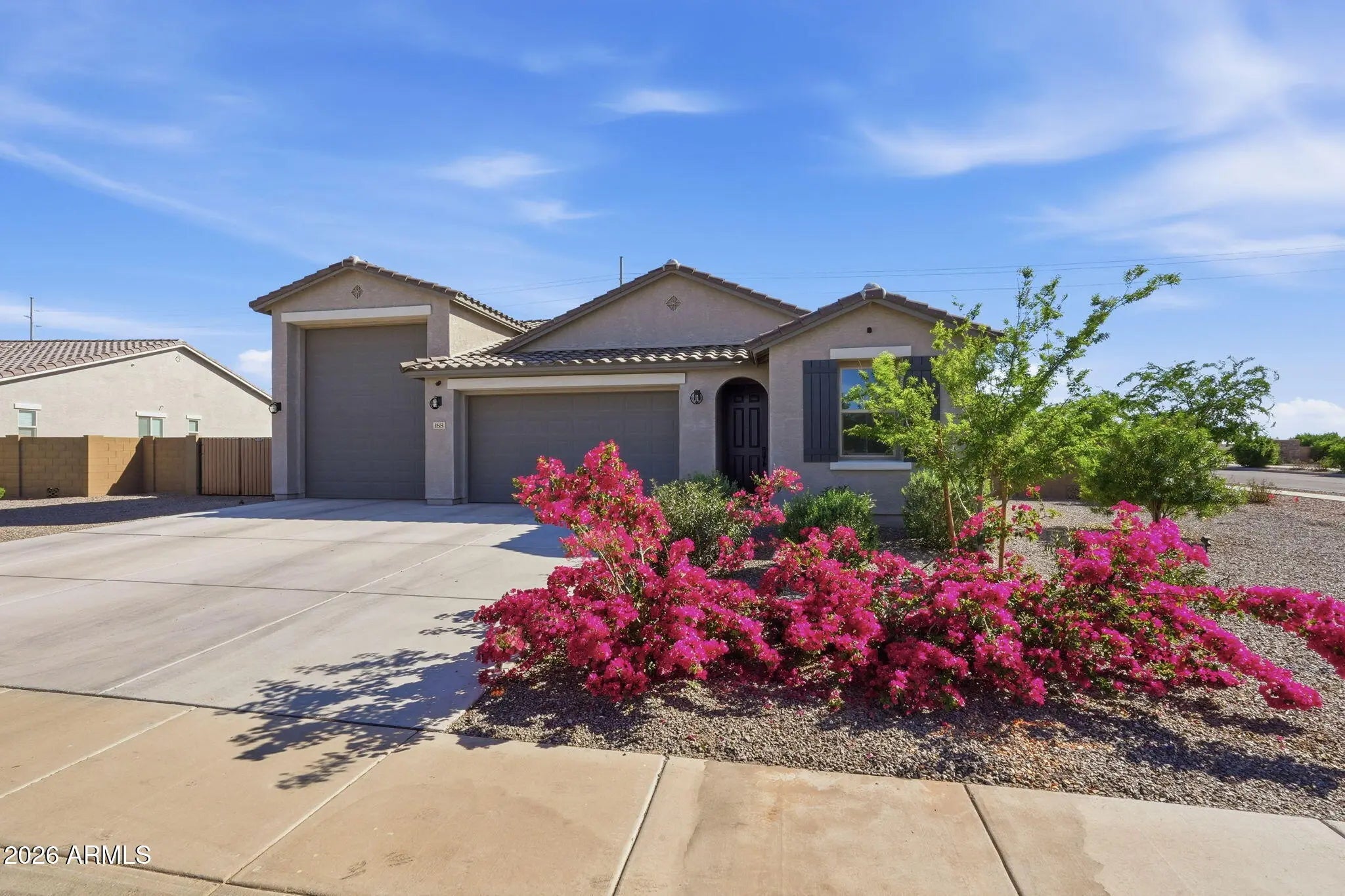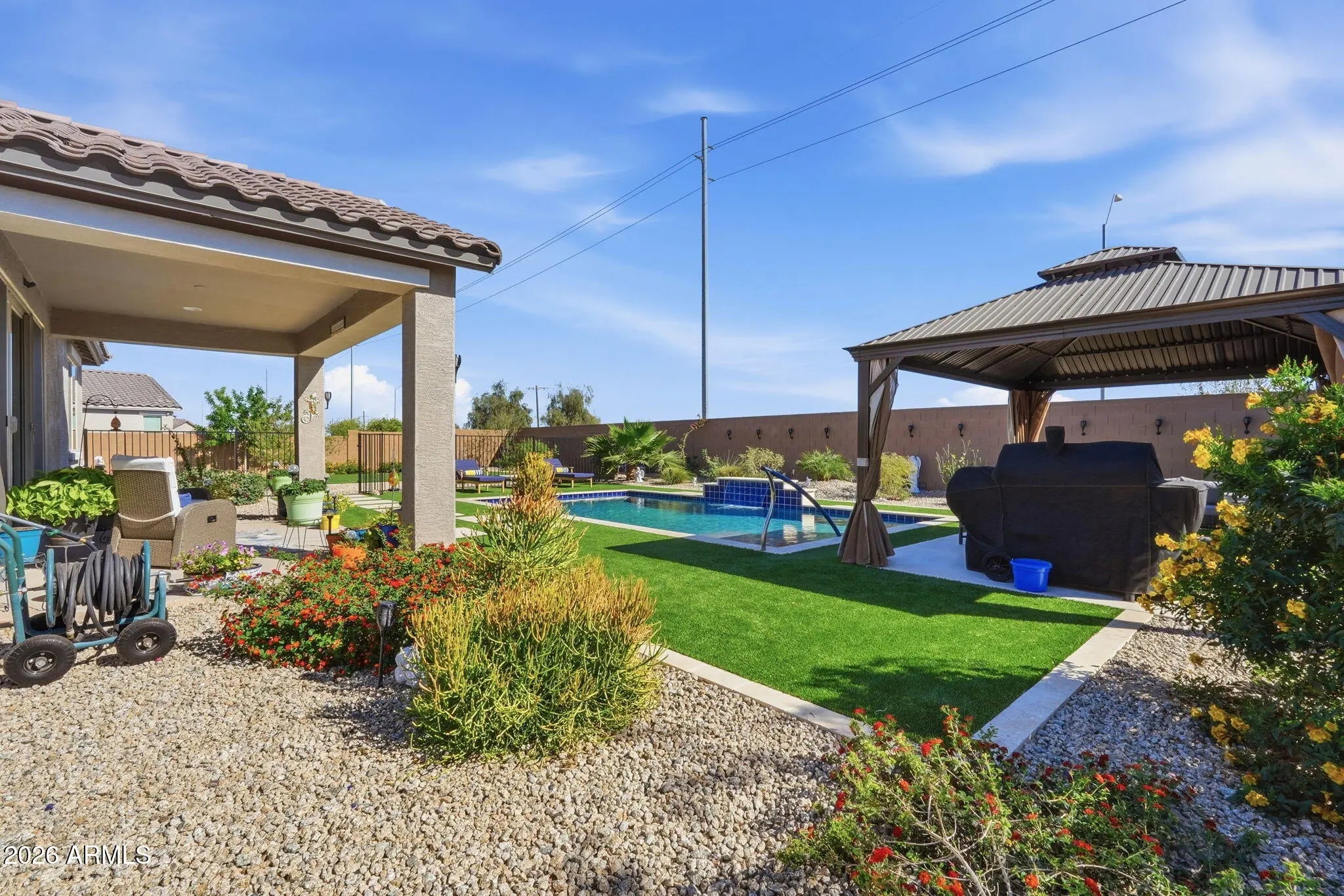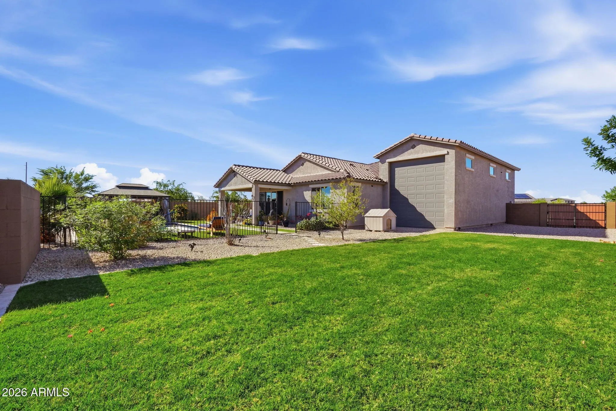 Beautifully maintained and better than new, this one-owner home offers 3 bedrooms, 2 bathrooms, a 2-car garage, and a highly sought-after RV garage with dual access doors, all perfectly situated on a premium corner lot. From the moment you arrive, you'll feel the pride of ownership in this meticulously cared-for home, just over 2 years old. Inside, the open-concept design invites you to gather around the spacious kitchen island, perfect for entertaining friends or enjoying everyday moments. The home is thoughtfully upgraded with plank tile flooring, quartz countertops, plantation shutters, and oversized ceiling fans in both the living room and primary suite for added comfort and style. A double sliding glass door seamlessly connects the indoor living space to the backyard, enhancing the home's light, openness, and true indoor-outdoor lifestyle. Step outside to your private backyard oasis, where every detail has been designed for relaxation and entertaining. Enjoy the stunning in-ground pool with a tranquil waterfall feature, surrounded by travertine tile, artificial turf for easy maintenance, and a beautiful ramada for shaded outdoor living. A separate fenced and landscaped area with real grass adds versatility and is ideal for pets or play. The RV garage with doors on both ends, along with an RV gate, offers exceptional functionality and convenience for all your toys and storage needs. Unwind in the evenings with beautiful mountain views and Arizona sunsets right from your backyard. Whether you're hosting gatherings or enjoying a quiet night at home, this property truly delivers the best of indoor-outdoor living. This is more than just a home, it's where comfort, quality, and lifestyle come together.