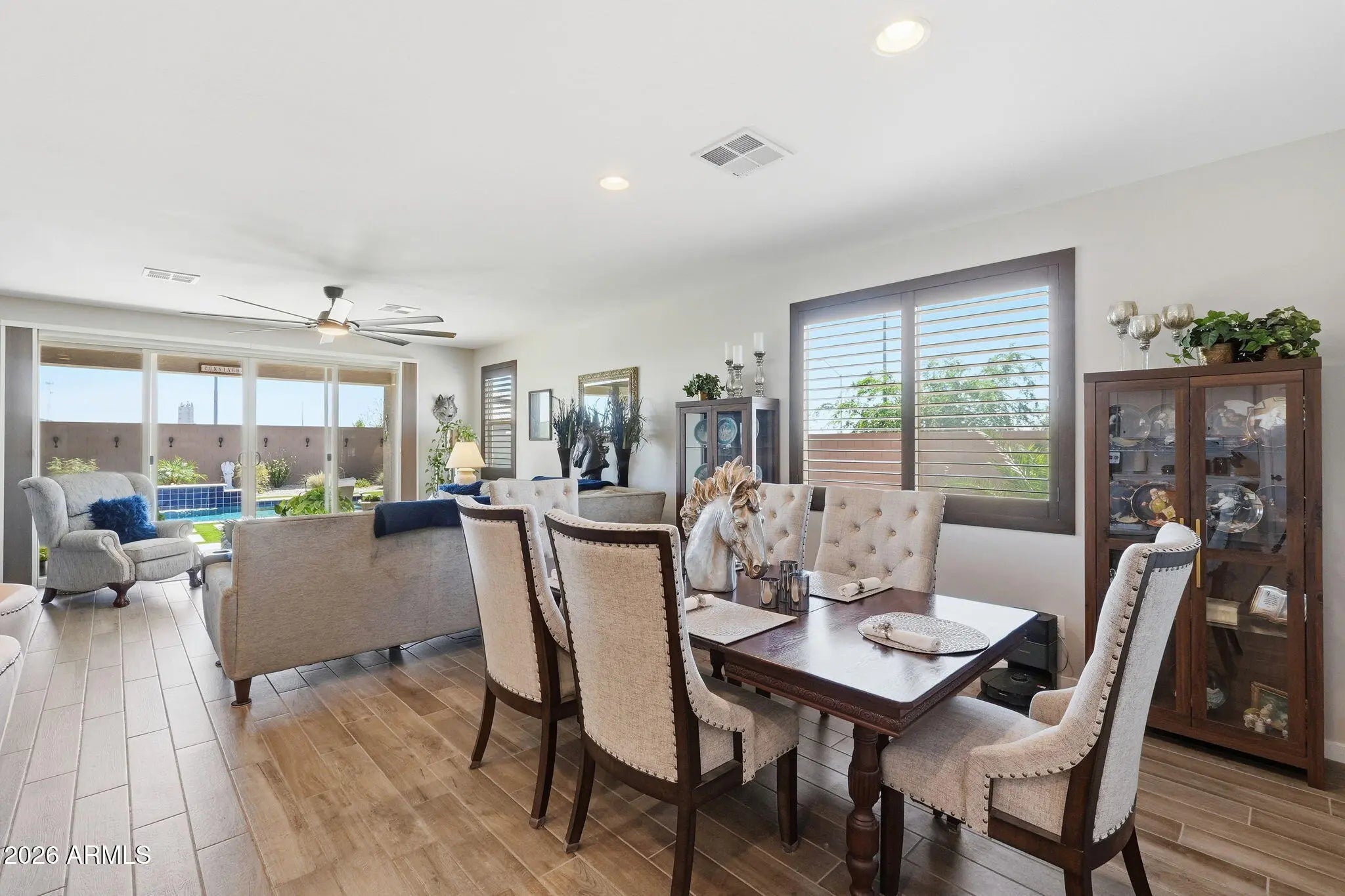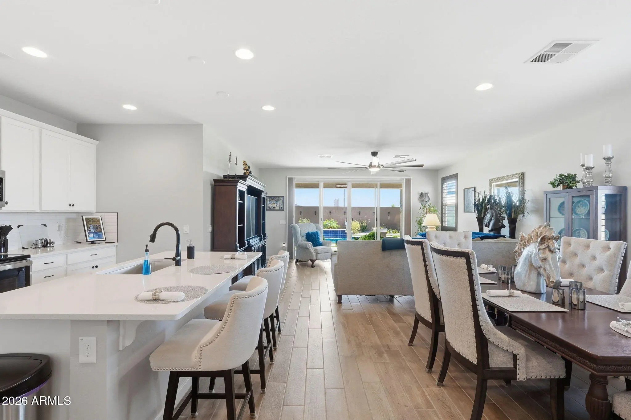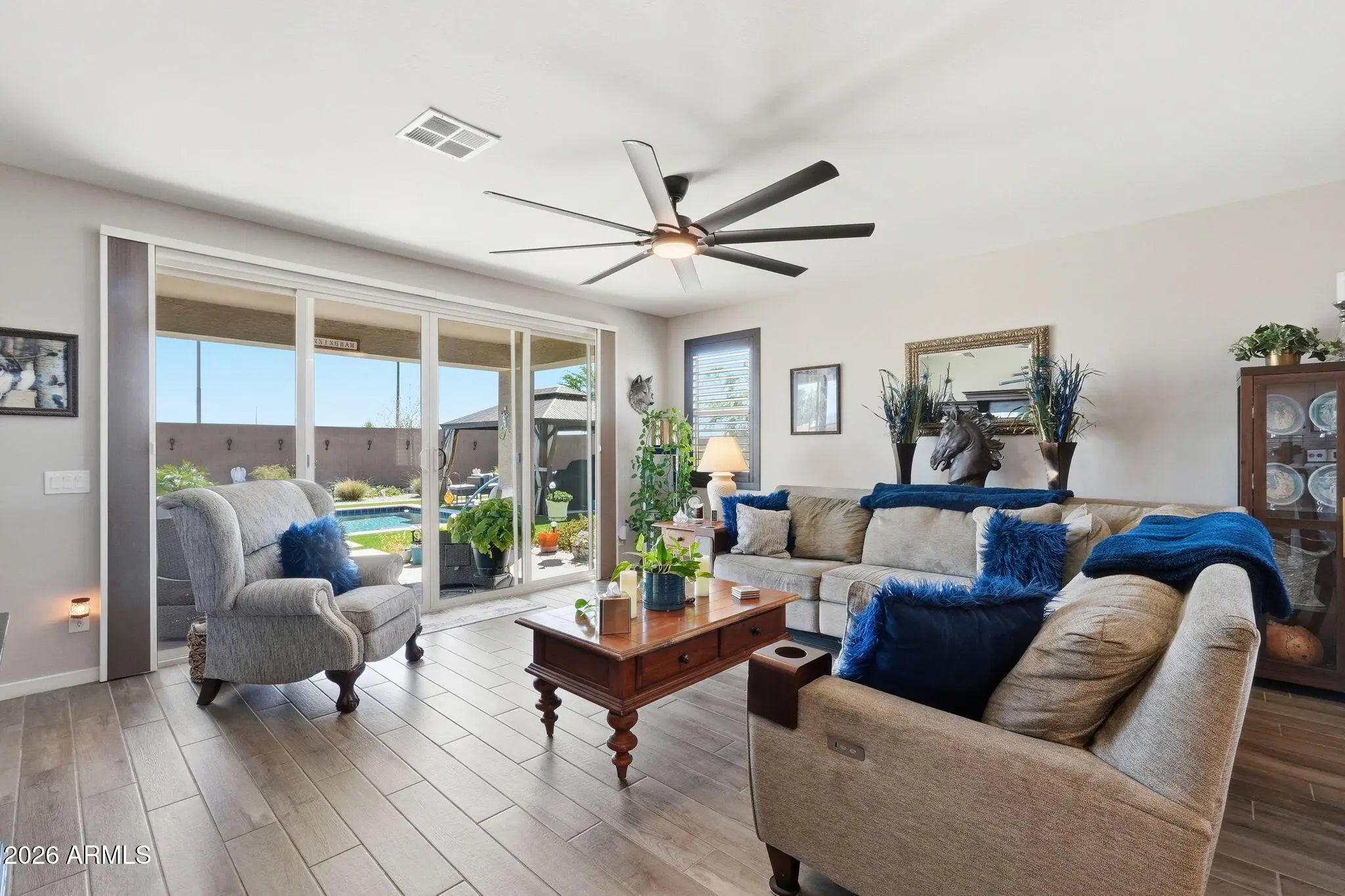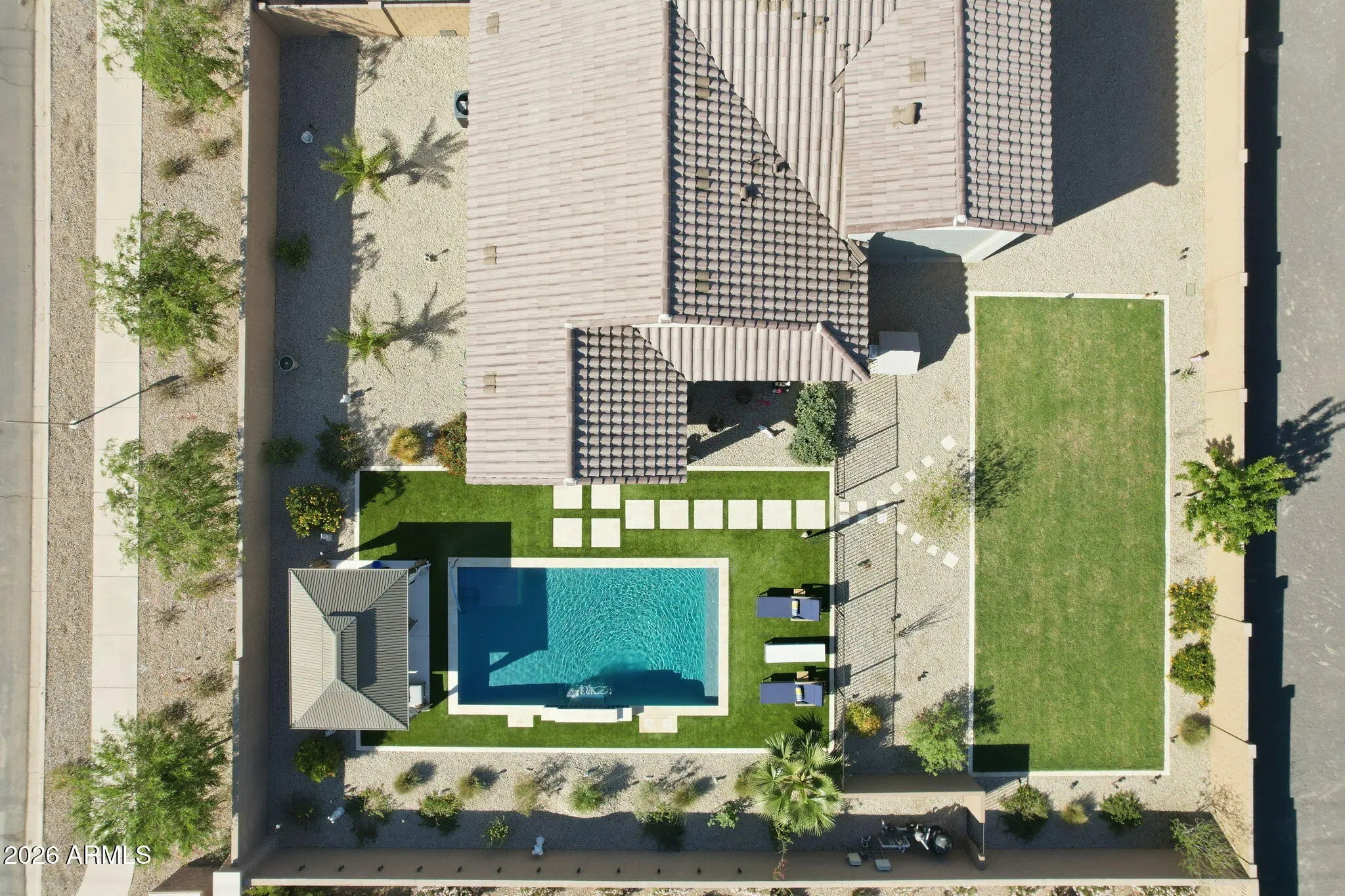 Beautifully maintained and better than new, this one-owner home offers 3 bedrooms, 2 bathrooms, a 2-car garage, and a highly sought-after RV garage with dual access doors, all perfectly situated on a premium corner lot. From the moment you arrive, you'll feel the pride of ownership in this meticulously cared-for home, just over 2 years old. Inside, the open-concept design invites you to gather around the spacious kitchen island, perfect for entertaining friends or enjoying everyday moments. The home is thoughtfully upgraded with plank tile flooring, quartz countertops, plantation shutters, and oversized ceiling fans in both the living room and primary suite for added comfort and style. A double sliding glass door seamlessly connects the indoor living space to the backyard, enhancing the home's light, openness, and true indoor-outdoor lifestyle. Step outside to your private backyard oasis, where every detail has been designed for relaxation and entertaining. Enjoy the stunning in-ground pool with a tranquil waterfall feature, surrounded by travertine tile, artificial turf for easy maintenance, and a beautiful ramada for shaded outdoor living. A separate fenced and landscaped area with real grass adds versatility and is ideal for pets or play. The RV garage with doors on both ends, along with an RV gate, offers exceptional functionality and convenience for all your toys and storage needs. Unwind in the evenings with beautiful mountain views and Arizona sunsets right from your backyard. Whether you're hosting gatherings or enjoying a quiet night at home, this property truly delivers the best of indoor-outdoor living. This is more than just a home, it's where comfort, quality, and lifestyle come together.