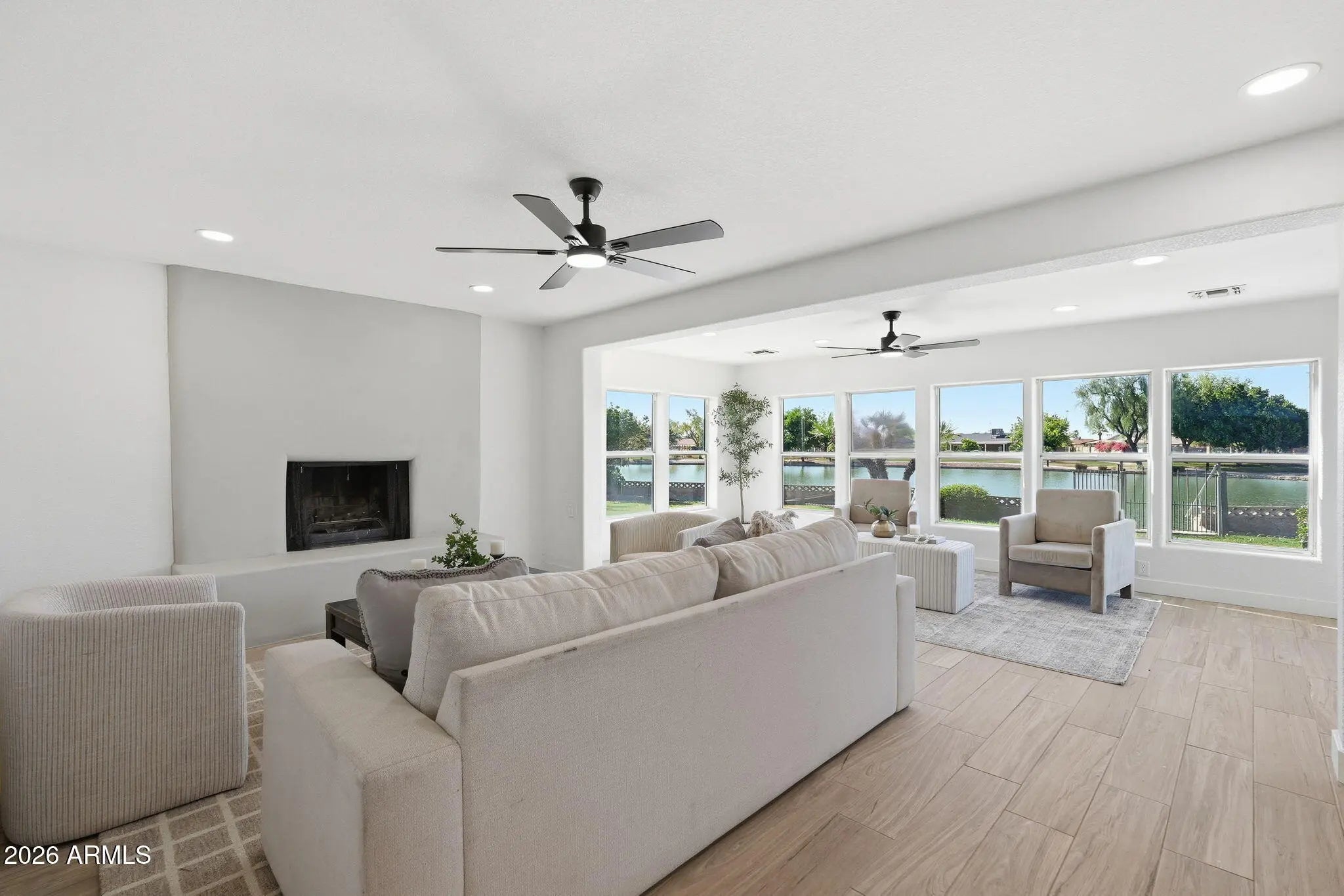 Experience lake front living in this updated move in ready 3 bed, 2 bath in the Dobson Association of Mesa. Newly painted inside and out, with new wood look tile flooring in the main areas and carpet in the bedrooms. The open floor plan provides a separate living room, and a great room that features a wood burning fireplace. The kitchen is complete with new cabinetry, quartz countertops, tiled backsplash, and stainless steel appliances. The primary suite offers a private backyard exit & a ensuite bath with a new vanity and tub/shower surround. Outside awaits a sparkling PebbleTech pool, a large grass area w/ lakefront views. Plus RV Gate!