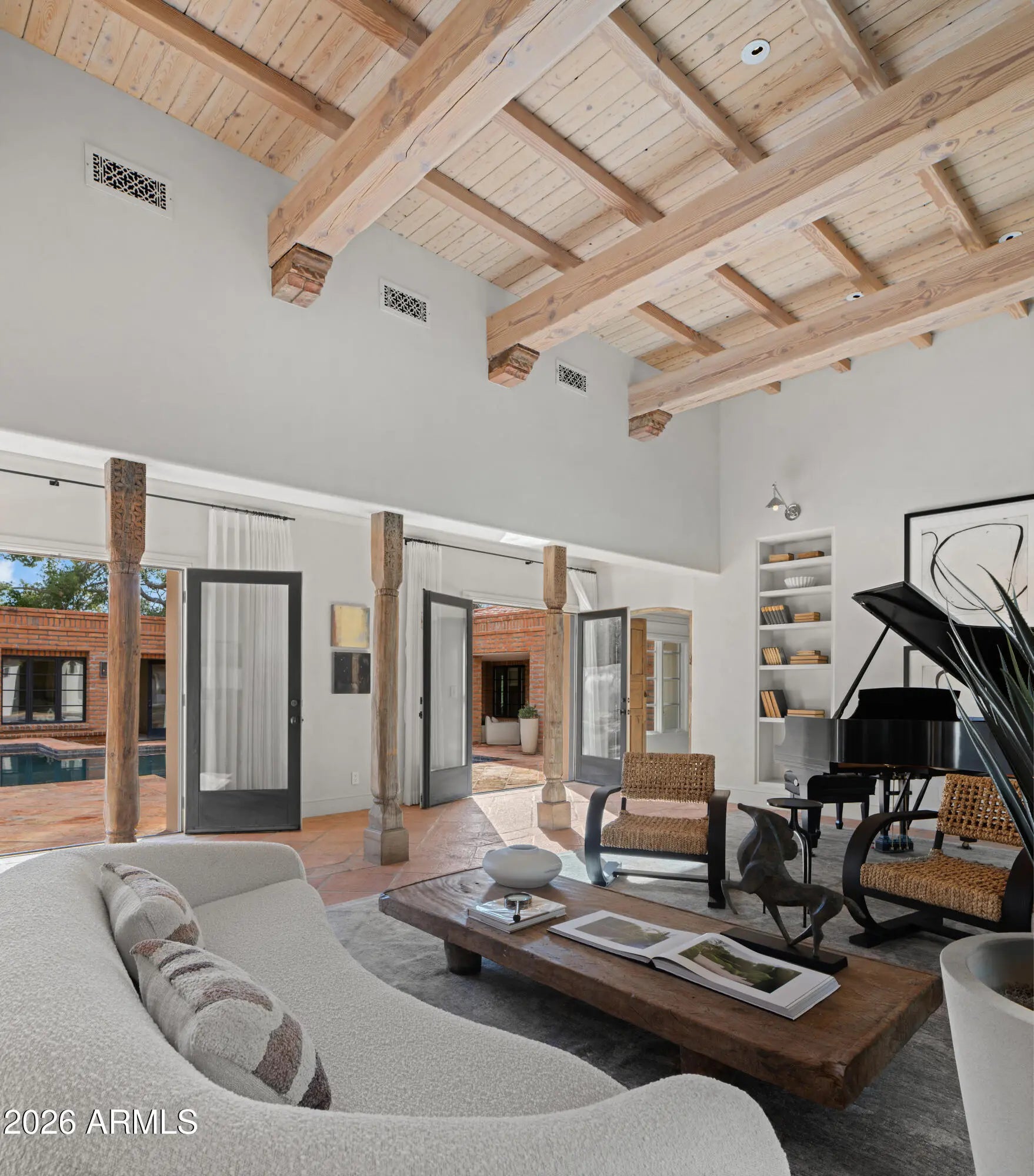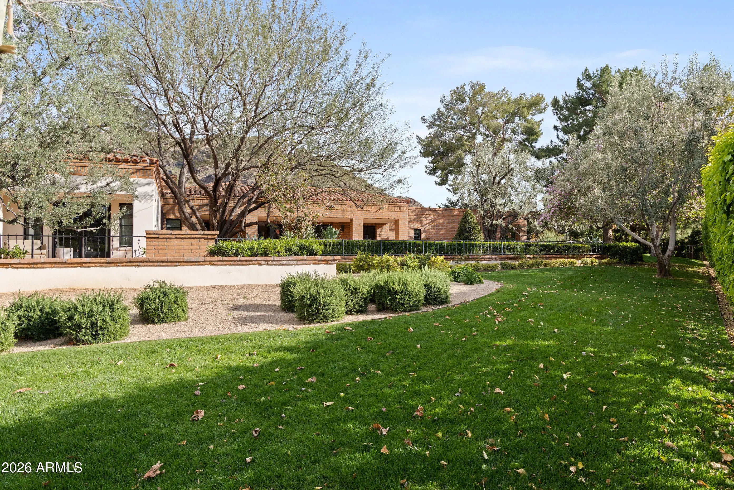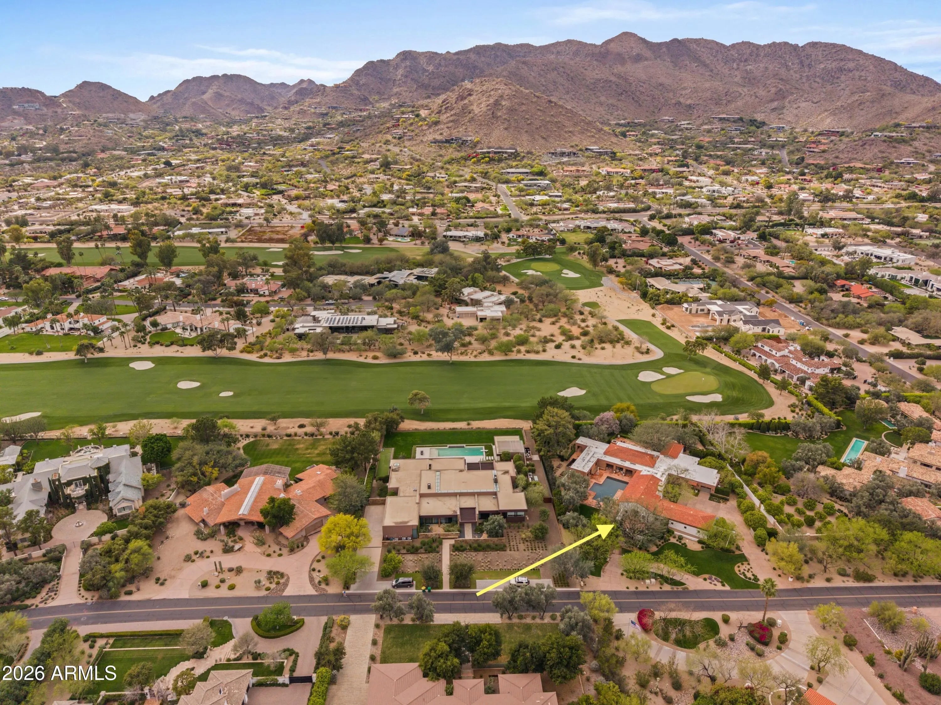 A rare offering on the 4th fairway of Paradise Valley Country Club, this 6604 sf desert/modern - extensively remodeled (GM Hunt 2013) estate blends timeless character with a refined modern edge. Highlighting a private courtyard pool, the home features Saltillo and wood floors, floating beam ceilings, and restored antique doors. Framed by views of Mummy Mountain in the front and the Phx Mountain Preserve beyond, the home sits along the golf course, offering a picturesque setting. The backyard is designed for both entertaining and everyday living, w/multiple patio spaces, expansive lawn, mature trees, and a curated vegetable garden. The primary suite features vaulted ceilings, a spacious bathroom, 2 water closets and large dressing room. The reimagined kitchen showcases mid-century modern... influence with Viking appliances, double ovens, a prep kitchen, and ample storage. Multiple living areas open seamlessly to lush grounds with olive and citrus trees, grass, and a brick patio w/ firepit. Three additional bedrooms, an office/library, 4 car garages + flexible spaces offer versatility. A warm, architecturally rich property in one of Paradise Valley's most coveted locations.