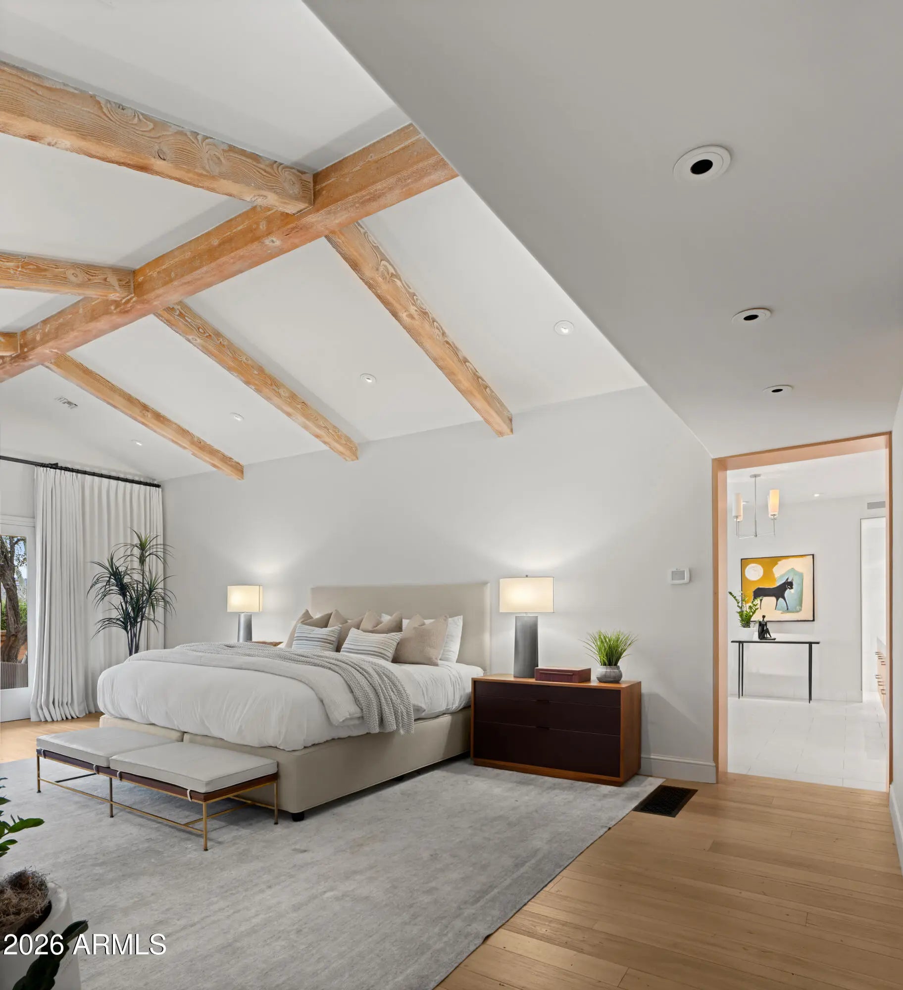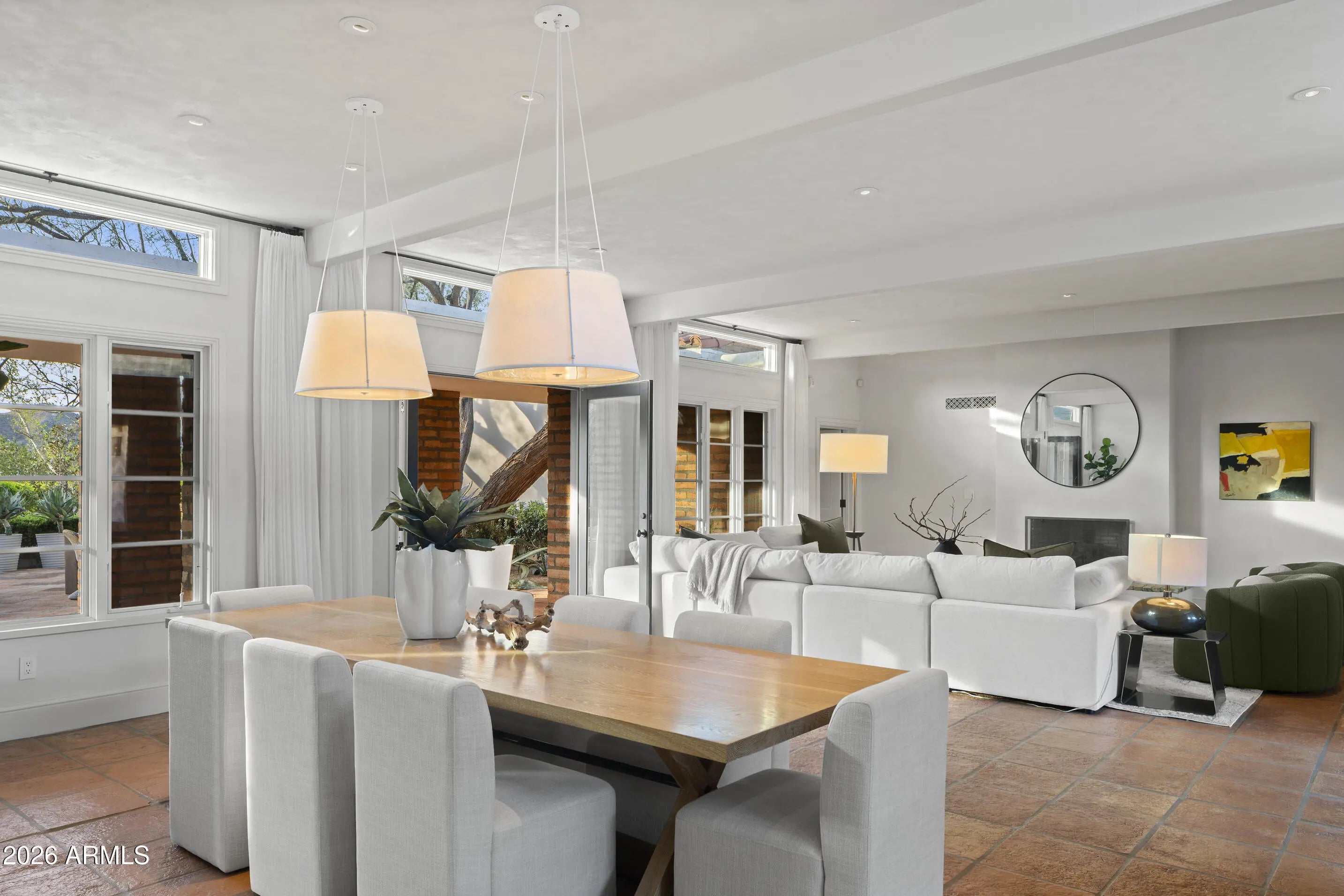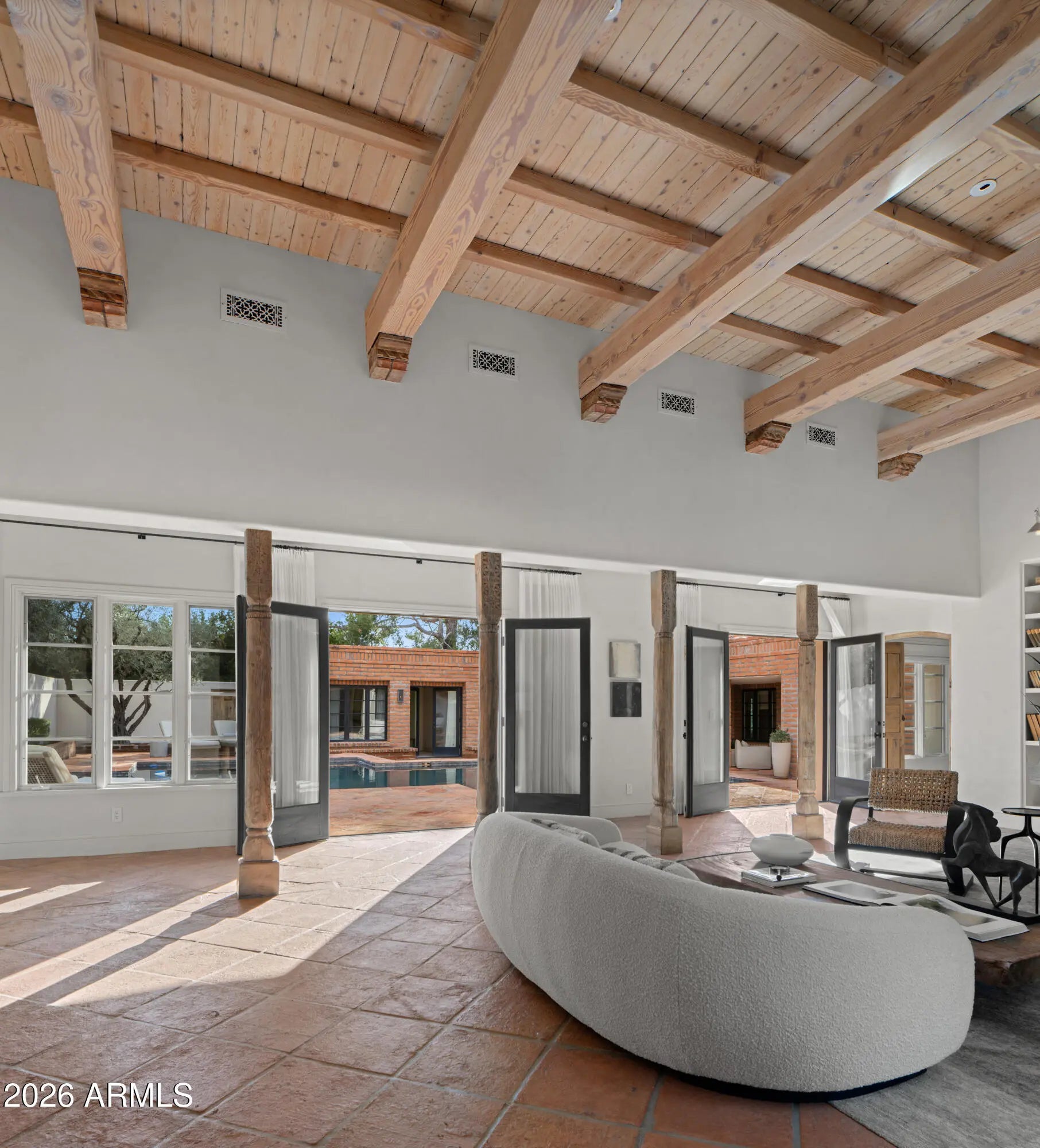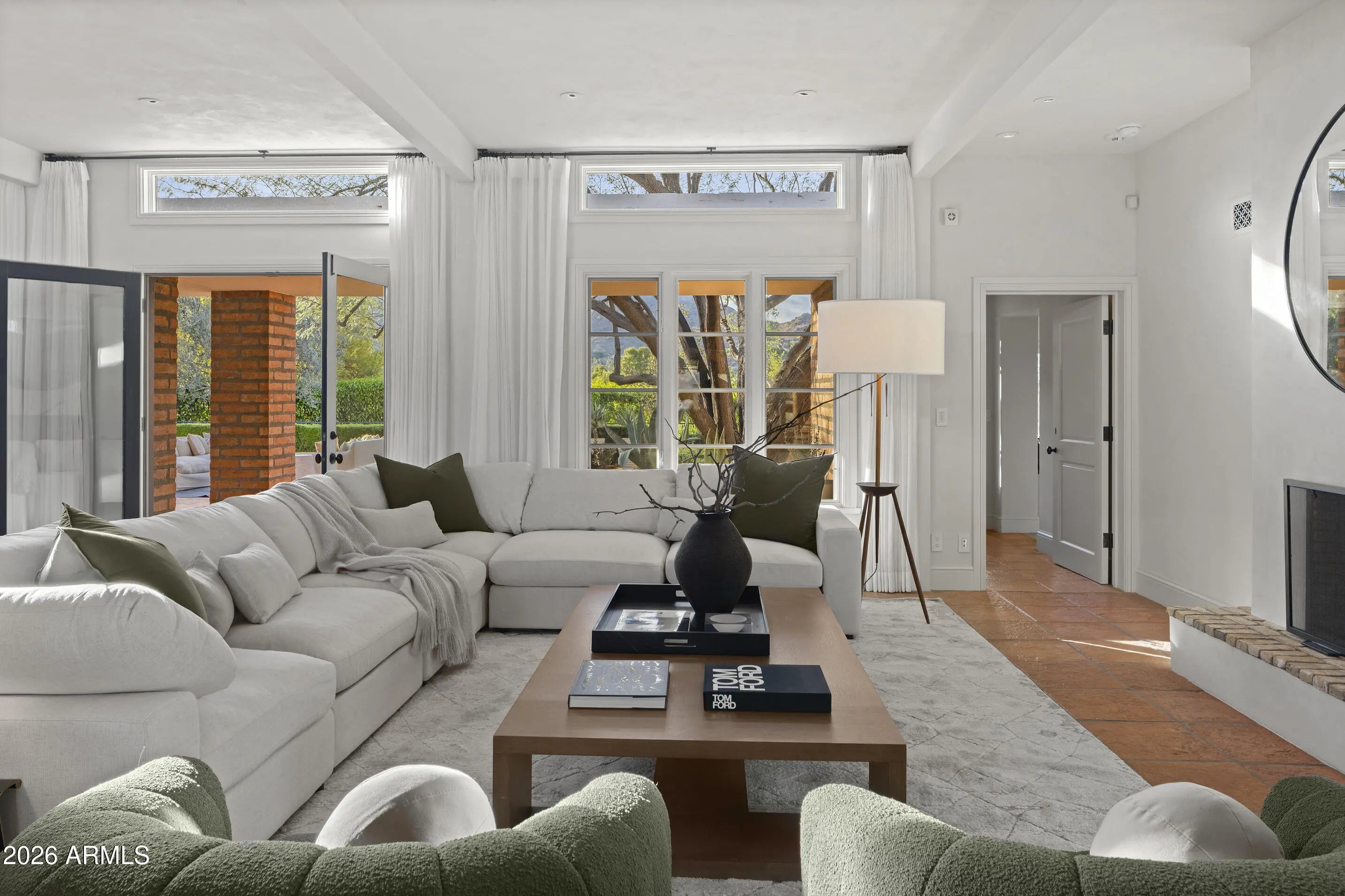 A rare offering on the 4th fairway of Paradise Valley Country Club, this 6604 sf desert/modern - extensively remodeled (GM Hunt 2013) estate blends timeless character with a refined modern edge. Highlighting a private courtyard pool, the home features Saltillo and wood floors, floating beam ceilings, and restored antique doors. Framed by views of Mummy Mountain in the front and the Phx Mountain Preserve beyond, the home sits along the golf course, offering a picturesque setting. The backyard is designed for both entertaining and everyday living, w/multiple patio spaces, expansive lawn, mature trees, and a curated vegetable garden. The primary suite features vaulted ceilings, a spacious bathroom, 2 water closets and large dressing room. The reimagined kitchen showcases mid-century modern... influence with Viking appliances, double ovens, a prep kitchen, and ample storage. Multiple living areas open seamlessly to lush grounds with olive and citrus trees, grass, and a brick patio w/ firepit. Three additional bedrooms, an office/library, 4 car garages + flexible spaces offer versatility. A warm, architecturally rich property in one of Paradise Valley's most coveted locations.