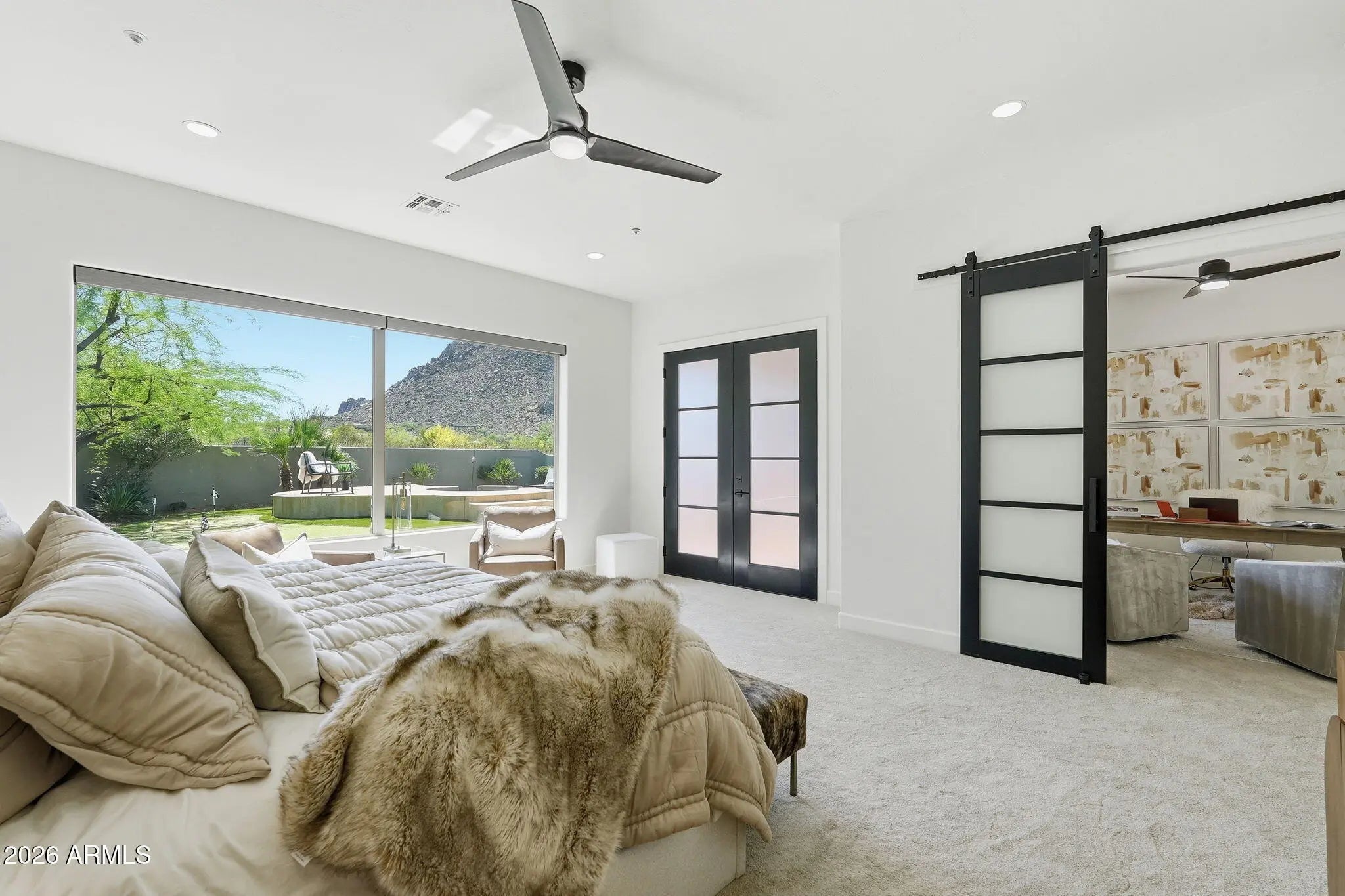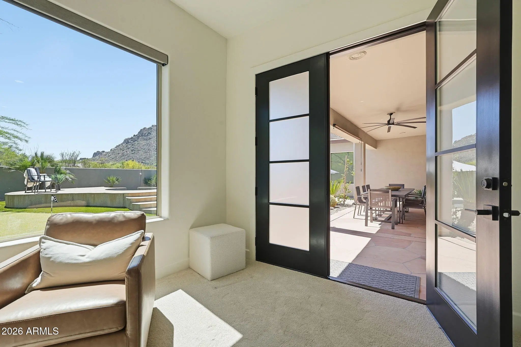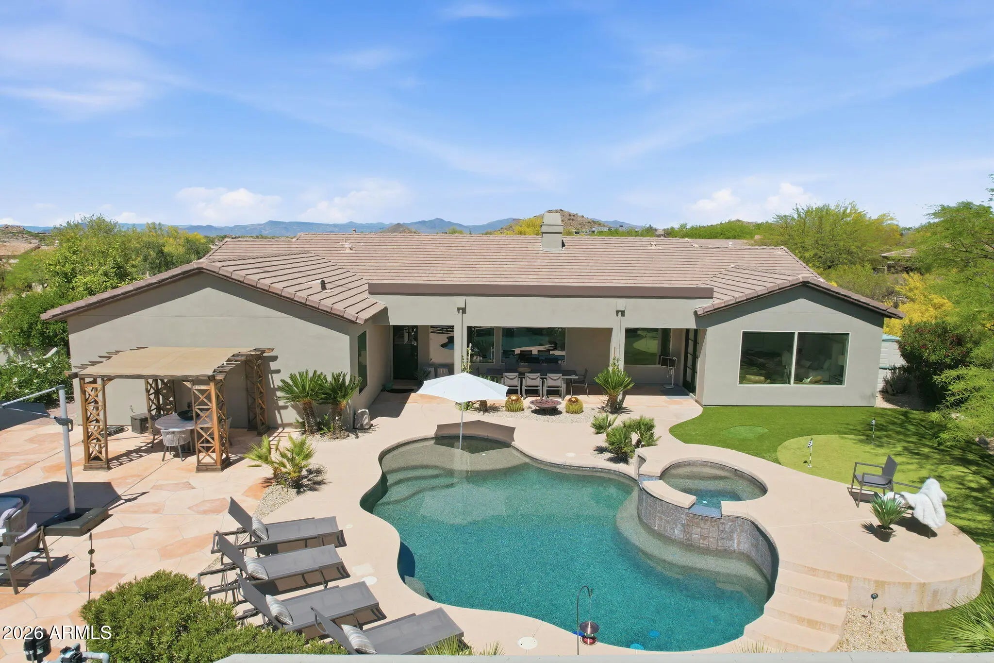 Fully REMODELED luxury estate on a private acre in exclusive gated enclave w/breathtaking MOUNTAIN VIEWS. Reimagined w/top-tier materials & curated designer finishes, this home features a stunning chef's kitchen w/custom cabinetry, quartz counters, gas cooktop, stainless appliances, dual beverage station & large island for elevated entertaining. Great room offers a warm modern living area w/sleek fireplace. Primary suite is a true sanctuary w/ spa-inspired ensuite w/dual vanity, walk-in shower, soaking tub & boutique closet w/washer/dryer, plus private office & backyard access. Three additional well appointed bedrooms, one being en-suite. Formal dining, den & living room add versatility. Resort-style backyard offers a pool/spa, putting green, fireplace, BBQ, multiple seating areas (MORE and covered patio with stunning Mountain views from every angle. A 3-car garage includes one bay currently outfitted as a gym. A home where every detail is INTENTIONAL, every finish is ELEVATED, & every view feels like a MASTERPIECE.