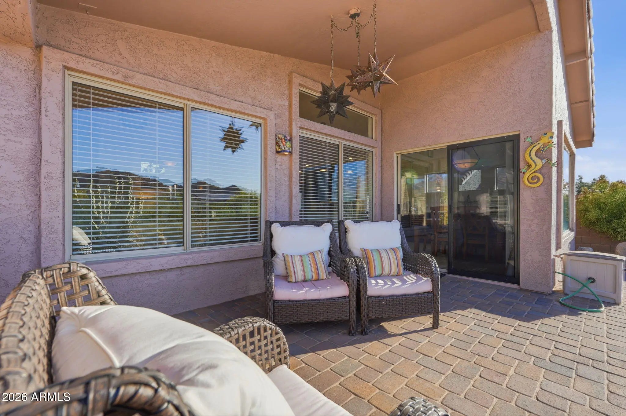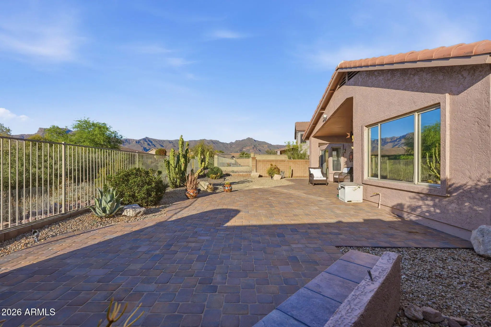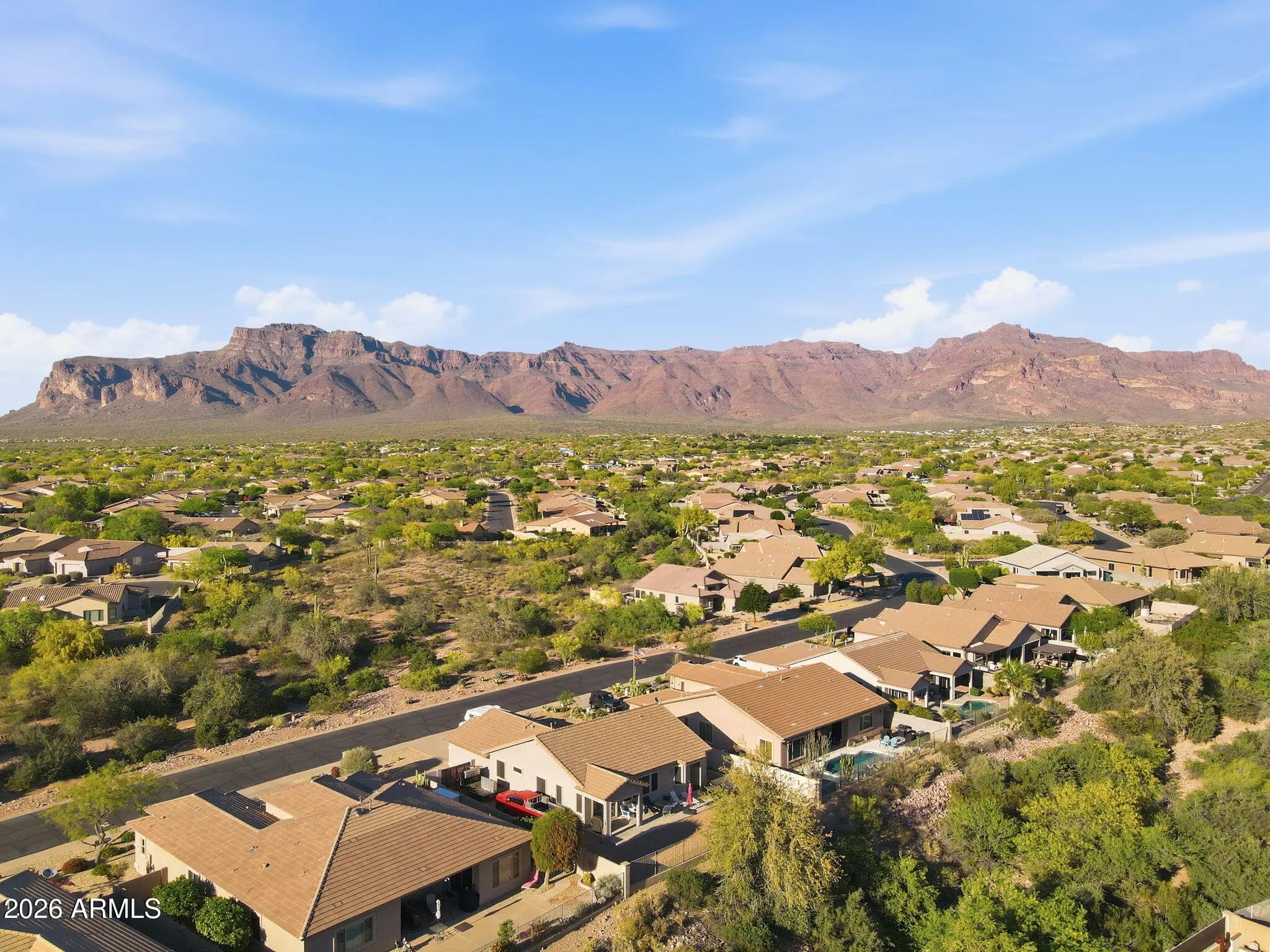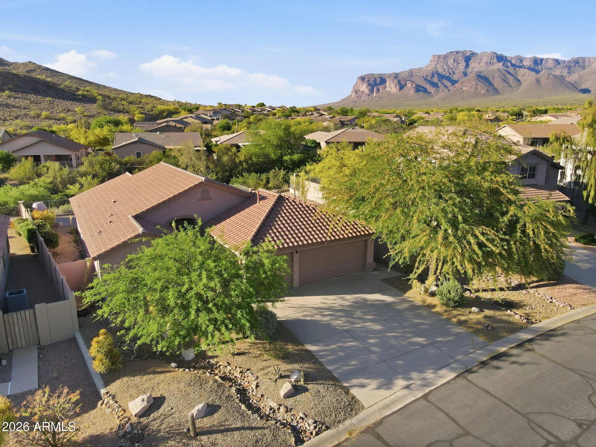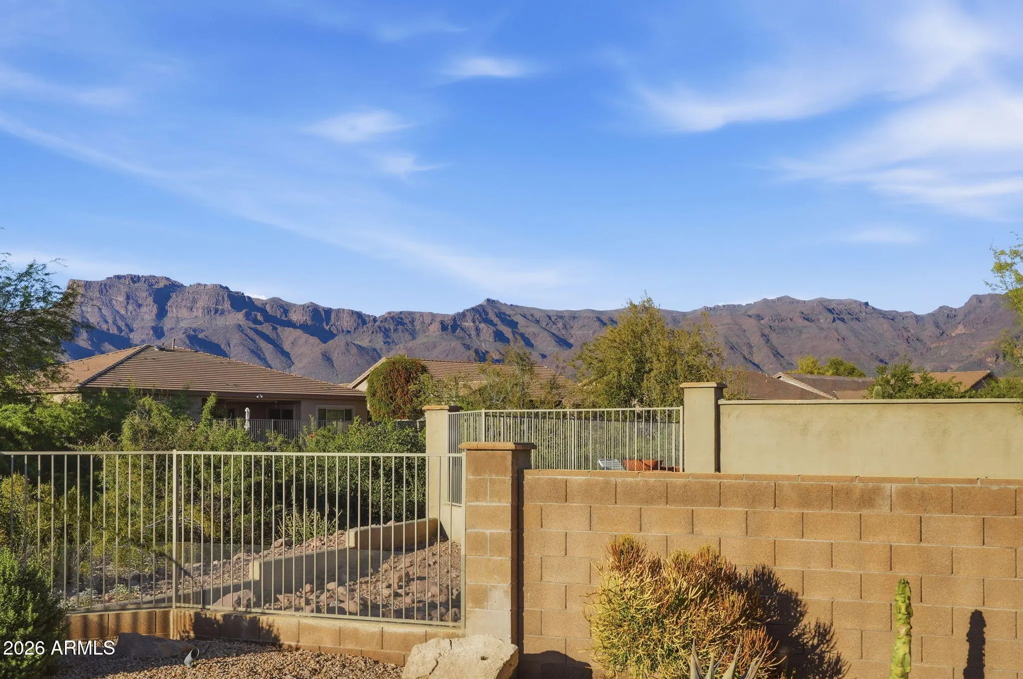 FURNISHED HOME!Quality craftsmanship is evident throughout this stunning home. An impressive private courtyard entry welcomes you into a beautifully designed interior where soaring ceilings and expansive windows immediately capture sweeping Superstition Mountain views. The open floor plan creates a seamless flow, ideal for both everyday living and entertaining. The all-new chef's kitchen is thoughtfully designed with striking slab-veined countertops, beautiful cabinetry with soft-close drawers and doors, stacked shelving, stainless steel appliances, tiled backsplash, under-cabinet lighting, and generous prep space. The kitchen opens effortlessly to the great room and dining area, creating a cohesive and inviting living space. Beautiful tile flooring extends throughout the main living area Beautiful tile flooring extends throughout the main living areas, with comfortable carpeting in the guest suites. The great room overlooks a pristine backyard with sweeping Sonoran Desert and full mountain views, bringing the beauty of the outdoors inside. The primary suite is a private retreat featuring bay windows, a separate exit to the backyard, and a luxurious primary bath complete with executive-height dual sinks, newer cabinetry, slab-veined granite, and an expansive walk-in shower. A large walk-in wardrobe with built-ins completes this exceptional owner's suite. The desirable split floor plan provides privacy for guests, offering two nicely sized bedrooms and a full bathroom with dual sinks. Step outside to a private backyard designed for relaxation and entertaining, featuring a full-length extended patio with brick pavers, a built-in gas kiva fireplace, and breathtaking desert and mountain views. The backyard also includes a convenient gas connection for easy BBQ installation. This home has been meticulously maintained and thoughtfully updated with a new roof, newer HVAC system, exterior paint, water heater, and numerous interior upgrades. Truly move-in ready and priced to sell, this exceptional home should not be missed.