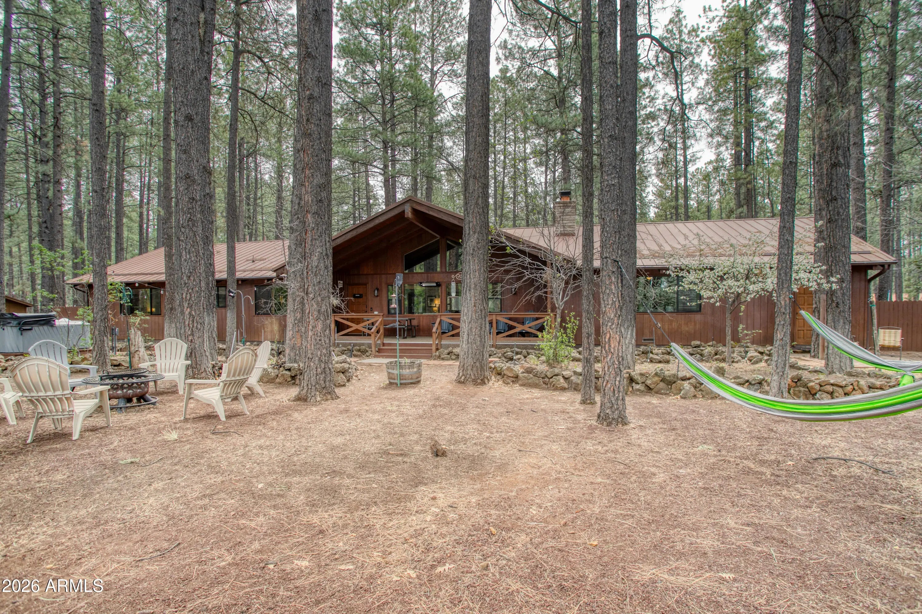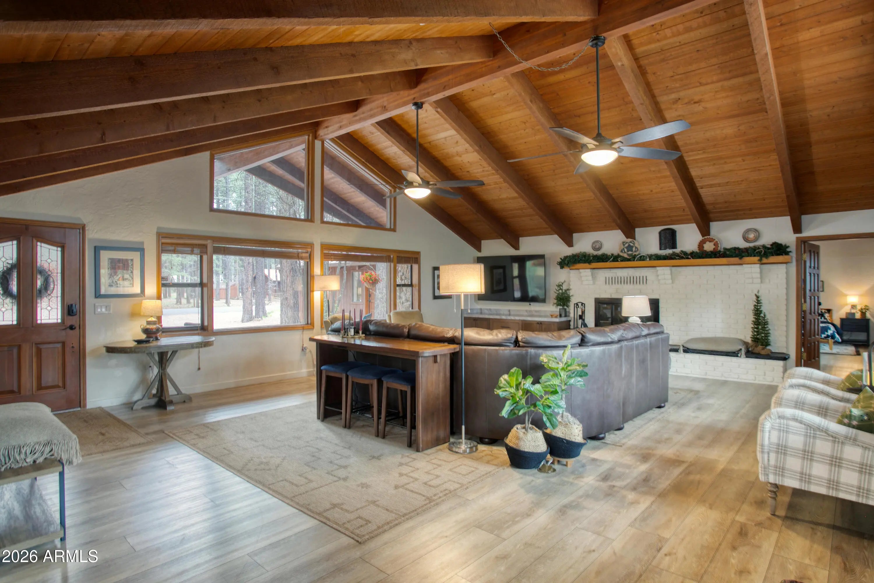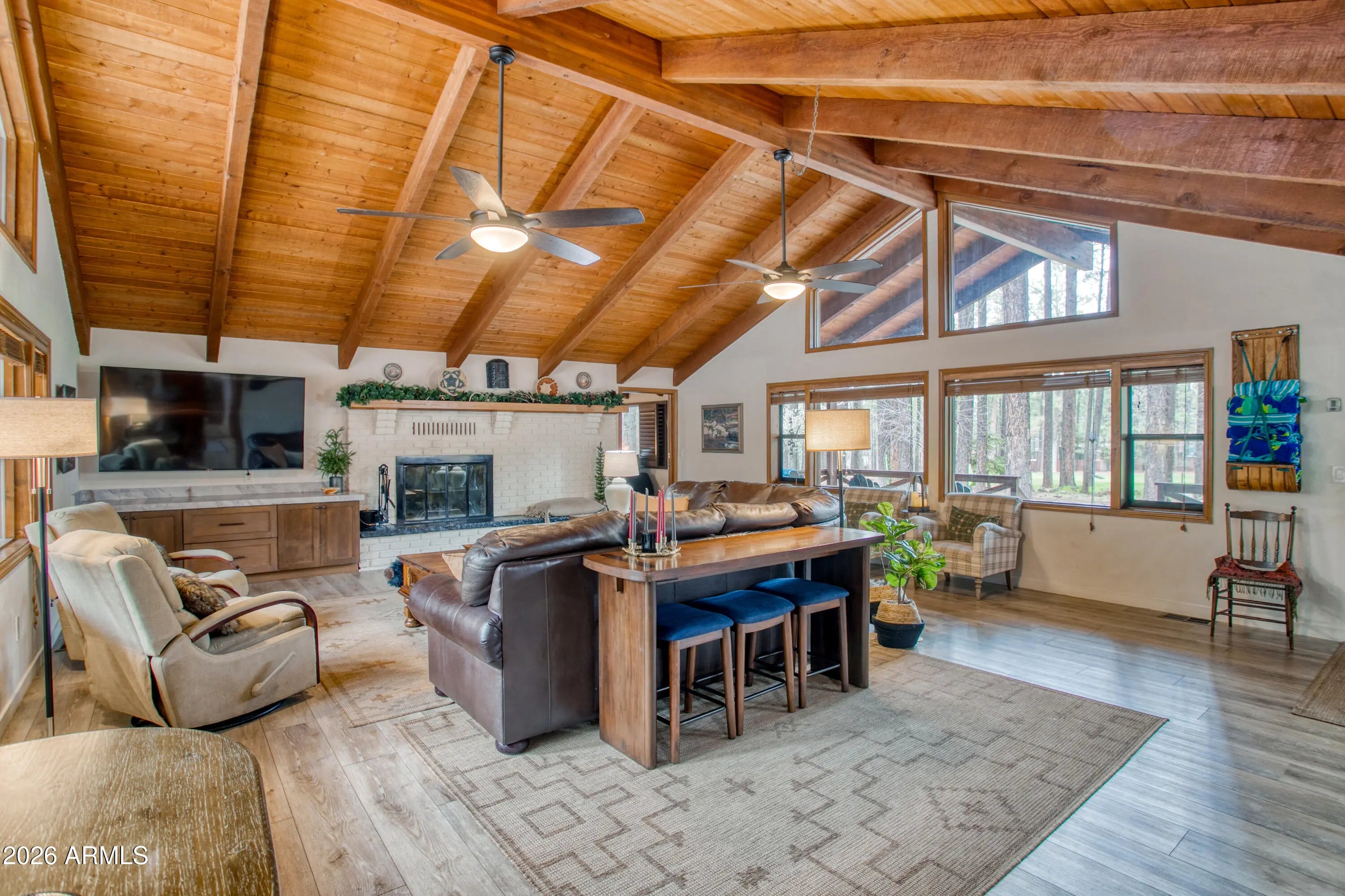 Beautiful REMODELED Ranch on the 17th Fairway of Pinetop Country Club.This 5 bedroom, 4 Beth home offers views of the fairway from your covered patio or hot tub. Recently Remodeled in 2024, new flooring, walnut cabinets, kitchen has quartzite stone counters, builtin microwave with oven, air fryer, etc., LVP throughout home. Energy efficient windows on the golf course side of home. Separate Guest Qtrs with separate entrance. Guest Qtrs feature large great room, large bedroom with King bed and bunk beds, bathroom and kitchenette with mini split for heat and A/C. Main house has vaulted T&G ceiling in Great room and master bedroom, split floorpan, 2 wood fireplaces, new showers, 2 laundry rooms, and a large 2 car garage. Beautiful views in the cool mountain air.