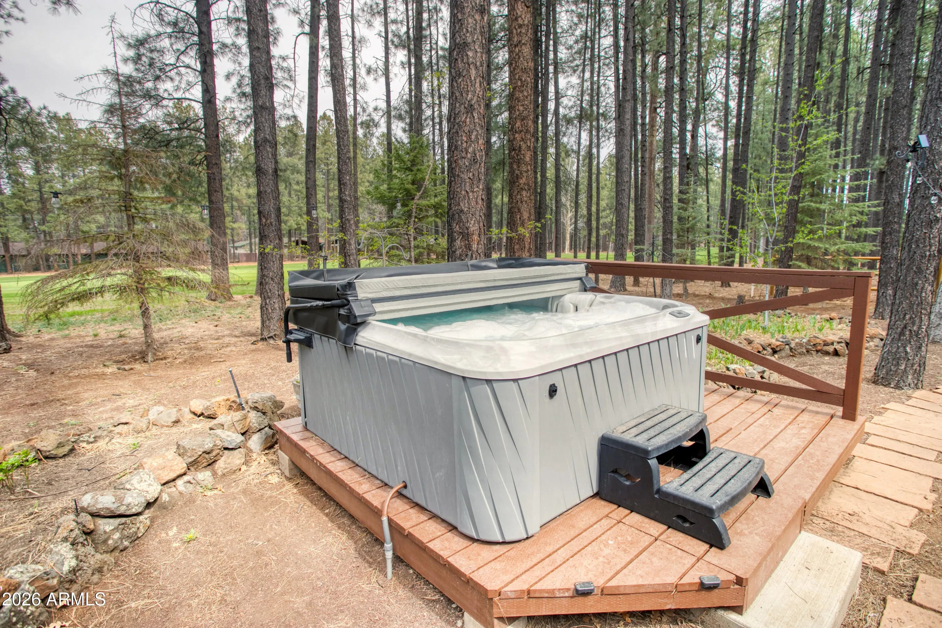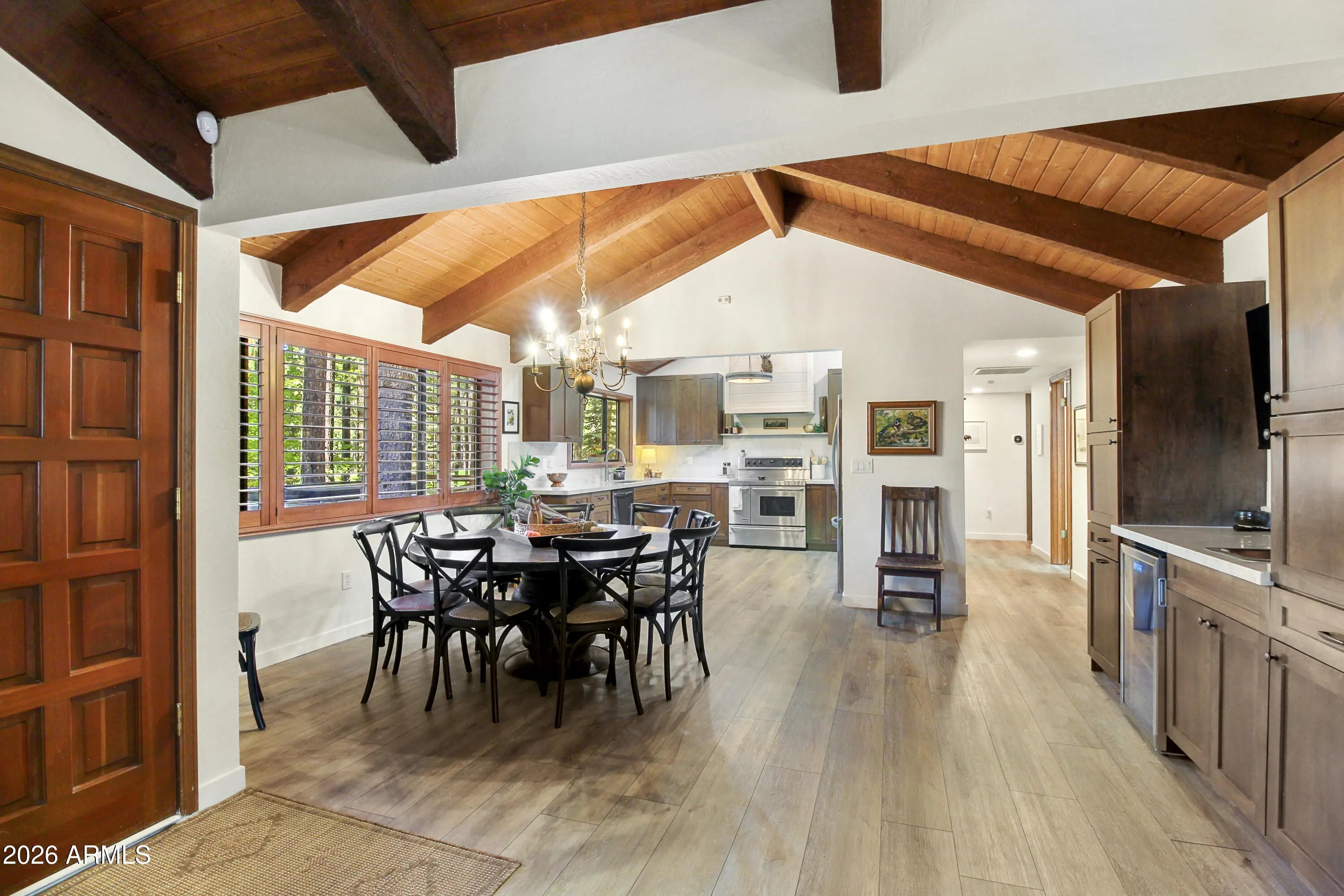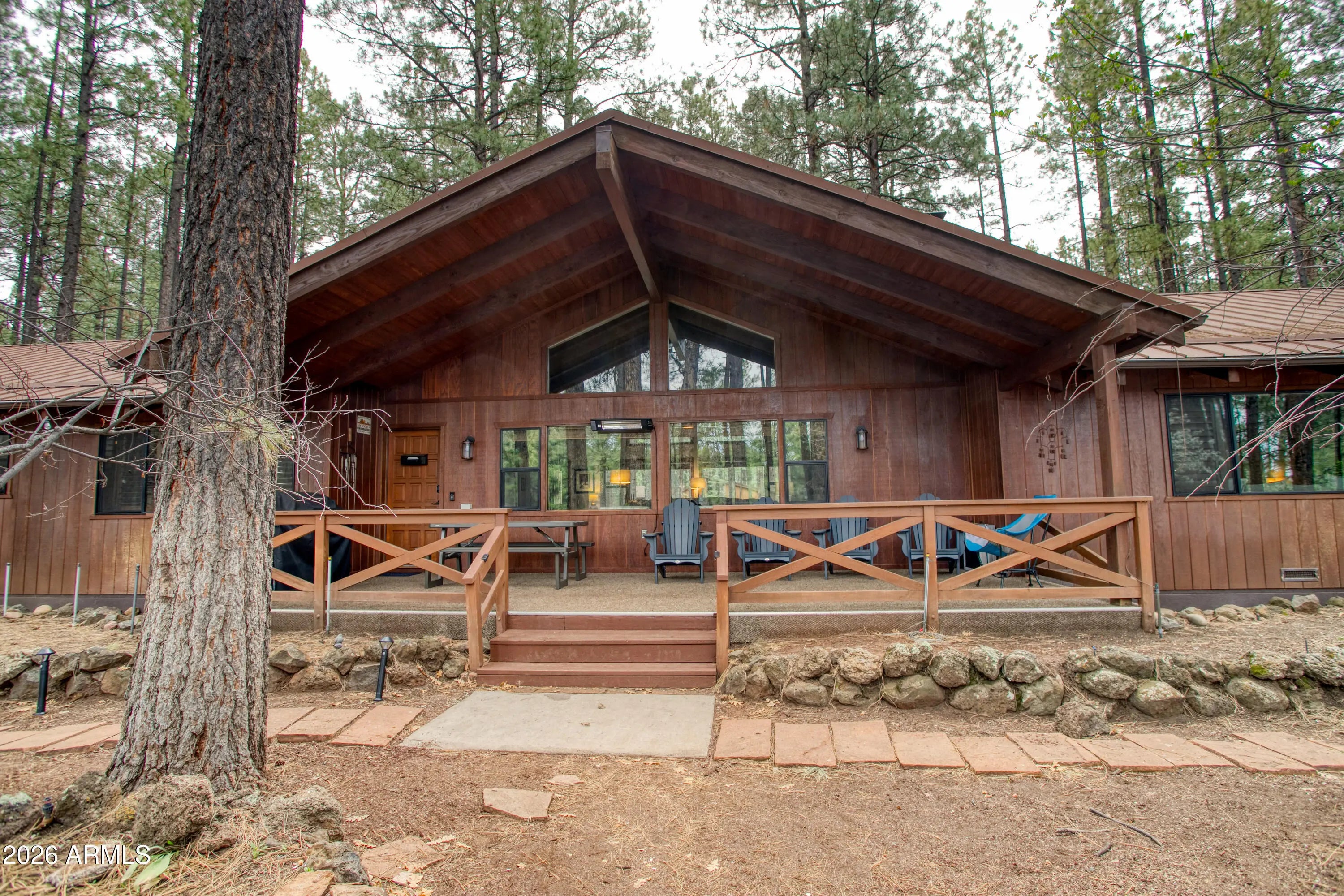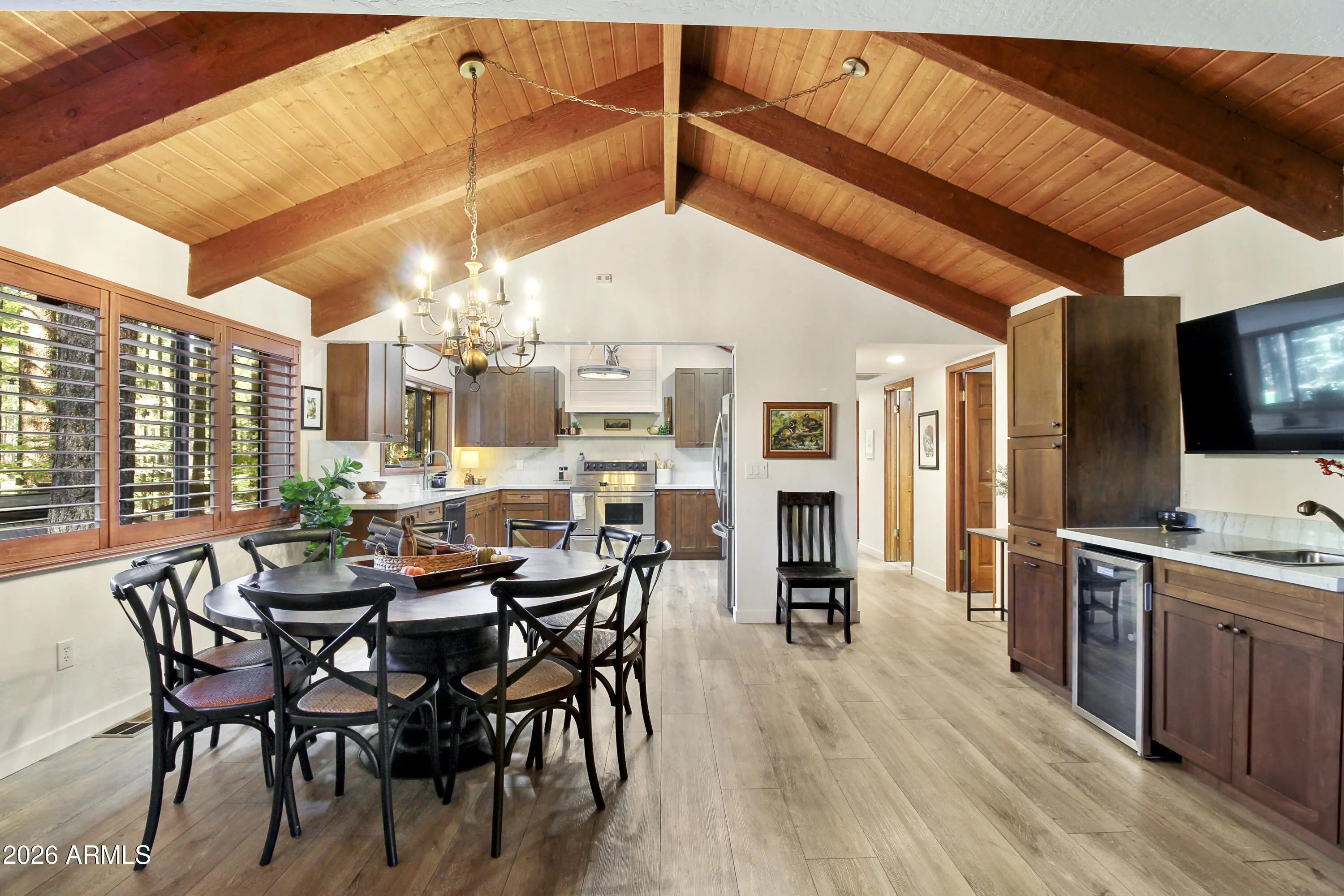 Beautiful REMODELED Ranch on the 17th Fairway of Pinetop Country Club.This 5 bedroom, 4 Beth home offers views of the fairway from your covered patio or hot tub. Recently Remodeled in 2024, new flooring, walnut cabinets, kitchen has quartzite stone counters, builtin microwave with oven, air fryer, etc., LVP throughout home. Energy efficient windows on the golf course side of home. Separate Guest Qtrs with separate entrance. Guest Qtrs feature large great room, large bedroom with King bed and bunk beds, bathroom and kitchenette with mini split for heat and A/C. Main house has vaulted T&G ceiling in Great room and master bedroom, split floorpan, 2 wood fireplaces, new showers, 2 laundry rooms, and a large 2 car garage. Beautiful views in the cool mountain air.
