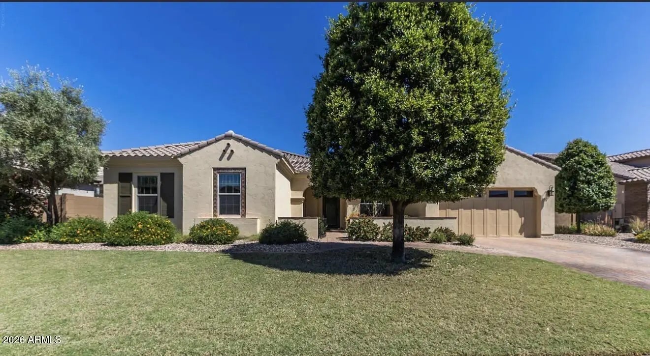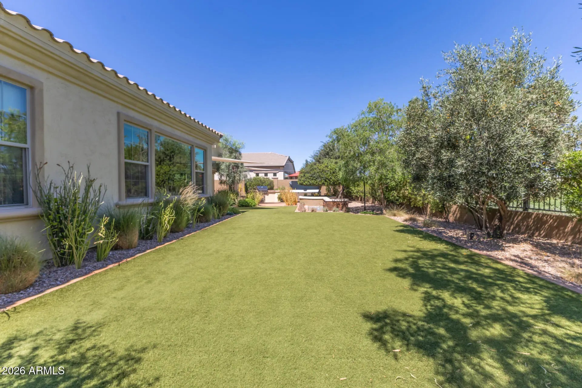 Former model home in gated Cantabria, South Chandler, loaded with designer upgrades and a bright, open layout. Chef's kitchen with premium appliances and oversized island flows seamlessly into the main living space, perfect for entertaining. Dedicated office and flex teen space add versatility. Step outside to a private backyard retreat featuring a built-in BBQ, water feature, and 7-person hot tub, all set against lush green space with no neighbors behind. Walking distance to elementary schools and located in the top-rated Perry High School zone. Luxury, privacy, and lifestyle all in one.