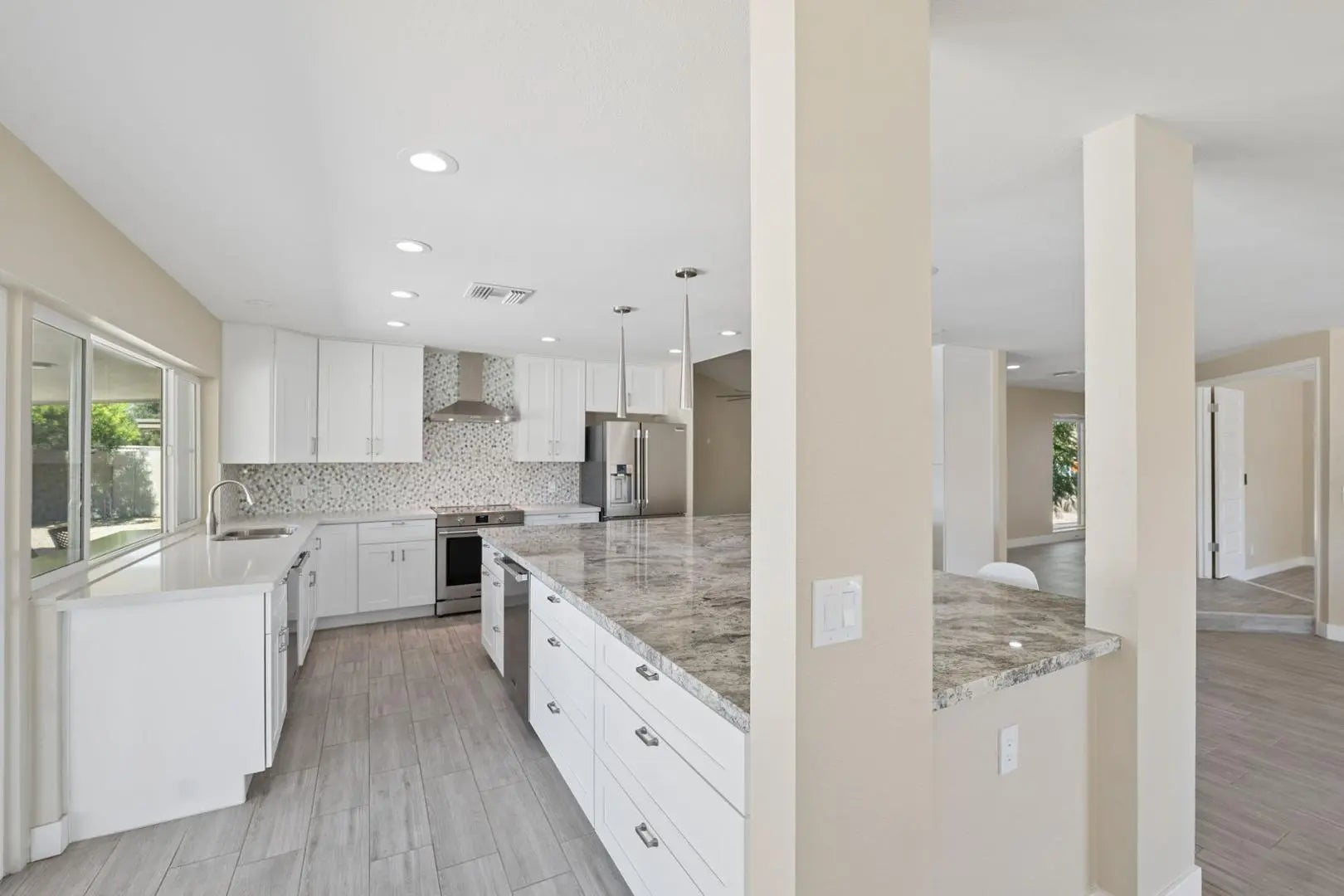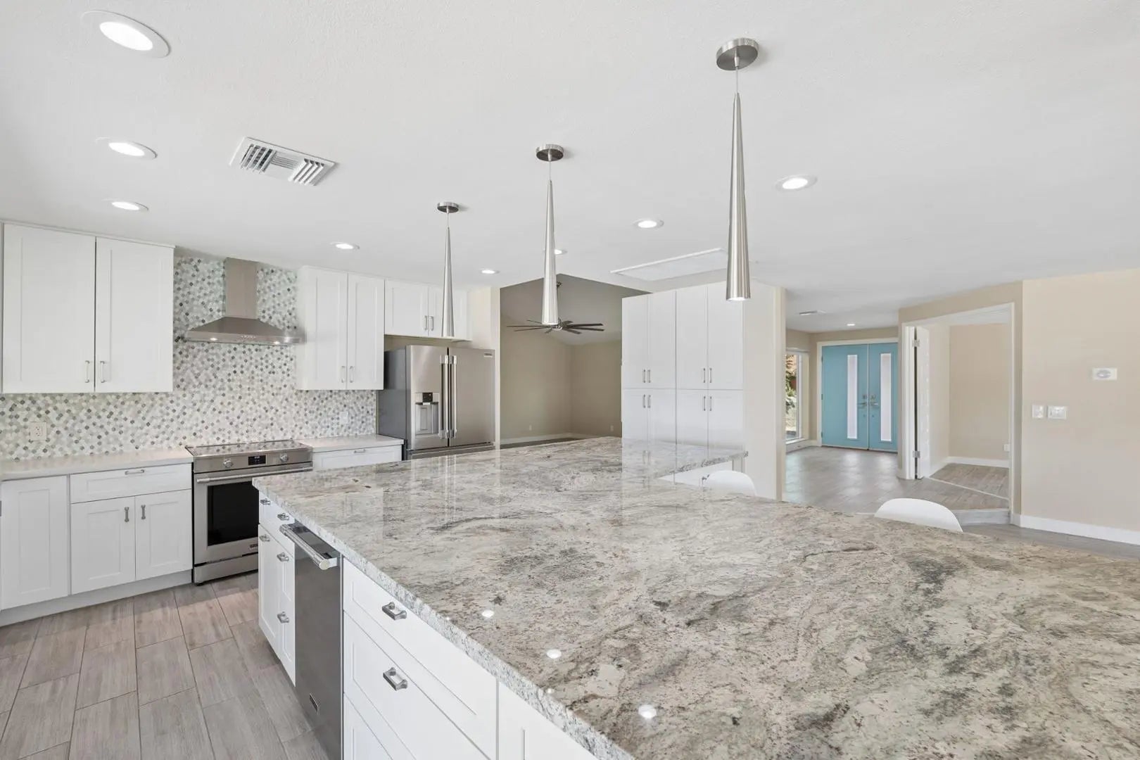 Vaulted Ceiling(s), Non-laminate Counter, Granite Counters, Master Downstairs, Kitchen Island, Pantry