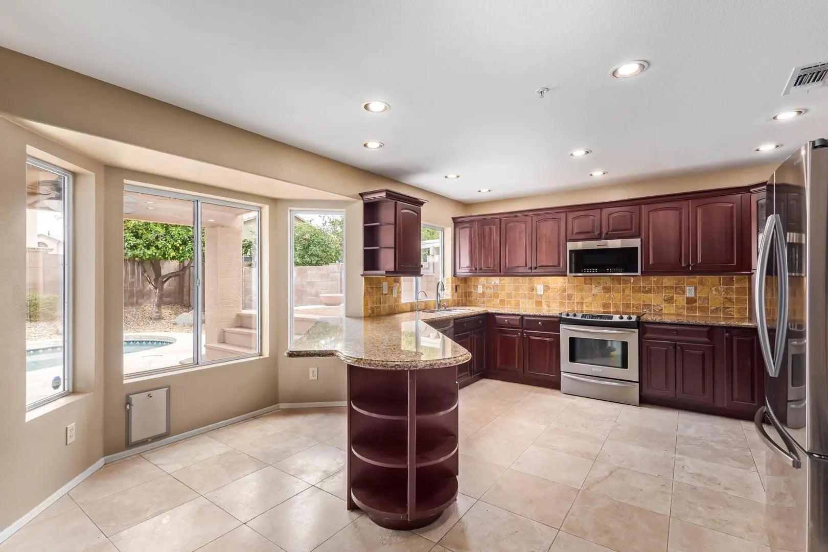 BEAUTIFULLY UPDATED HOME IN DESIRABLE DESERT SHADOWS COMMUNITY IN NORTH SCOTTSDALE. NEWER KITCHEN CABINETS WITH STAINLESS STEEL APPLIANCES, SLAB GRANITE COUNTERS AND TUMBLED STONE BACKSPLASH. LOWER LEVEL FLOORS ARE 18'' TRAVERTINE, UPPER LEVEL FLOORS ARE HARDWOOD LAMINATE. LOVELY BACKYARD WITH POOL AND COVERED FLAGSTONE PATIO WITH OUTDOOR EATING BAR. EXTRA LARGE GARAGE WITH GREAT STORAGE. POOL SERVICE AND LANDSCAPING SERVICE INCLUDED.