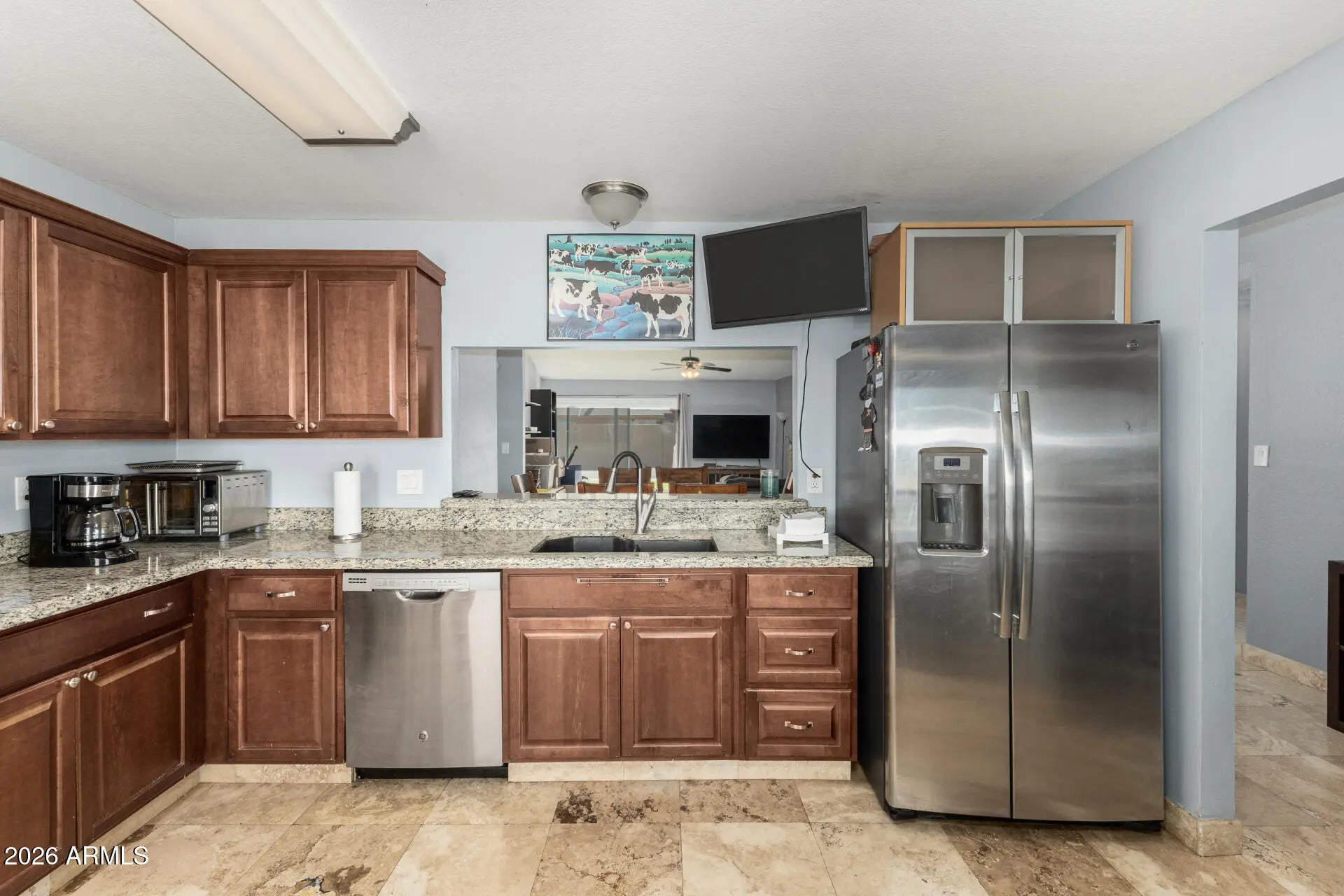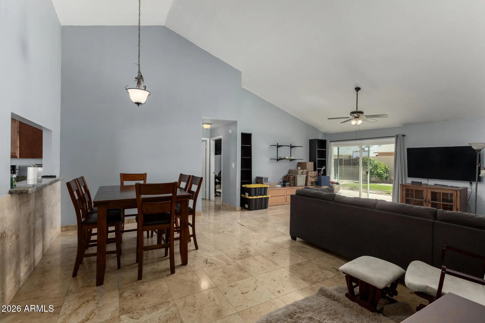 This charming 3-bedroom, 2-bath residence is the one you've been searching for! You'll be delighted by the spacious feel of the living room, featuring soaring vaulted ceilings, a soothing palette, stone-tile flooring, and an inviting fireplace for relaxing evenings. The gourmet kitchen comes with granite counters, ample wood cabinetry with crown moulding, stainless steel appliances, a pantry, and a serving window with a breakfast bar. The primary bedroom includes a private bathroom with dual sinks and a walk-in closet for an organized wardrobe. Enjoy peaceful afternoons in the backyard, which offers a covered patio, lush grass, an RV gate leading to the alley, and ample space for outdoor relaxation. Don't miss out on this fantastic opportunity!