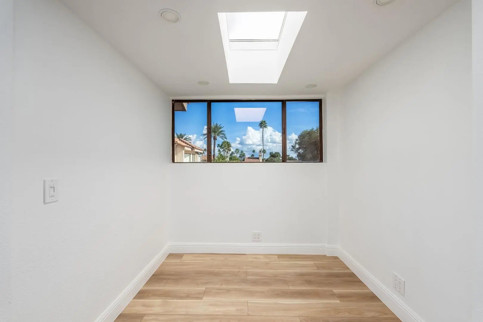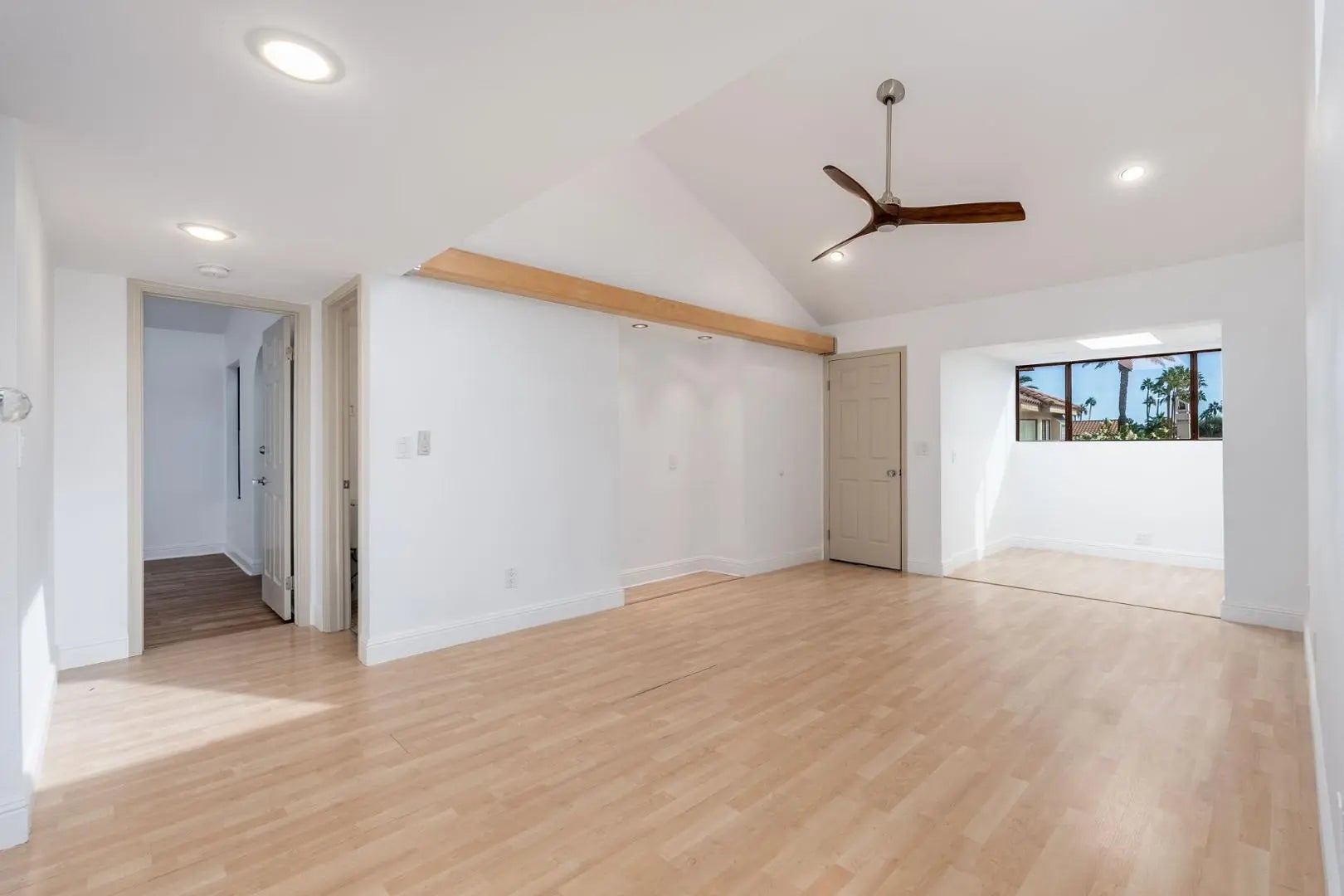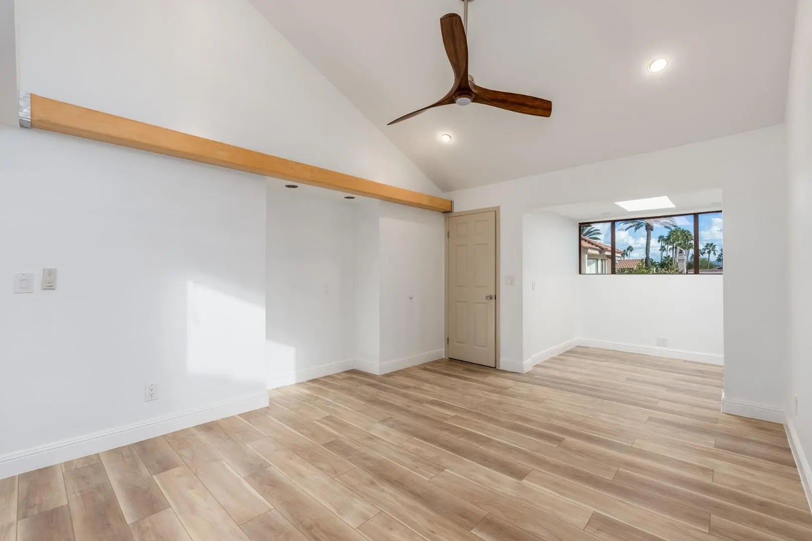 This amazing townhouse offers villa-style living within The Racquet Club; a gated community featuring resort-style amenities. The home showcases a dual primary bedroom floor plan with an upstairs entrance through a spacious front patioperfect for relaxing or entertaining. Inside, the kitchen boasts dark wood cabinetry, stainless steel appliances, and a convenient breakfast bar. Brand new vinyl-wood flooring, vaulted ceilings, and skylights create a bright and open ambiance throughout. The primary suite includes an upstairs loft that opens to a private rooftop deckideal for enjoying extended views or peaceful outdoor lounging. Community amenities includes clubhouse, swimming pool & spa, tennis courts, pickleball, fitness center and more.