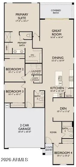 Brand new community in Surprise! This stunning single story home offers 2,071 sq ft of functional living space. It features 4 bedrooms, 3 bathrooms, den, and a 2-car garage. The open concept kitchen is perfect for entertaining and features an Island, a walk-in pantry and stainless steel appliances. It also offers our Harmony Collection which includes white 42'' cabinets, biancone quartz kitchen countertops, white gloss tile kitchen backsplash, and 8x36 wood looking plank tile in all the common areas. The great room offers a 4-panel center sliding glass door so you can step out into your covered patio to enjoy indoor/outdoor living in your backyard with friends and family. The primary suite has a spacious walk-in closet, double sinks, walk-in shower, and an additional linen closet for extr storage. This home also features a soft water loop, interior blinds, and all appliances included making it move in ready! Located in North Copper Canyon with resort-style amenities and easy access to the 303!