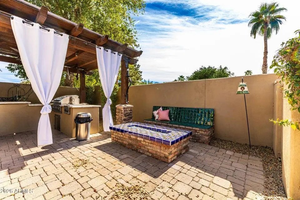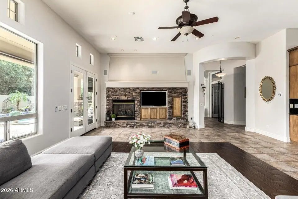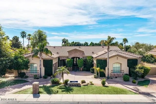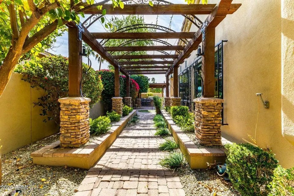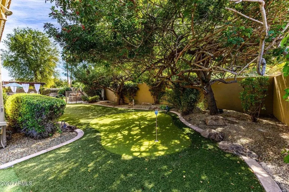 Gated Monteloma residence featuring 4,626 sq ft of living space on a 0.39acre lot. Built in 2002, this single story home offers 4 bedrooms and 3.5 bathrooms with a thoughtful floor plan that includes an office, formal living and dining rooms, a family room, and a large media room / game / bonus room with a stone fireplace. perfect for both everyday living and entertaining. The gourmet kitchen boasts extensive storage, gas cooktop, double ovens, KitchenAid appliances, a wine cellar, and a breakfast bar, while warm brick accents and tile floors with the look of handscraped hardwood add character throughout. A private primary suite features a luxurious his and hers bathroom. Outdoors you'll find a low maintenance, English inspired yard with gardens, fruit trees, a heated pool, covered patio, outdoor kitchen, firepit, putting green, basketball court and grassy areas. offering a true Arizona oasis. Additional highlights include a 3car garage with RV access and EV charger, security and misting systems. This property combines spacious, light filled interiors with resort like outdoor living in a highly desirable Scottsdale neighborhood.