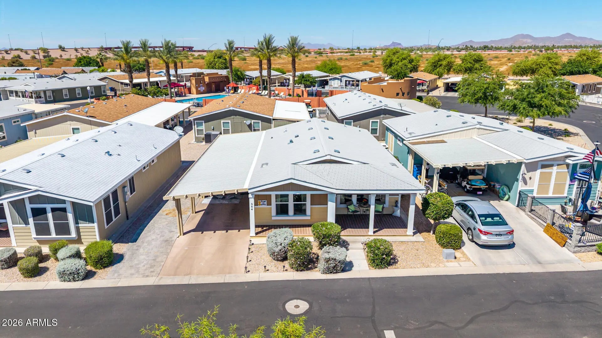 Welcome to Monte Vista Village Resort, a vibrant 55+ active-adult gated community. Perfect blend of comfort, convenience, & community! This meticulously maintained 2018, 2B/2BA residence features updated LVP flooring, a cozy front porch, carport parking & an Arizona Room w/a new mini-split perfect for a workshop or flex space. The open layout offers vaulted ceilings, abundant natural light, & a neutral palette. The eat-in kitchen features matching appliances, recessed lighting, staggered wood cabinetry, & a two-tier island w/breakfast bar. The spacious primary suite includes a walk-in closet & private bath with dual sinks. Located in a vibrant resort community offering pools, pickleball, tennis, softball, fitness center, & dog parks, w/easy access to the Loop 202.