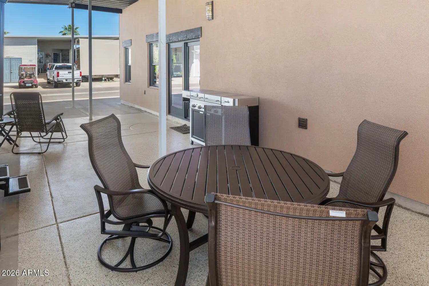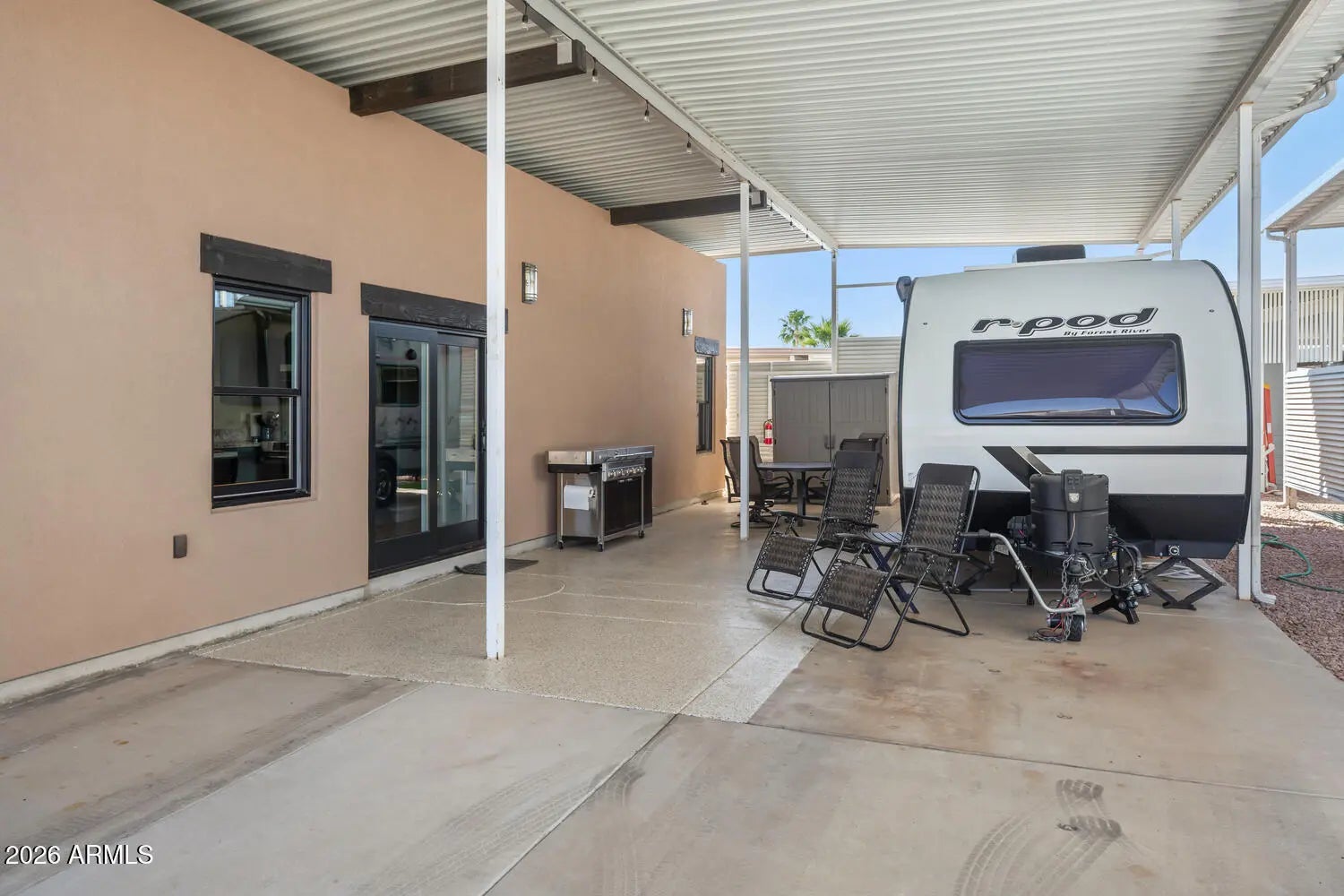 MOVE IN READY! This is a spacious RV lot with a 3-year-new stick built AZ home. This home has a plethora of upgrades to include Anderson mirrored-tinted windows, R19 walls, R38 ceilings, 9' ceilings, granite counter tops, mini-split HVAC, ''Zip'' sheathing system, & a fresh air exchanger. Kitchen includes Frigidaire appliances. The covered RV port is 12 feet in height with plenty of room for an outdoor patio. GOLF CART (with 1 yo lithium batteries) & OUTDOOR BBQ ARE INCLUDED! Happy Trails RV Resort is a 55+ active adult, guarded community featuring an on-site restaurant, post office, low HOA dues, & NO LAND LEASE! Experience AZ living and a vibrant social scene. This is more than a home - it's a lifestyle! Conveniently located in Surprise, AZ near shopping, medical, golf, sports, & more.