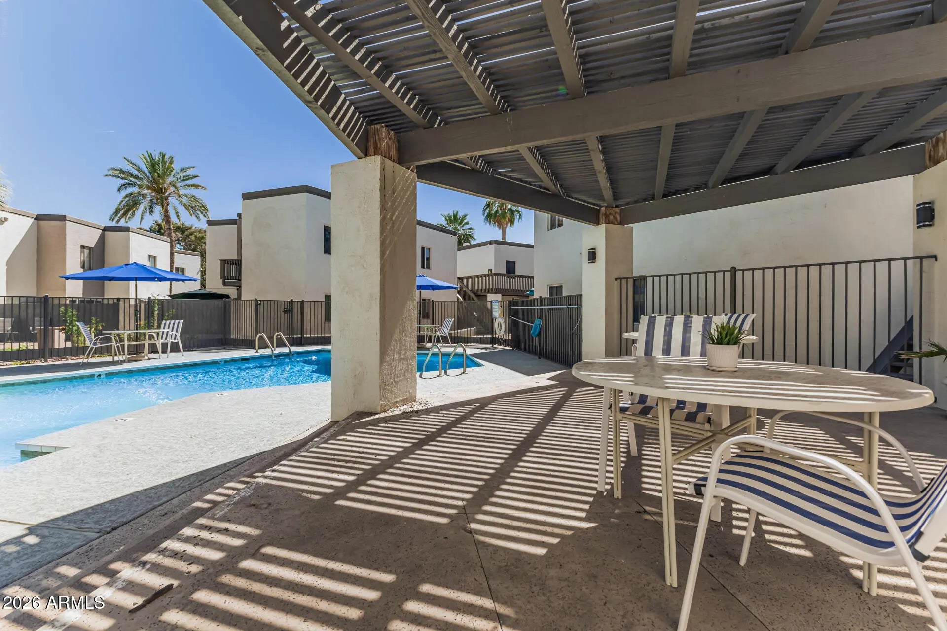 Amazing central Phoenix location within walking distance to some of the best restaurants in town. 2 bedroom, 2 bath, first floor condo in updated Los Blancos that offers 2 community pools and 2 community laundries. Open concept floorplan with updated kitchen offering stainless appliances. Private gated outside patio. One covered parking space close to unit #5. Community is currently updating the grounds with new landscaping and real grass. HOA covers AC/Heat