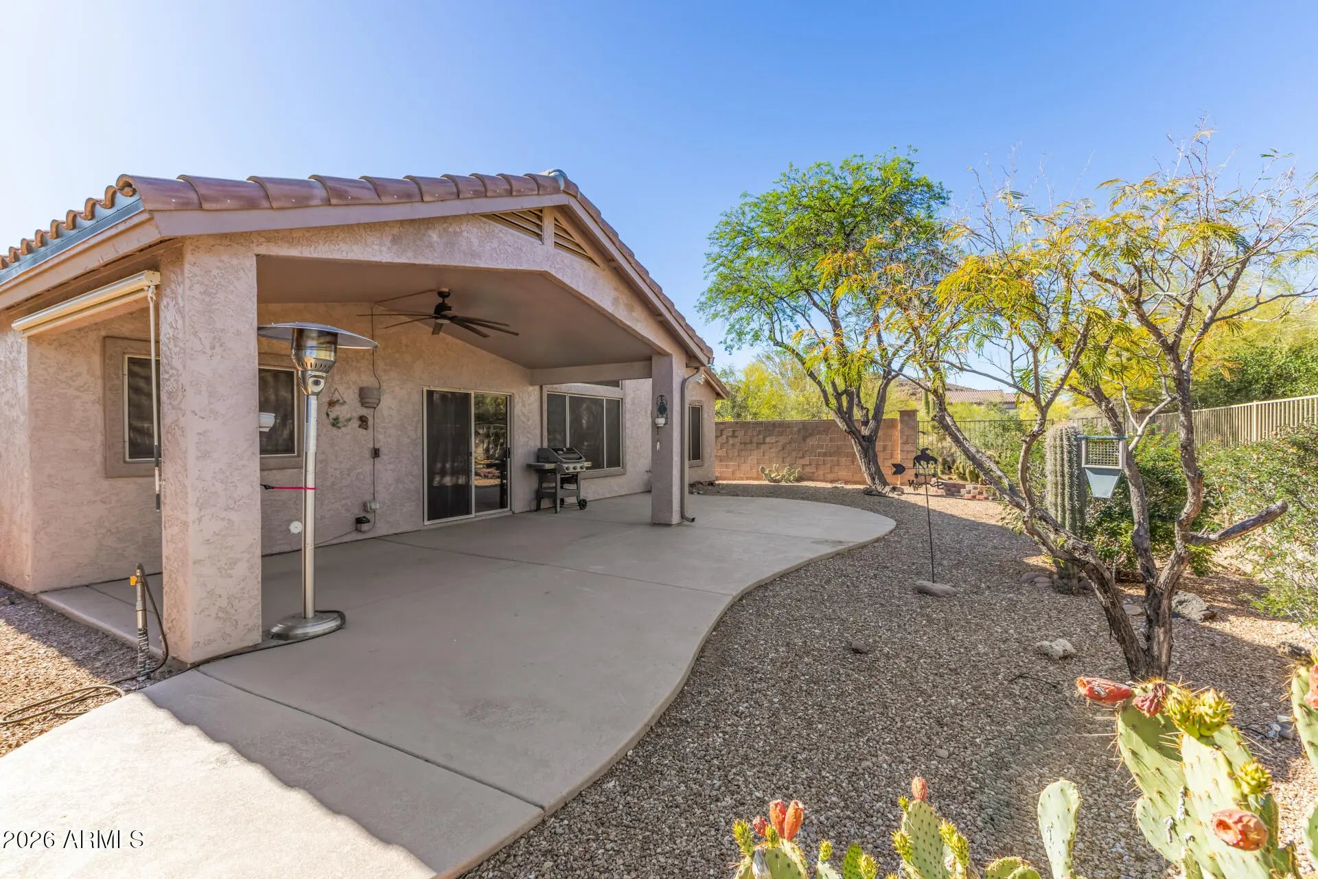 Mountain Views & Versatile Living in Superstition Foothills Nestled in a quiet cul-de-sac, this move-in-ready single-level home offers the perfect blend of comfort and flexibility. Featuring 3 bedrooms INCLUDING an open den, the standout feature is a separate bonus room off the garage--ideal for a home business, hobby space, or guest quarters. Interior Highlights: Chef's Kitchen: Bright white cabinets and a gas range. Dual Living Spaces: Separate living and family rooms, featuring a cozy gas fireplace. Easy Maintenance: Stylish tile throughout with carpet only in the bedrooms. Step outside to an extended covered patio designed for entertaining. Enjoy the ''view fencing'' that looks out over the open desert and the stunning Superstitions. Includes a direct-line gas grill that's never been used and is essentially new! Winters are much warmer with the direct gas line patio heater too! Updated master bath with granite & double sinks, a separate soaking tub, and a standalone shower. Spacious walk-in closet as well.