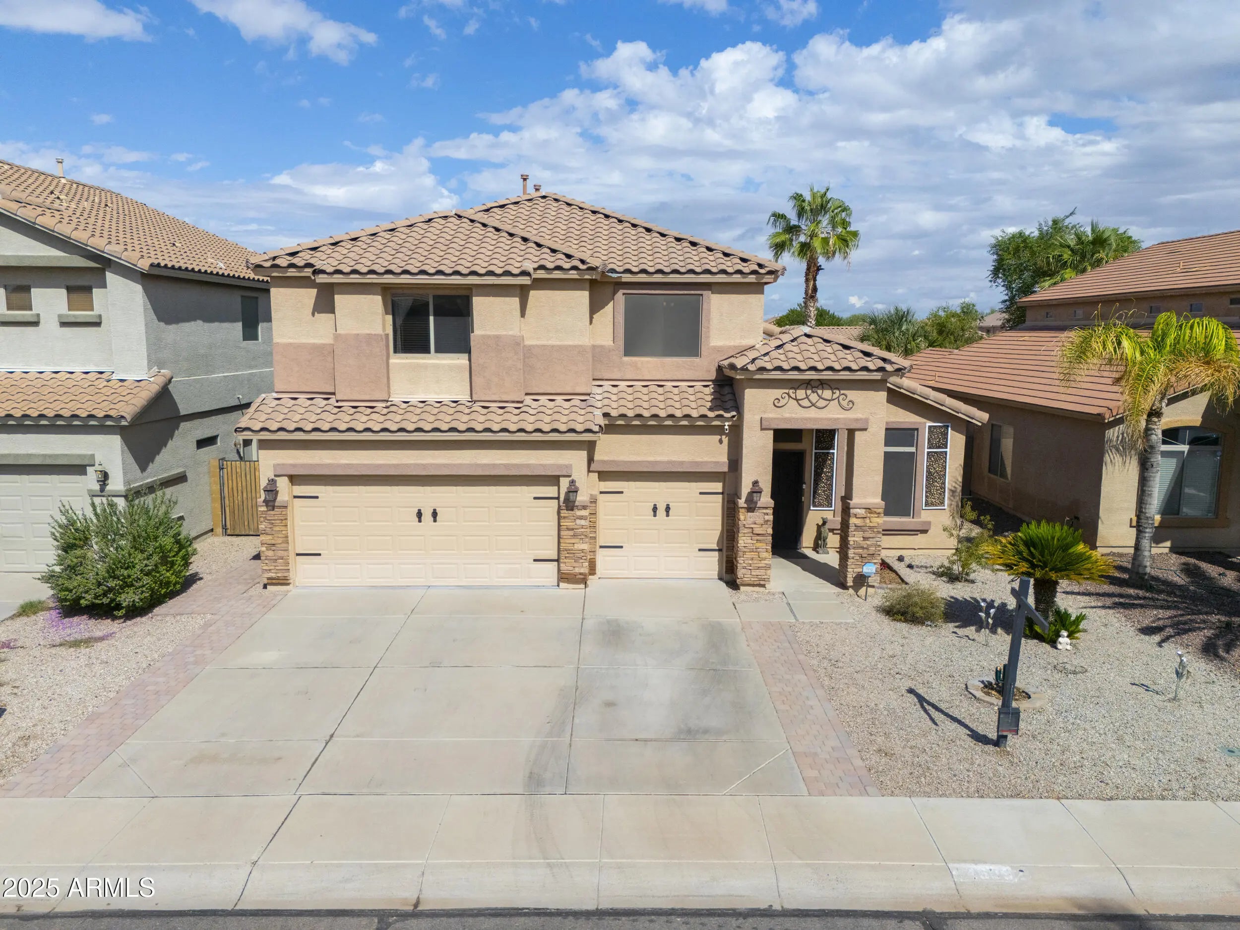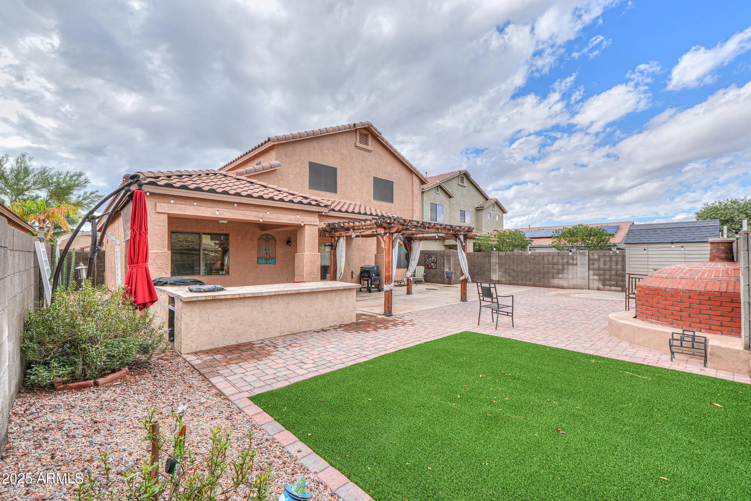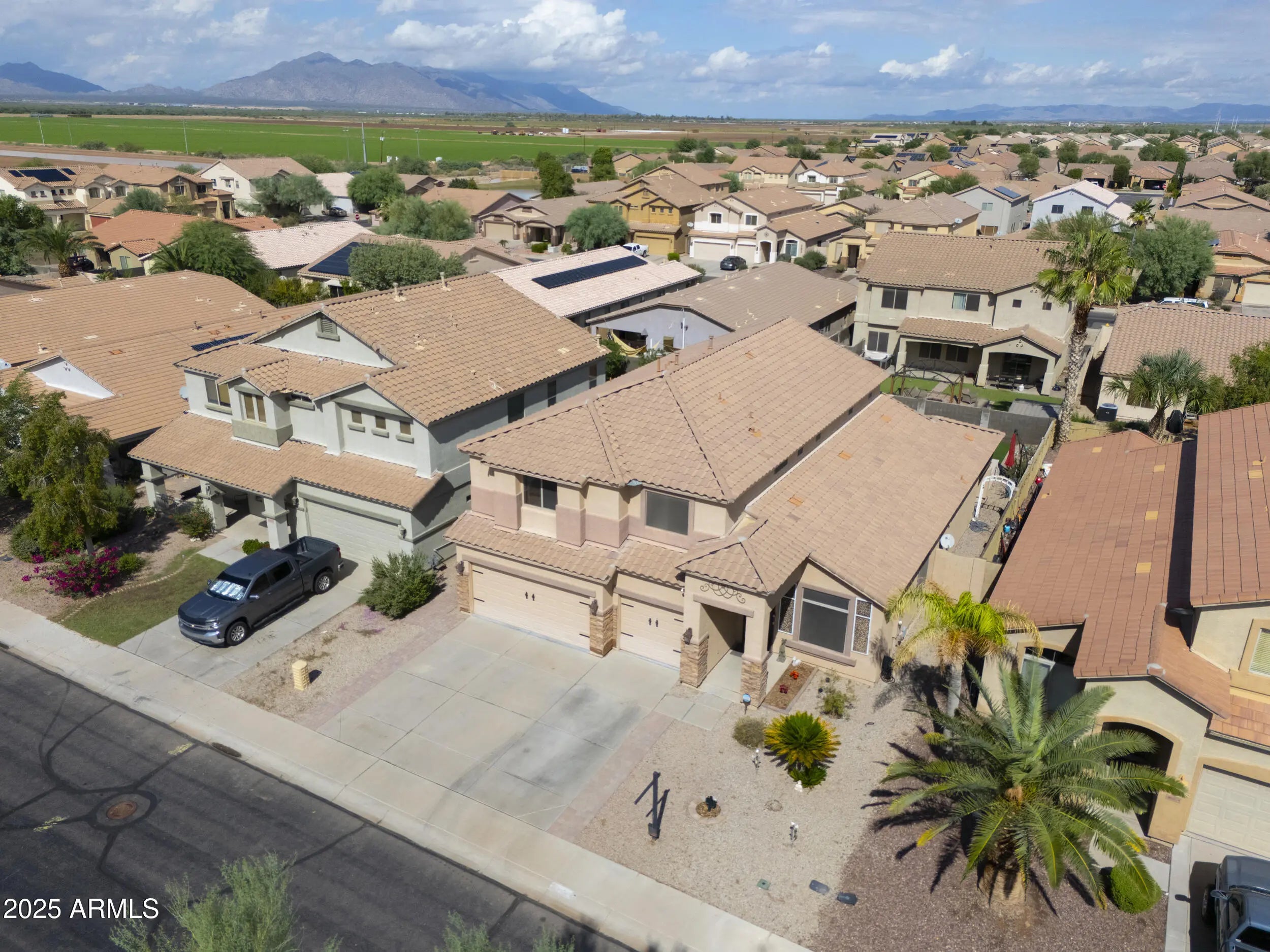 3 CAR GARAGE! This gorgeous & expansive home shows true pride of ownership & boasts an entertainer's floorplan with 6 spacious beds with walkin closets, 3.5 baths (including second master), formal living/dining room & large great room! Upgrades abound & include vaulted ceilings, designer paint throughout, wood laminate flooring in all the right places & more! Chef's kitchen features Grey cabinetry, granite countertops, SS appliances, double ovens & dining nook! Palatial master bedroom boasts walk-in closet & ensuite bath with dual sinks & separate shower & soakin! Backyard oasis with full covered patio, pergola, outdoor kitchen, artificial turf & pizza oven! Located in one of Maricopa's premier subdivisions- Maricopa Meadows- with expansive lake, tot lots & close to schools & shopping!
