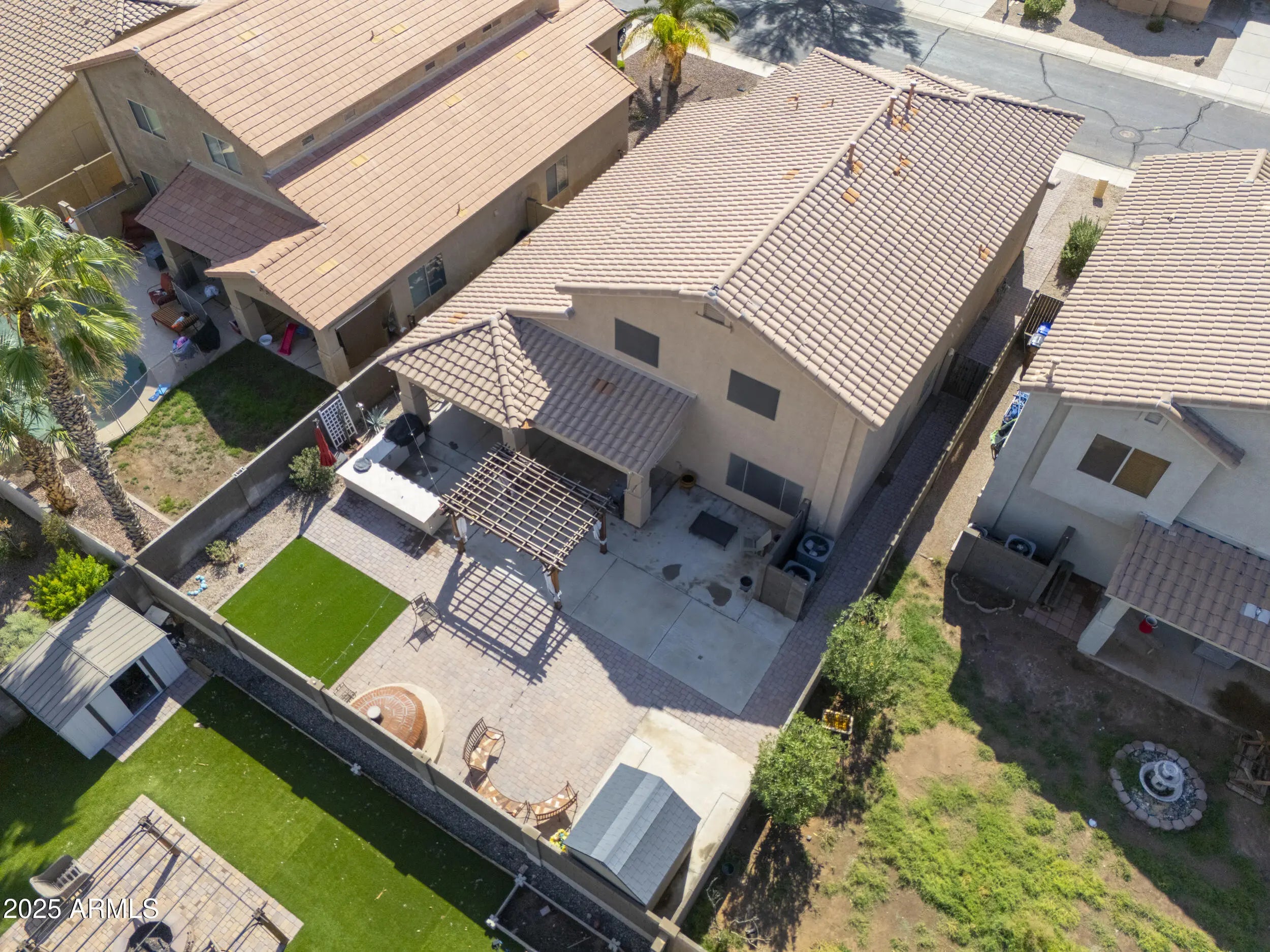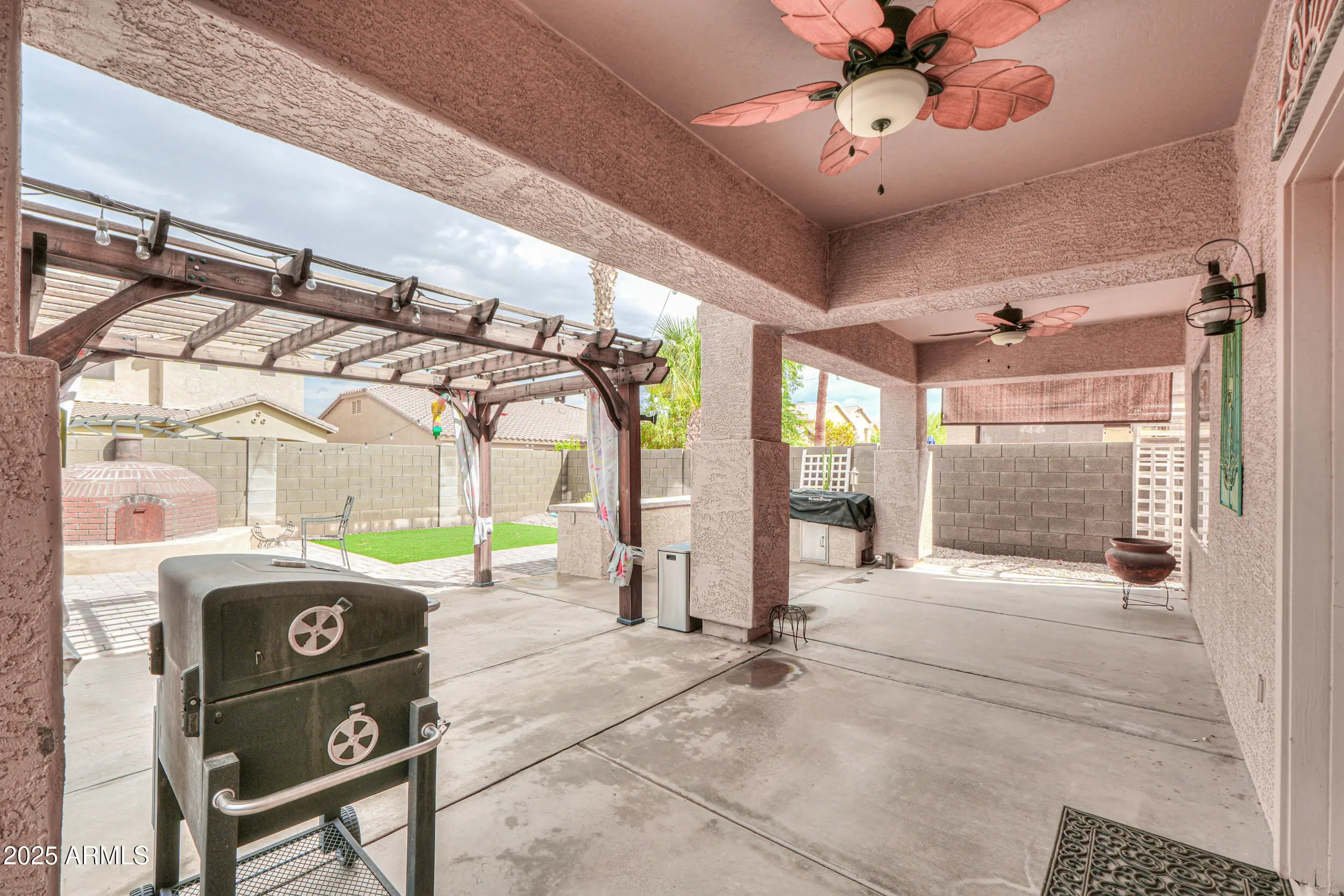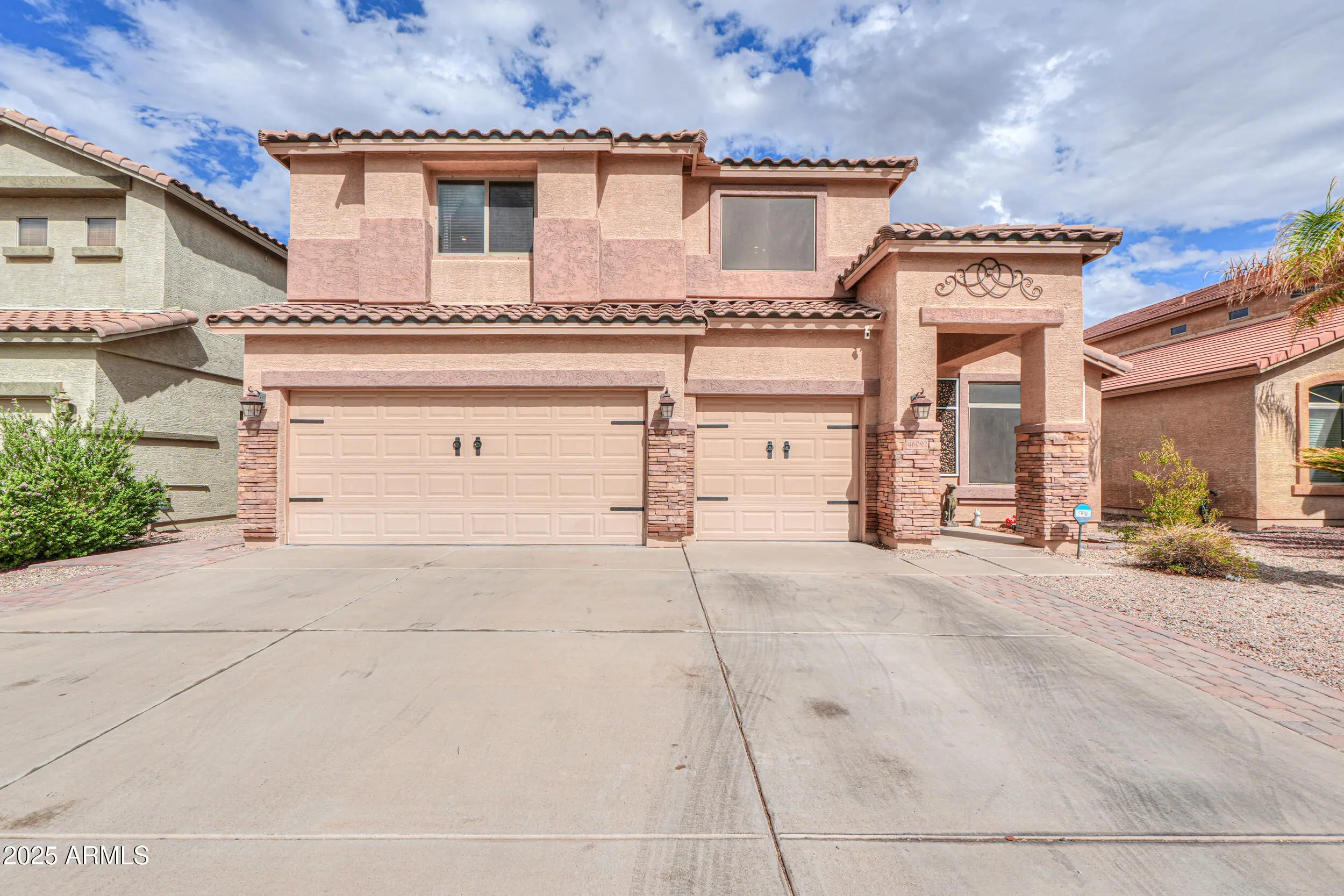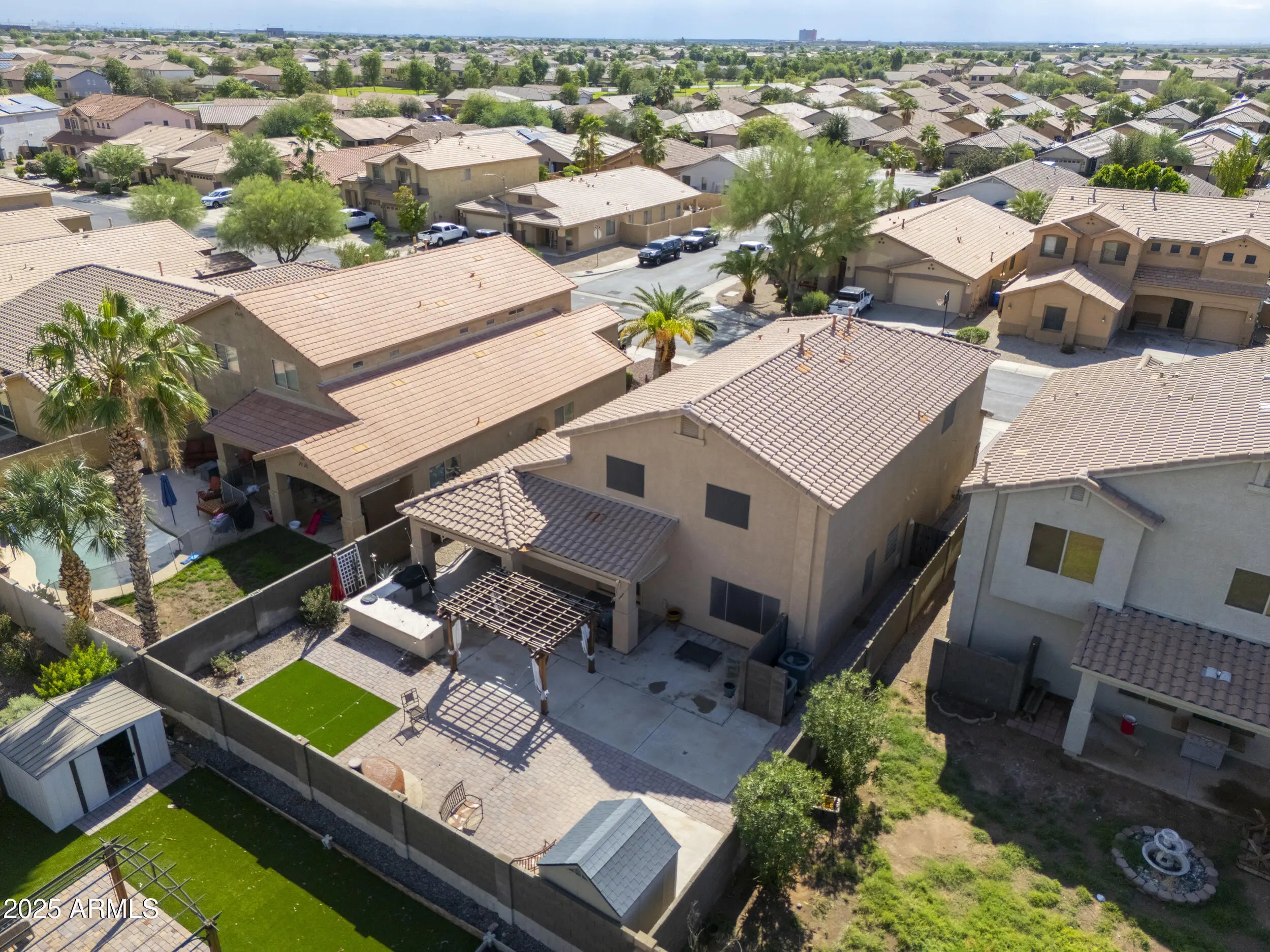 3 CAR GARAGE! This gorgeous & expansive home shows true pride of ownership & boasts an entertainer's floorplan with 6 spacious beds with walkin closets, 3.5 baths (including second master), formal living/dining room & large great room! Upgrades abound & include vaulted ceilings, designer paint throughout, wood laminate flooring in all the right places & more! Chef's kitchen features Grey cabinetry, granite countertops, SS appliances, double ovens & dining nook! Palatial master bedroom boasts walk-in closet & ensuite bath with dual sinks & separate shower & soakin! Backyard oasis with full covered patio, pergola, outdoor kitchen, artificial turf & pizza oven! Located in one of Maricopa's premier subdivisions- Maricopa Meadows- with expansive lake, tot lots & close to schools & shopping!