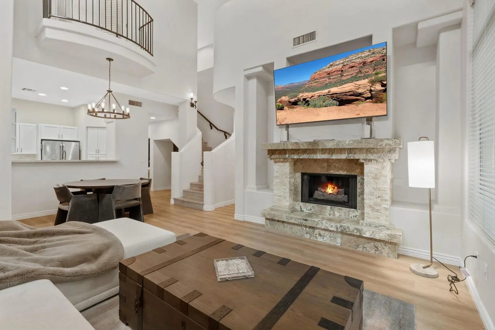 Welcome to your Scottsdale retreatwhere privacy, style, and convenience meet. Behind a gated entry, this beautiful home features a lush courtyard and a serene backyard escape. The kitchen showcases honed quartzite countertops, a limestone backsplash, and newer appliances. The great room impresses with soaring 20+ ft ceilings, a natural stone gas fireplace, built-in surround sound, and a custom shade over the slider. Upstairs, enjoy a spacious loft with a private balcony. The primary suite offers granite finishes, a travertine shower, and shutters. Additional highlights include epoxy garage floors, custom built-ins, and designer touches throughout. Perfectly located near TPC, Barrett-Jackson, the Arabian Horse Show, golf, dining, hiking, and freeway access.