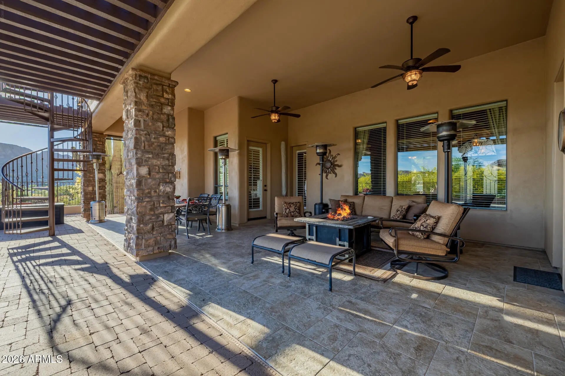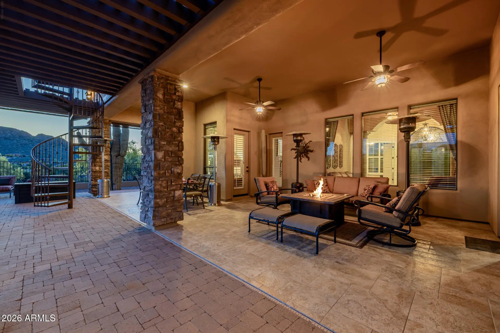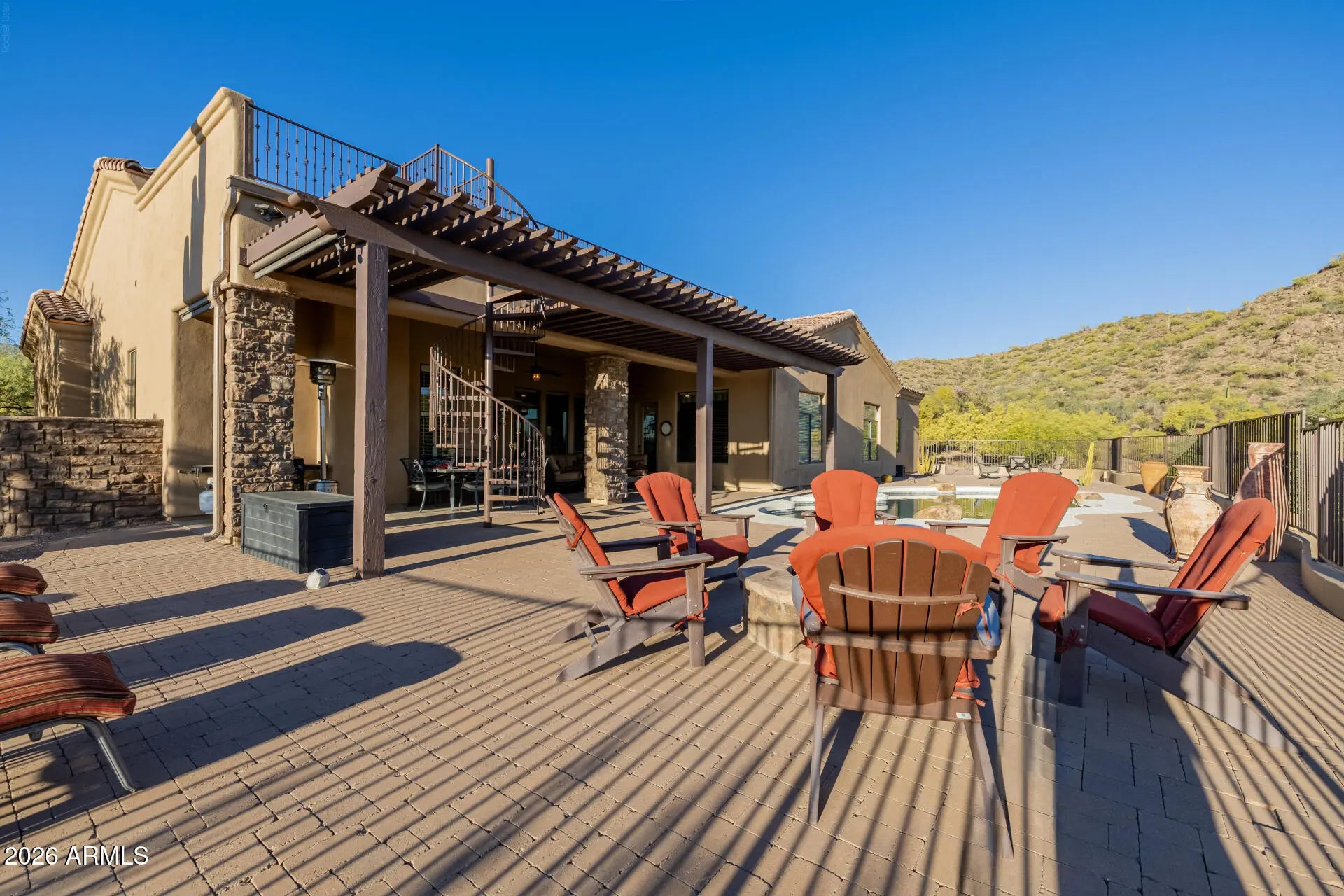 A RARE gem in the exclusive gated Community of Pasion! Perfectly positioned on a spacious lot of a cul-de-sac, this gorgeous home captures breathtaking mountain views that become a daily backdrop to life's finest moments. From the moment of arrival, the property makes a lasting impression with its striking curb appeal with stone-accented detailing, paver driveway & pathways, and a welcoming front patio framed by mature desert landscaping. Inside, every element reflects a commitment to craftsmanship and thoughtful design! Enhanced by a wrought iron double door entry, high ceilings, abundant natural light, stylish light fixtures, a warm neutral palette, a barrel-vaulted hallway ceiling, travertine tile flooring in common areas, and wood flooring in bedrooms. Thoughtfully designed floor plan! Showcasing a formal dining room w/exposed beams, a separate living room w/Cantera columns, and an inviting family room w/stacked-stone fireplace & surround sound. The gourmet kitchen boasts high-end SS appliances w/cooktop gas, granite counters, a walk-in pantry, travertine tile backsplash, recessed lighting, a center island, a pot filler faucet, wood staggered cabinetry w/crown molding, and a peninsula w/breakfast bar. The large main bedroom has a fireplace & outdoor access! Its spa-like ensuite features two vanities, a soaking tub, a travertine tile shower, and a walk-in closet. Beyond the interiors, the backyard reveals a true resort-style sanctuary with unobstructed mountain views in every angle! Enjoy elevated perspectives from the observation deck, unwind beneath the covered patio, or gather around the fire pit on beautifully laid pavers. A sparkling pool completes the experience, creating a private oasis where relaxation and entertaining come naturally. What's not to like? Your DREAM home is here!