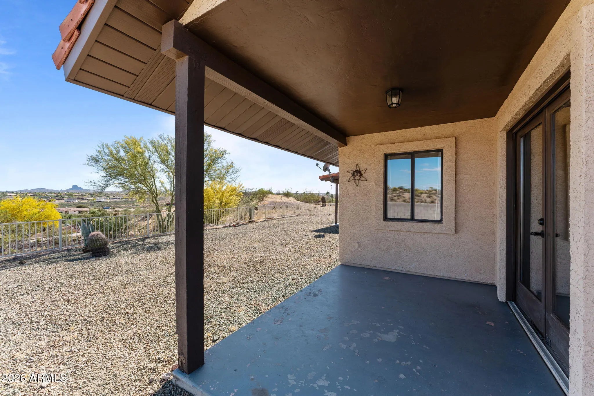Enjoy stunning views of Vulture Peak from this hilltop home. 3BD, 2.5BA, 1.6 acres of horse property! Perfect as a second home, this property features easy-care landscaping and a fully fenced backyard ready for pets. Nicely updated with paint inside and out just a couple of years ago, stainless appliances, wood-look tile in high-traffic areas and carpet in two bedrooms. The inviting family room showcases a beautiful fireplace as its focal point. Relax under the fully covered back patio and take advantage of the 2-car garage. Includes a 1/3 interest in a shared well and a convenient in-town location. You'll be ready for next season in this gem!