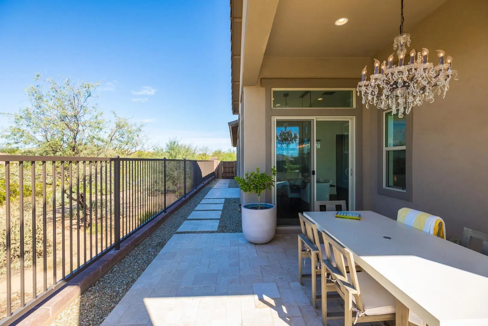 Luxury living at it's finest! This 3 bedroom + den, 3 bath is located in the gated community of Paseo at Pinnacle Peak. Open and light floor plan. Gorgeous is the theme as you move room to room. Stainless appliances, gas stove, split floorplan, 2 car garage, front loader washer/dryer, chandeliers sparkle each room, remote/auto open and close blinds through out. Natural desert wash surrounds over half the yard. Pack your bags and move right in!