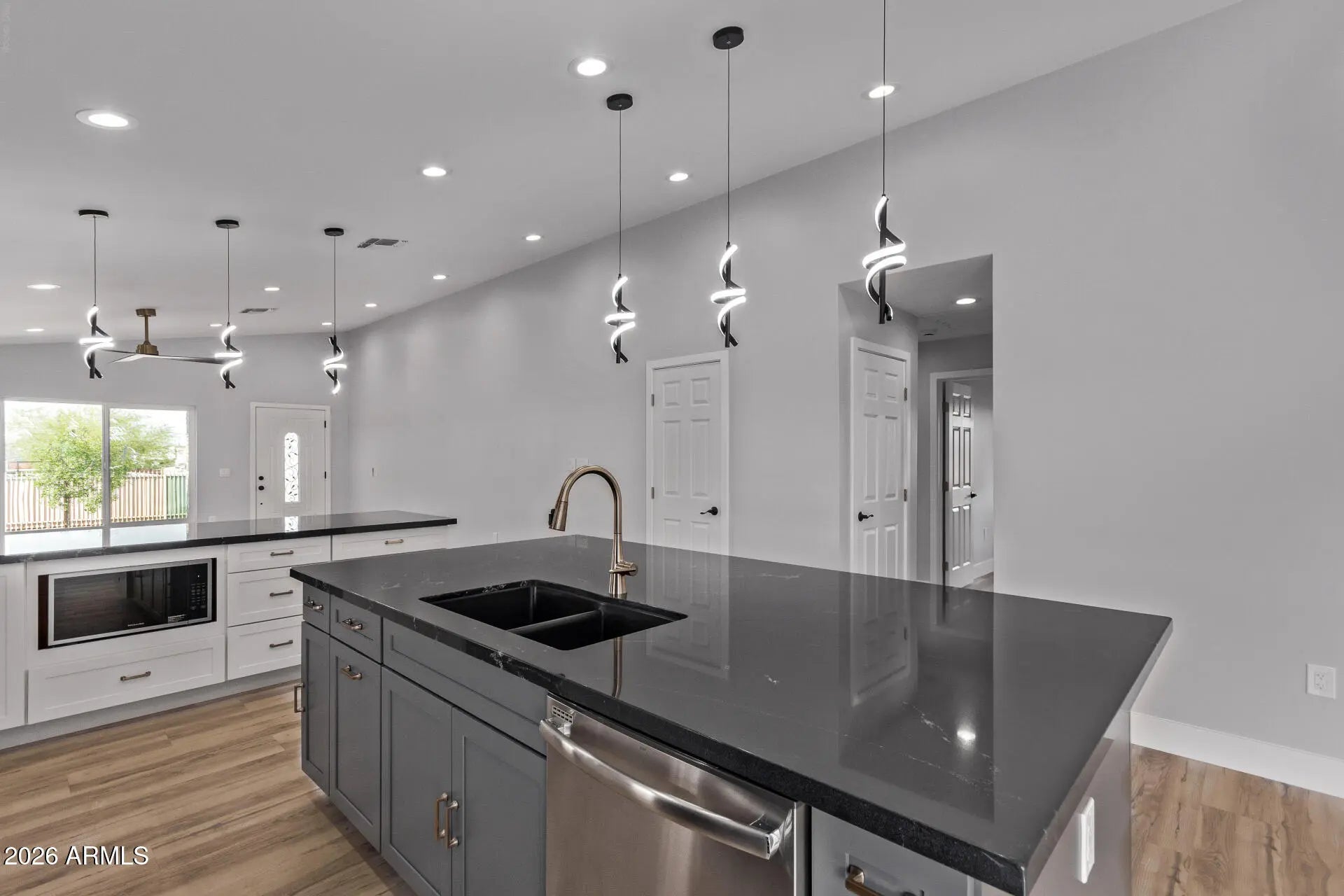 Home, sweet home! Nestled on a corner lot with an elevated terrain, this beautiful 2024-built residence exudes modern elegance and charm. Offering 4 beds, 3 baths, and a 2-car garage. Great curb appeal is highlighted by brick accent details and a low-care front yard w/artificial turf. The fabulous interior features tons of natural light, modern light fixtures, vaulted ceilings, and wood-look flooring throughout. You'll love the open-concept layout where the gourmet kitchen stands at the heart of the home, perfectly positioned between the inviting family and living areas! This design ensures that entertaining is a breeze. High-end SS appliances, sleek quartz counters, two-tone shaker cabinetry, designer tile backsplash, and a huge island w/breakfast bar make up the culinary space.
