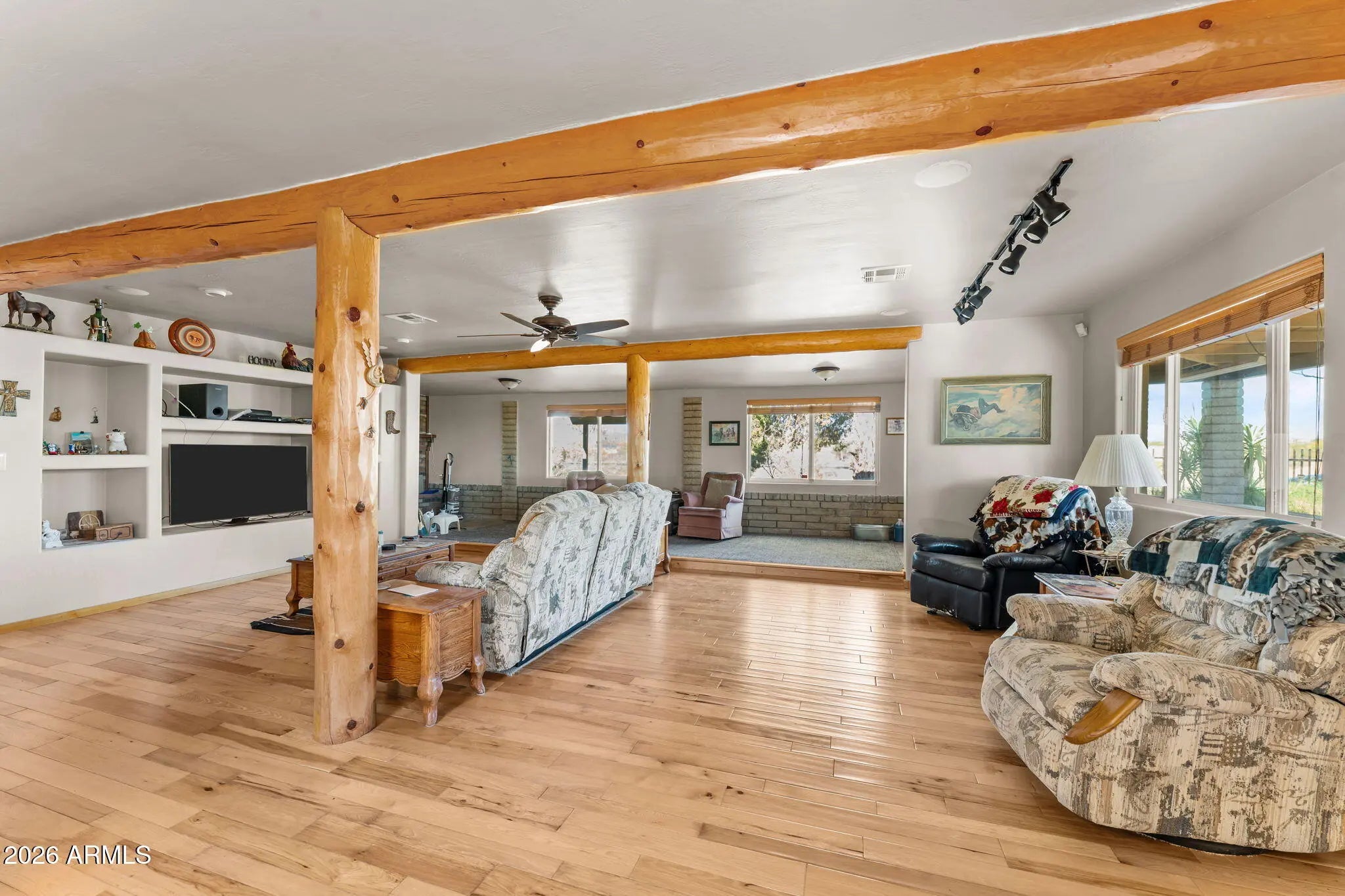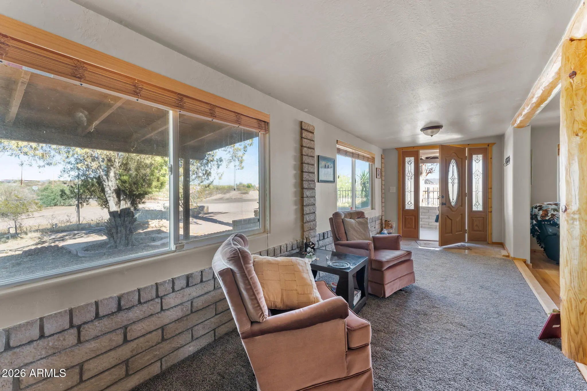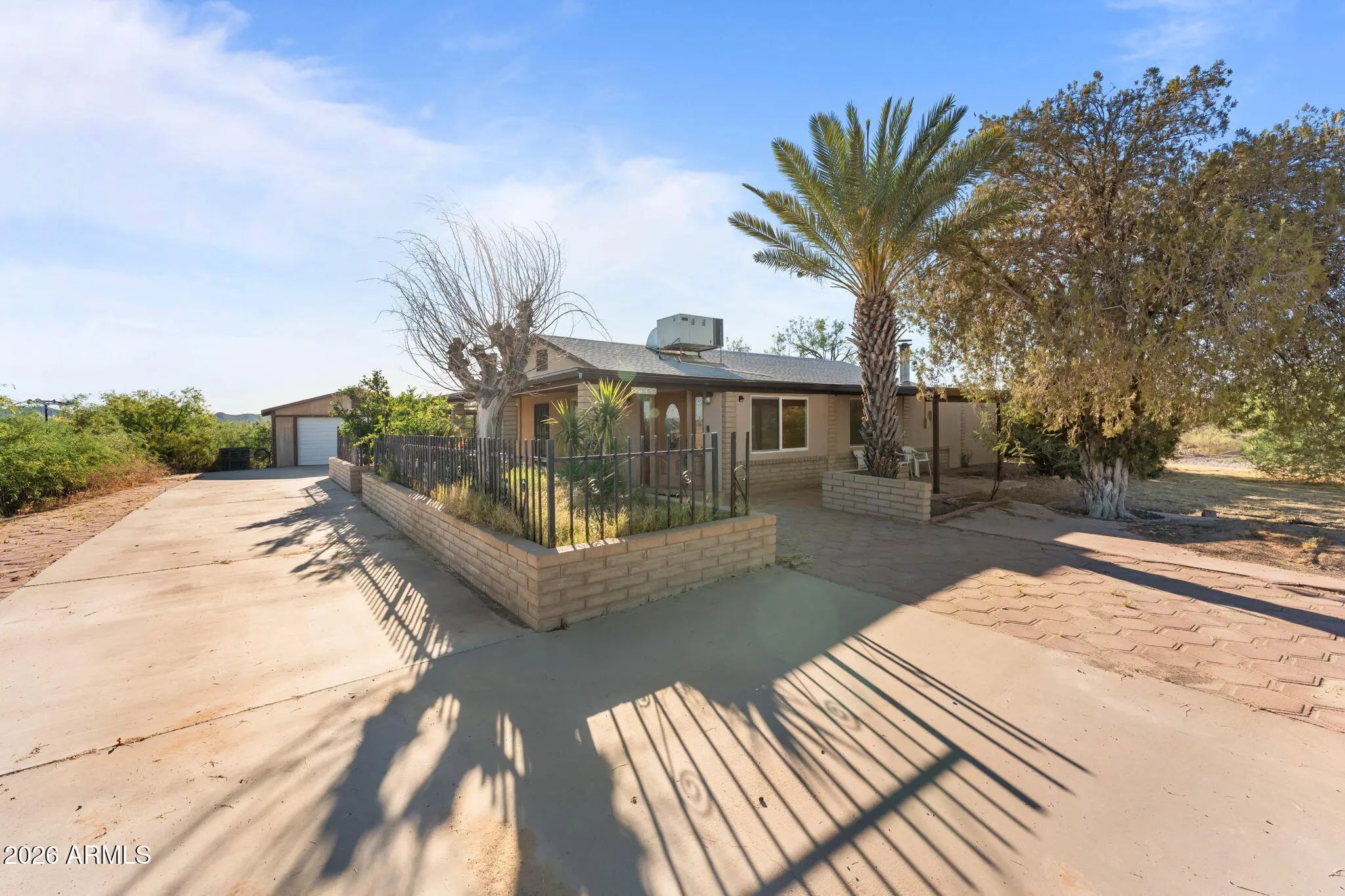 Situated in Morristown, this charming slump block home offers 4-bedrooms, 3-baths and 1,998 sq. ft. of comfortable living space on a spacious 0.9-acre lot. The property features owned solar for energy efficiency and long-term savings. Inside, you'll find thoughtful upgrades throughout, including an updated kitchen, modernized plumbing, and refreshed flooring. A cozy fireplace and beamed ceilings add warmth and character to the main living area, creating an inviting space to relax or entertain. The outdoor setting is equally appealing, with mature pomegranate, orange, lemon, and lime trees providing both shade and a touch of charm. The expansive lot also includes RV hookups, offering flexibility for guests, travel, or additional storage. There is a 2-car detached garage and numerous slab parking spaces! This property combines functionality, upgrades, and space, ideal for those seeking a quiet desert lifestyle with room to grow.