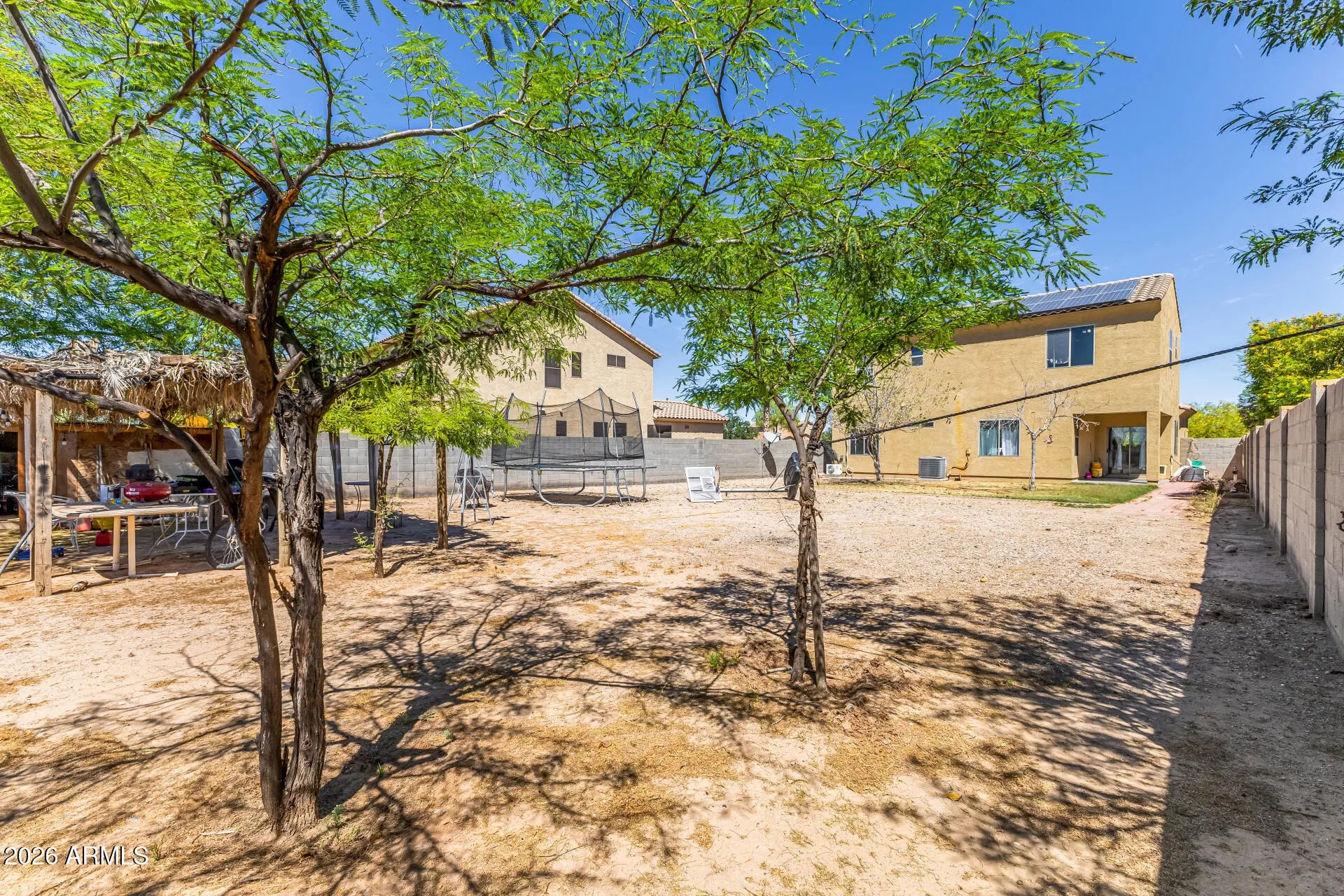 Don't miss this charming, spacious two-story home in Santa Rosa Springs! No neighbors behind! Offering 5 beds, 3 baths, & a 2-car garage. The inviting interior features designer paint, tons of natural light, and tile & wood-look flooring t/out. You'll love the semi-open layout, which perfectly balances privacy & connectivity! The eat-in kitchen boasts matching appliances, ample espresso cabinetry, recessed lighting, and a 2-tier peninsula. One bedroom & one bathroom complete the downstairs. The other bedrooms await upstairs! Enter the main bedroom to find an ensuite with dual sinks & a separate tub/shower. The expansive backyard provides a lush lawn, trees, a Ramada, and a covered patio! With your creative ideas, you can make it a complete outdoor oasis. Plus SOLAR PANELS! Make this yours!